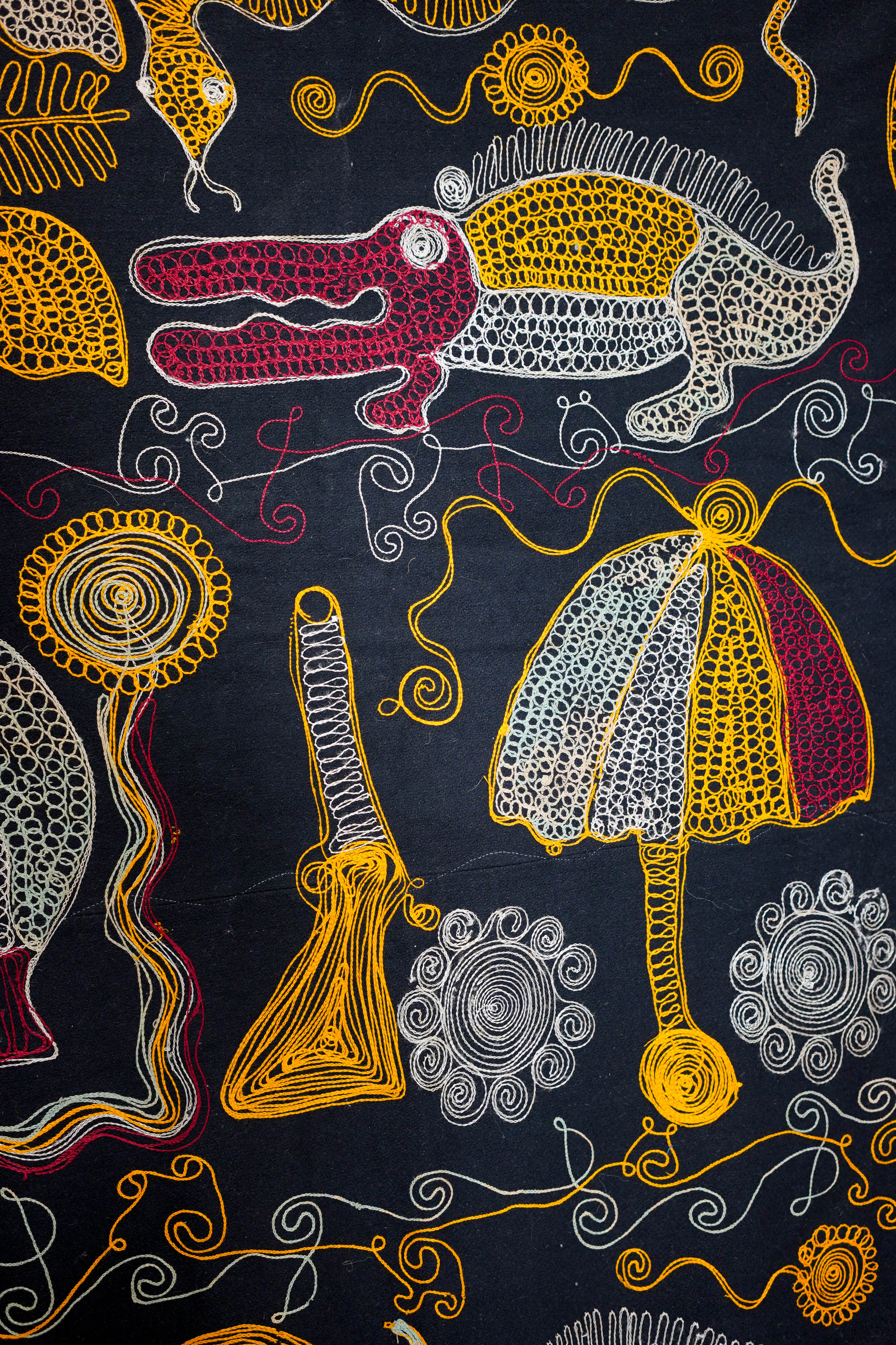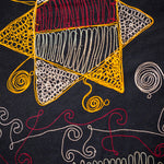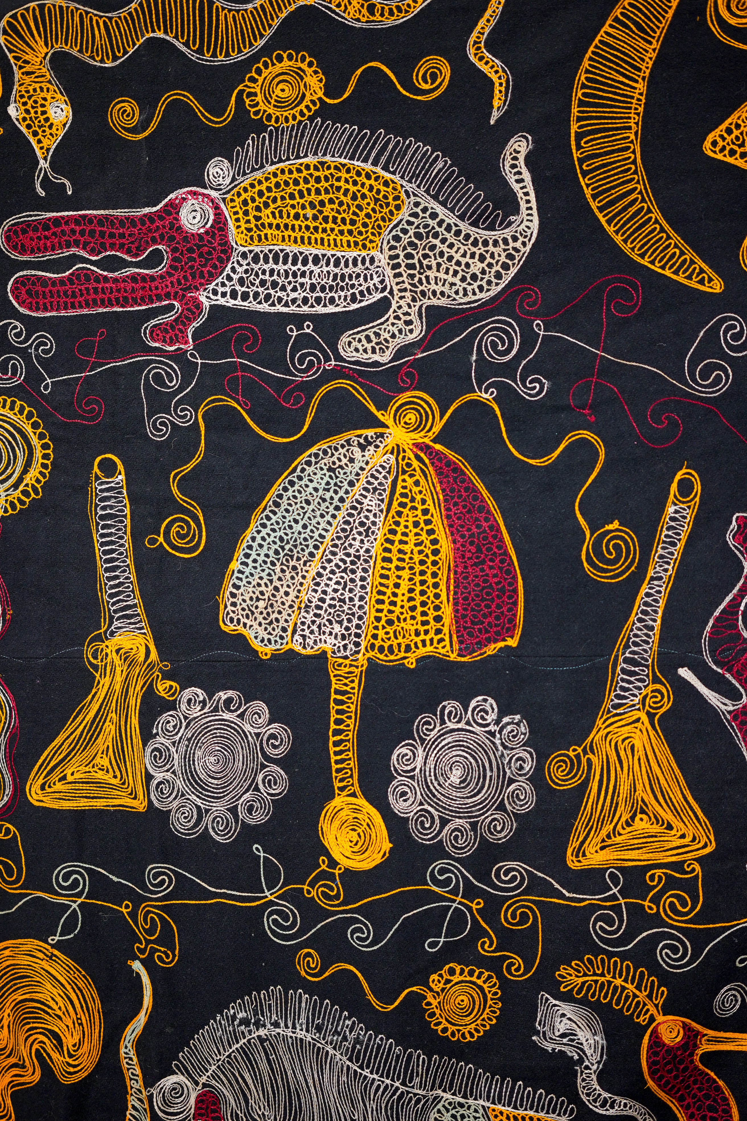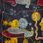 Akunitan were one of the lesser known but very striking styles of prestige male dress in mid 20th century Ghana, these dramatic motifs were machine embroidered onto imported wool cloth. Very finely made akunitan cloth with motifs that include a rooster, snake, airplane, royal stool, etc. The cloth is in excellent condition and dates to around 1960. The motifs, like much Akan art, allude to proverbs and royal imagery.