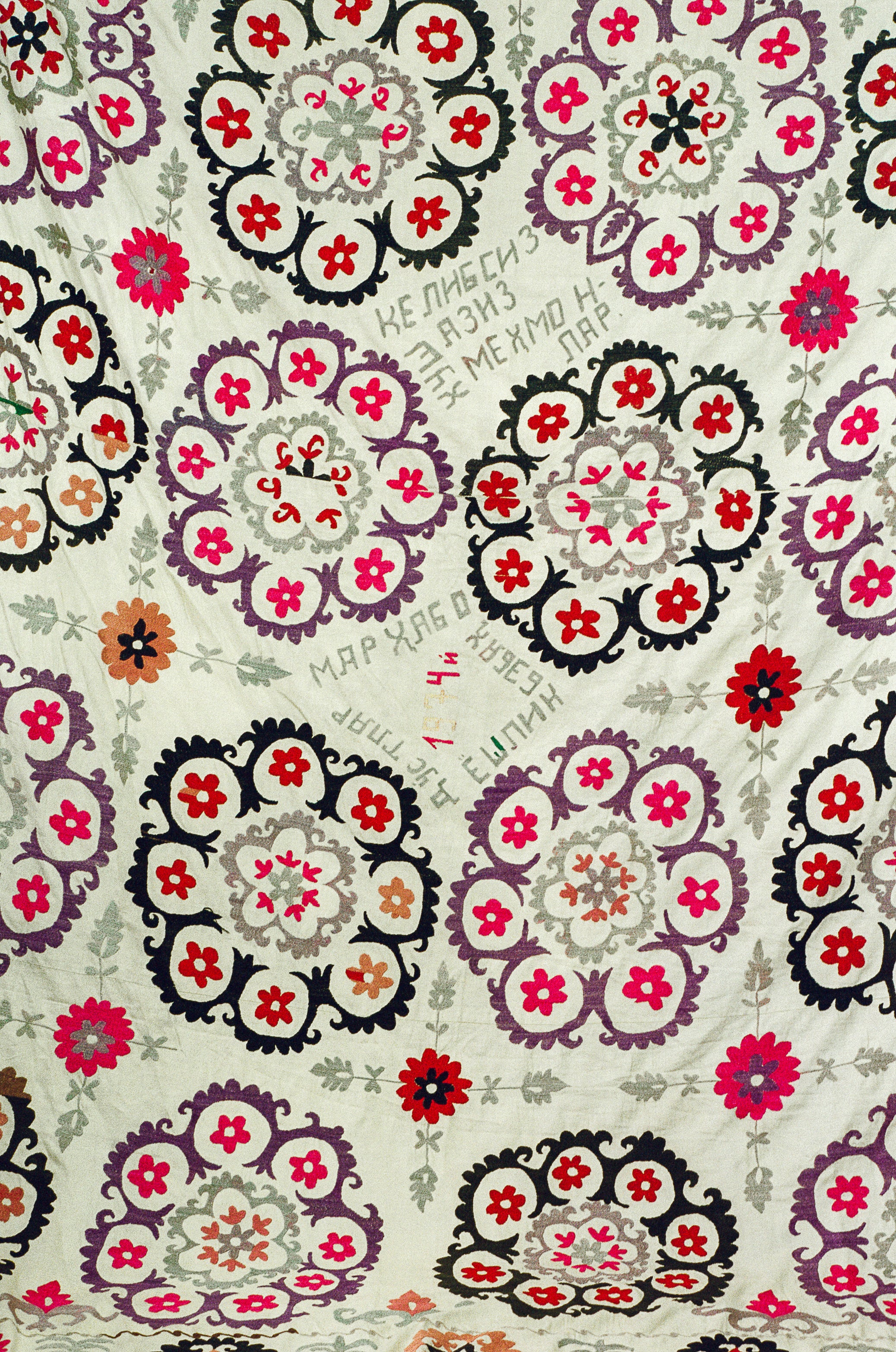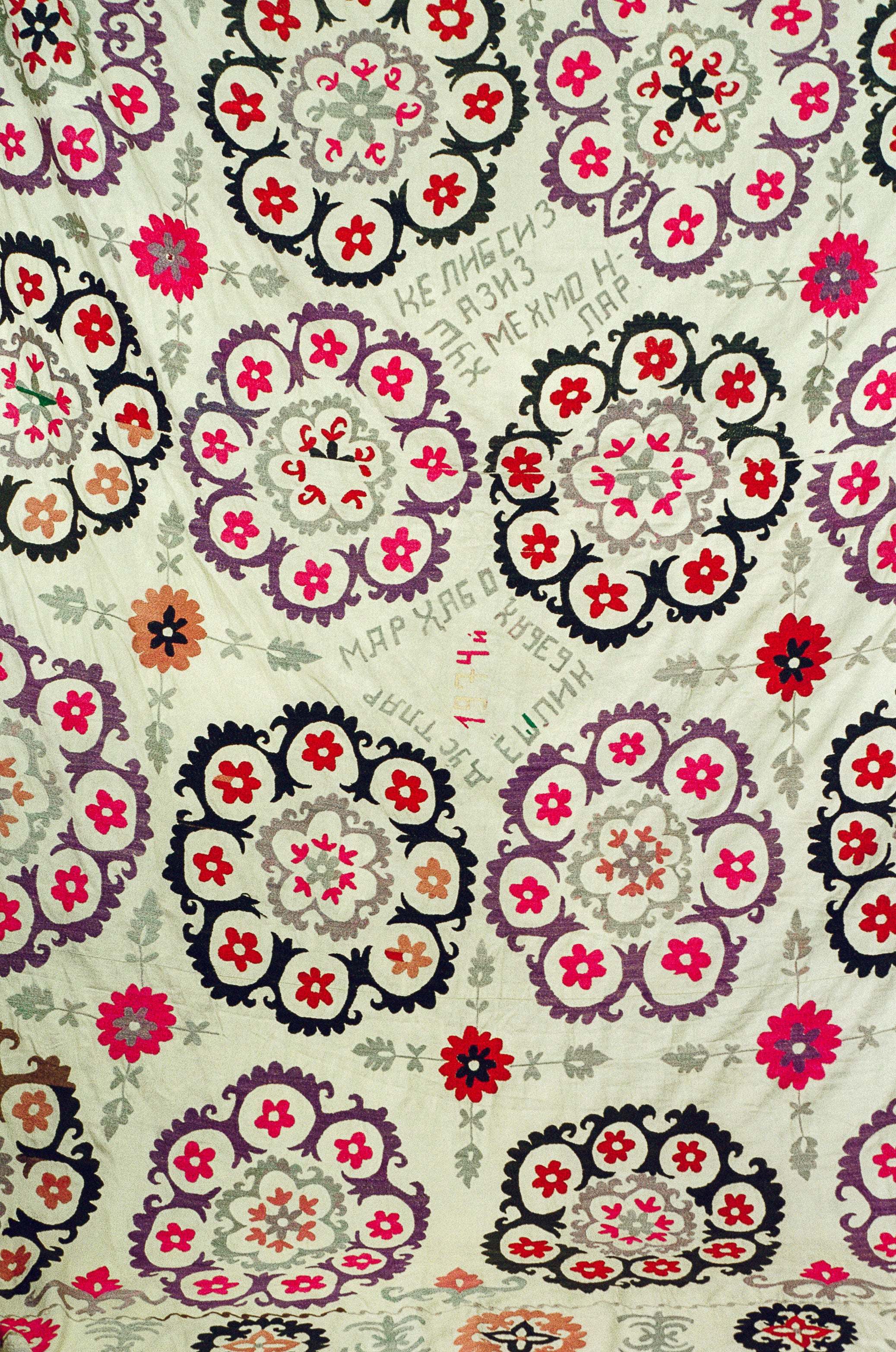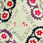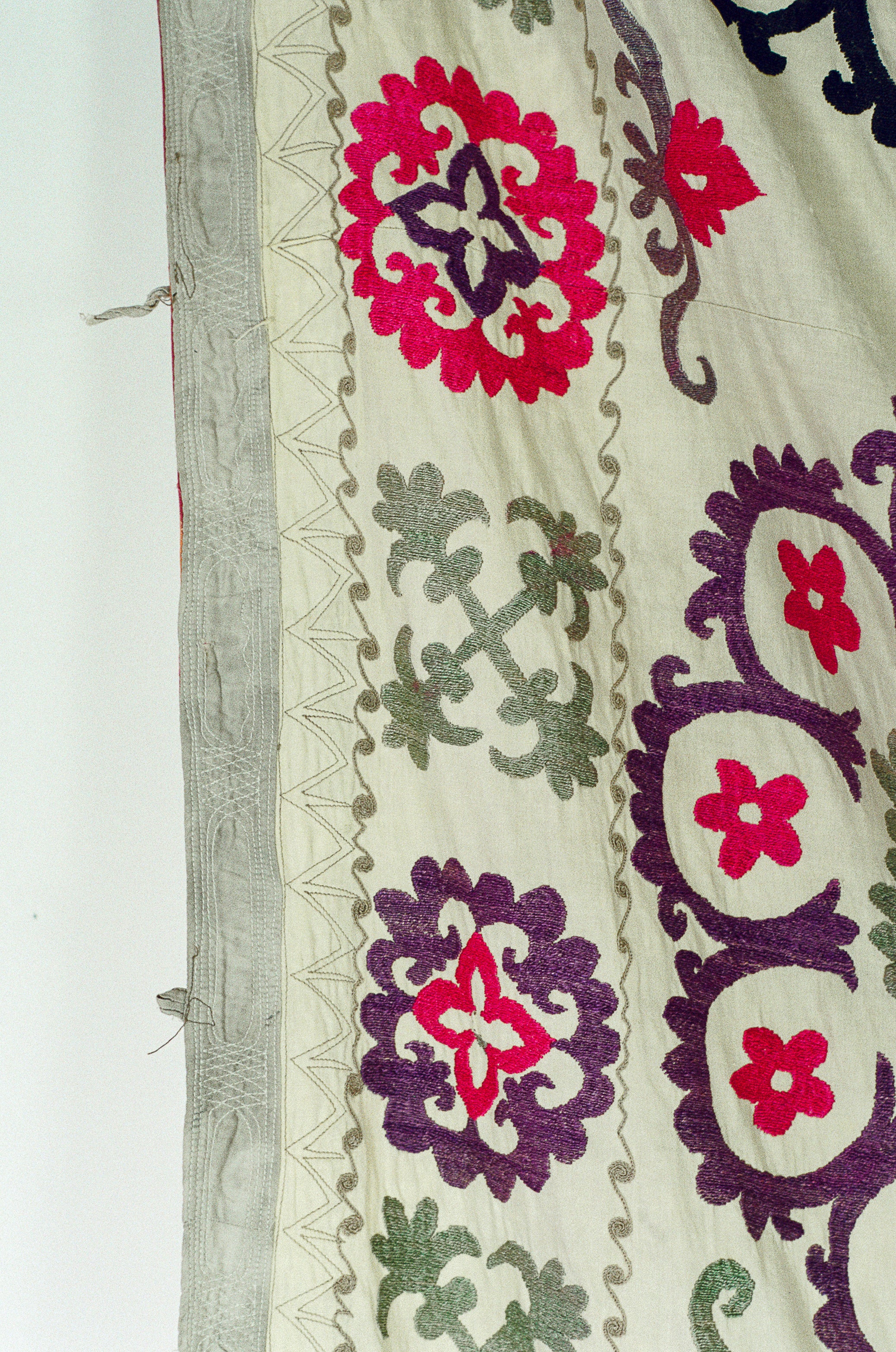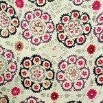 Hand embroidered silk thread on cotton Suzani from the Ishtikhan Region, featuring a repeating pattern of pink, red and lilac flowers on a cream cotton ground. Signed and dated 1974.