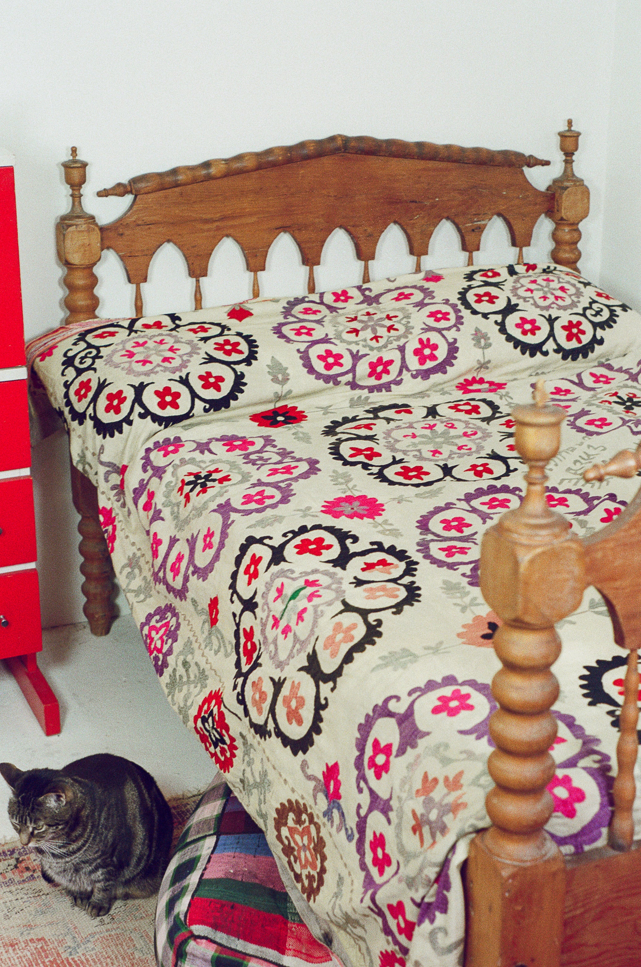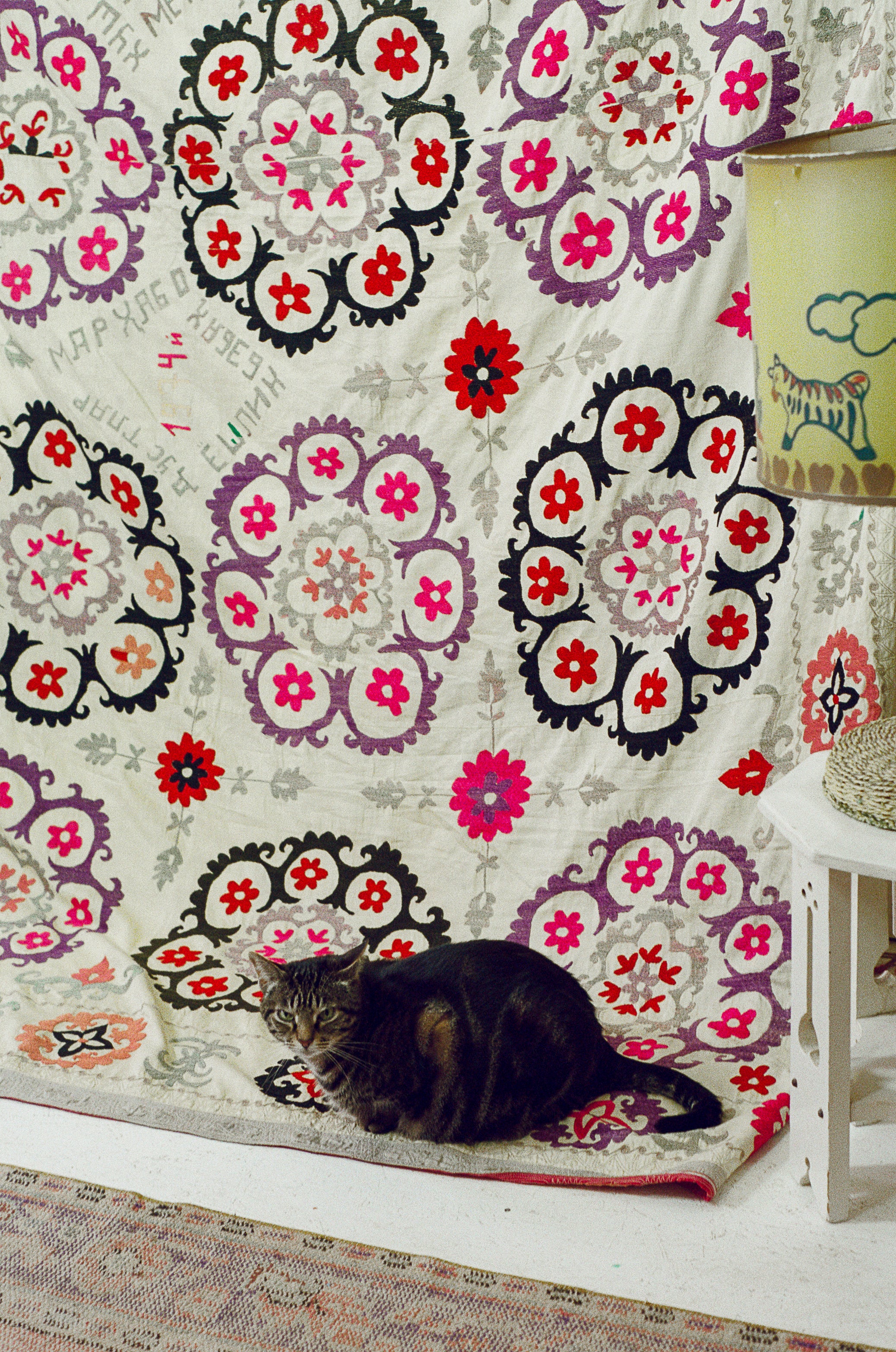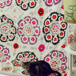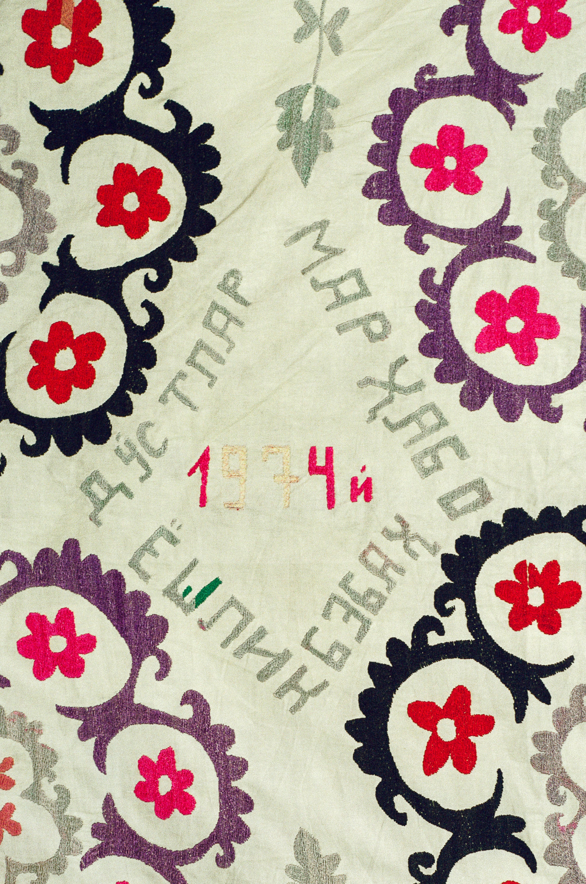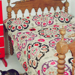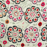 Hand embroidered silk thread on cotton Suzani from the Ishtikhan Region, featuring a repeating pattern of pink, red and lilac flowers on a cream cotton ground. Signed and dated 1974.