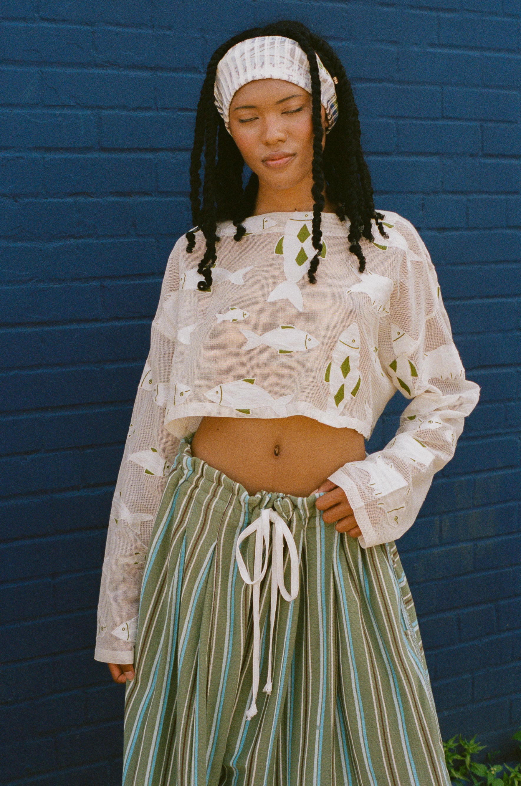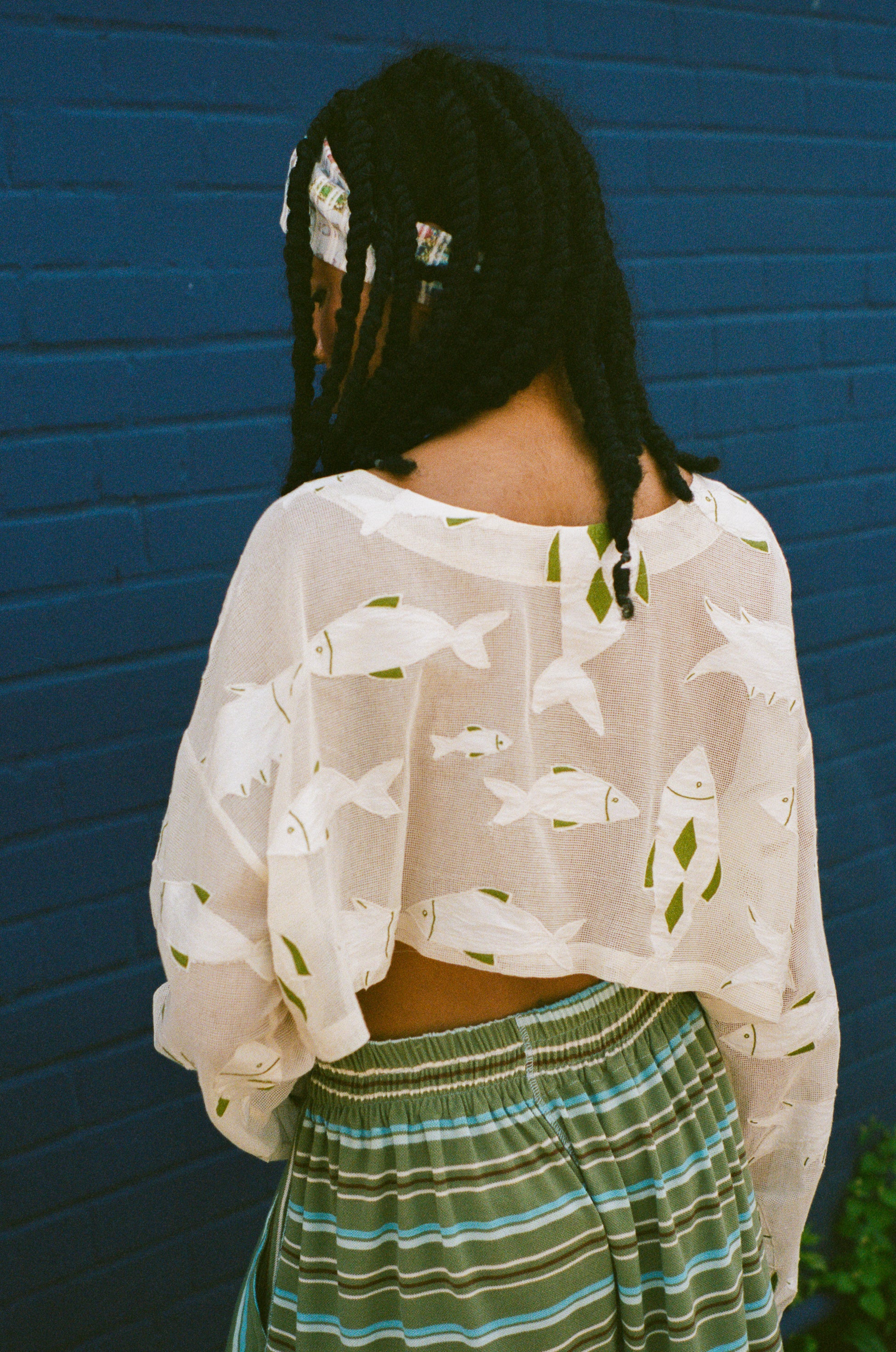 The Kulsi top is a cropped boxy pull over in ivory netted cotton and wild silk appliquéd and embroidered fish. Hand dyed. Fits oversized with elongated sleeves.