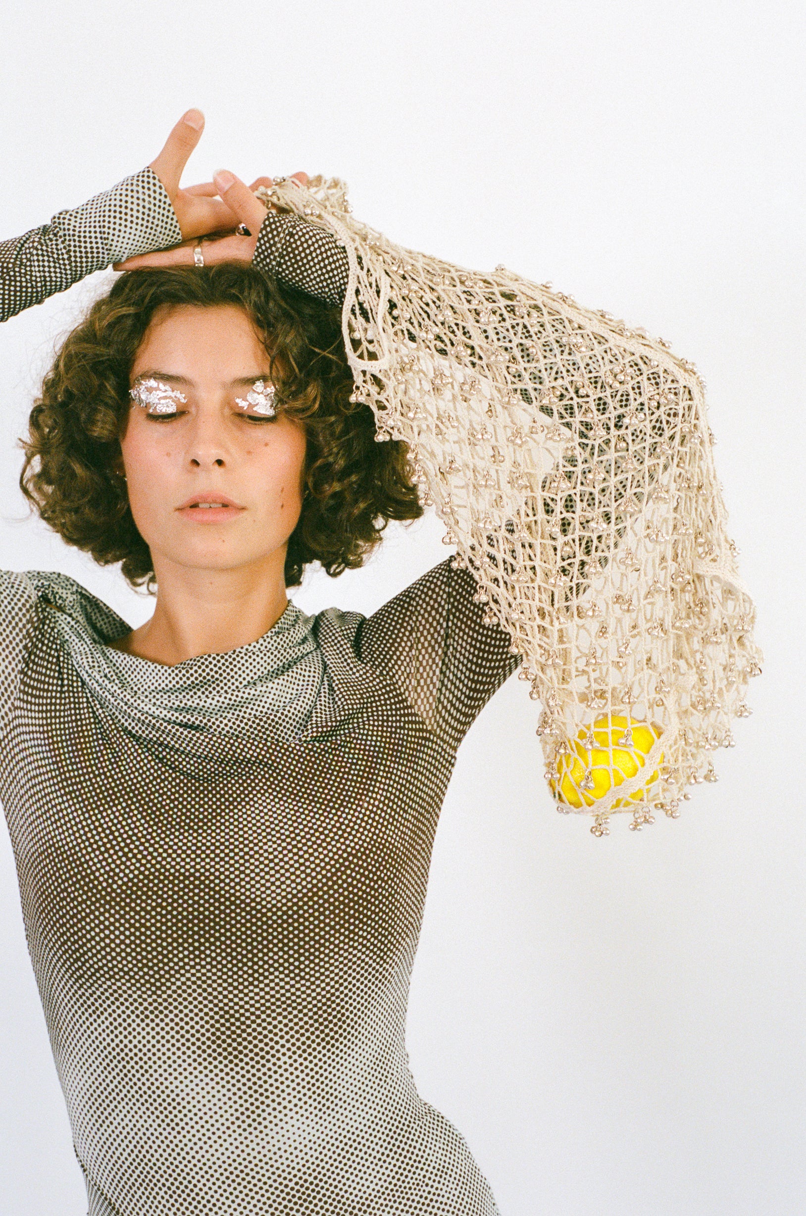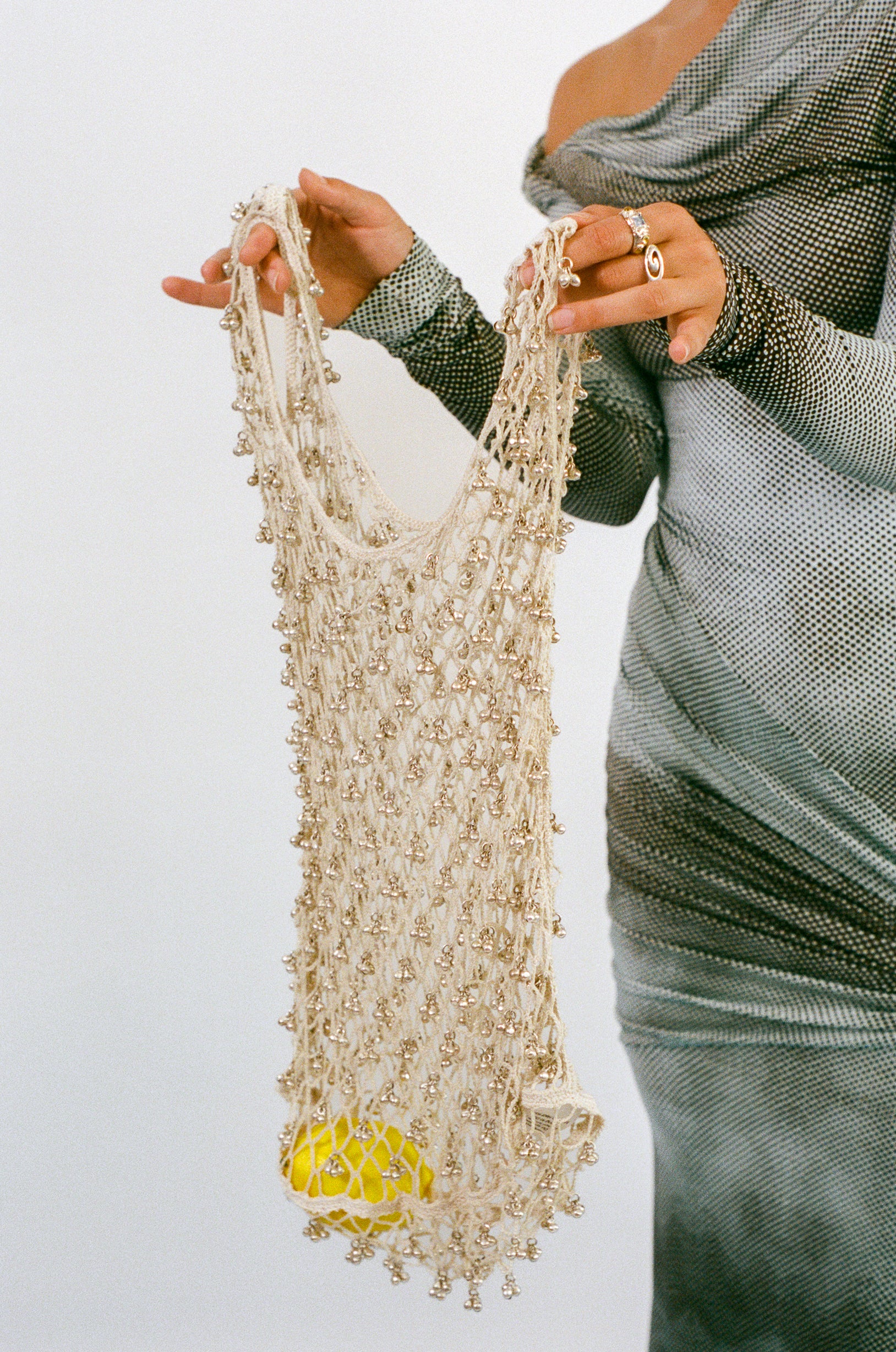 Cotton netted bag in ecru decorated with beaded bells throughout, intersecting between sound and craft to create a sensory experience when worn that enriches the aesthetic and emotional resonance of Yoshita 1967's designs. The Jhanjar Bag is hand held with a long enough body (and stretch for width) to have and hold your precious items with fashion and care.