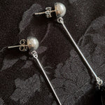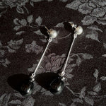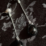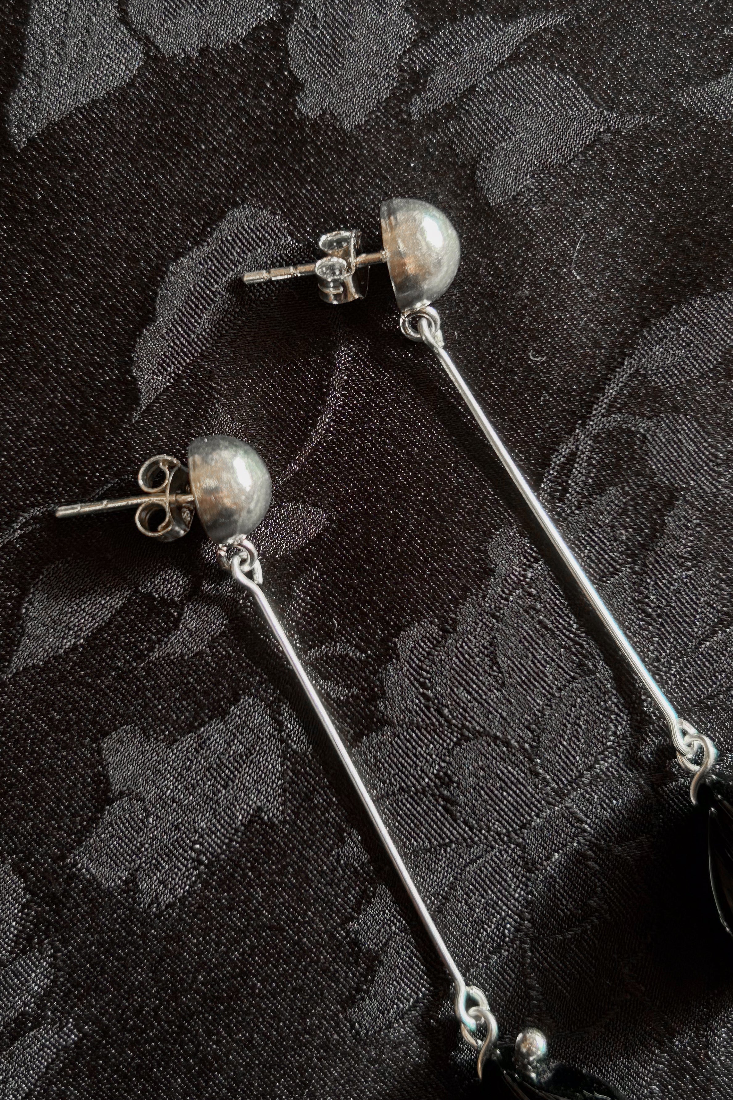 Pair of pendant earrings made with vintage Czech glass drops in black, looped through a sterling silver straight wire onto a circular silver stud. Around 2"1/4 in length. Post back closure.