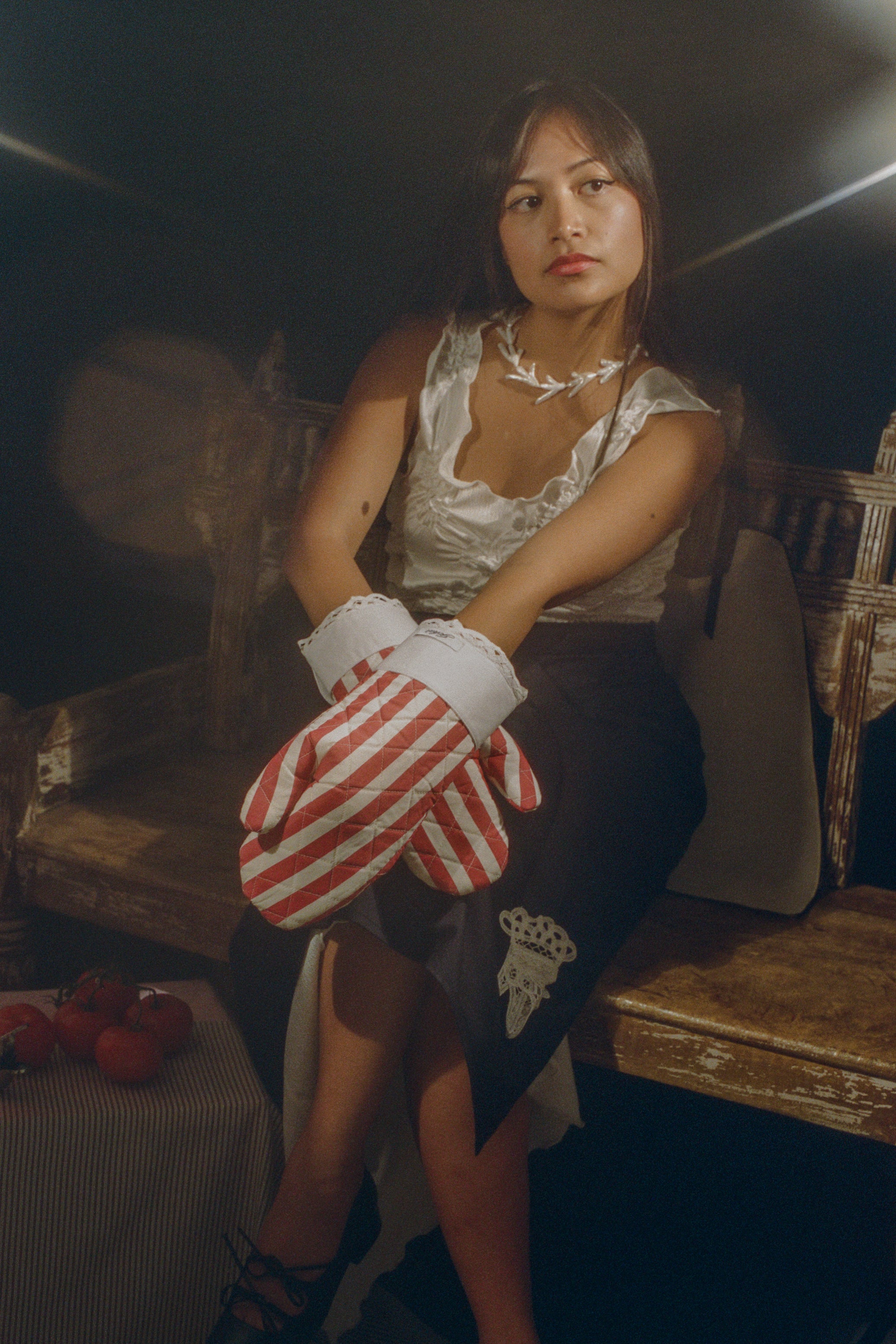 Pictured with the Shirt Tablecloth, Apron with Lace Appliqué, Hands in Navy, Host Necklace with Chicken Feet Pearls, Taper Candle with Lace Bow, Adult Bibs, Bottle Apron in Battenberg Lace, Isabel Shoe in Black Leather, Bow Knife in Mother of Pearl, Swan Spoon in Mother of Pearl, Lemon Squeezer Swan, Calla Crystal Wine Glass, and Dessert Coupe.