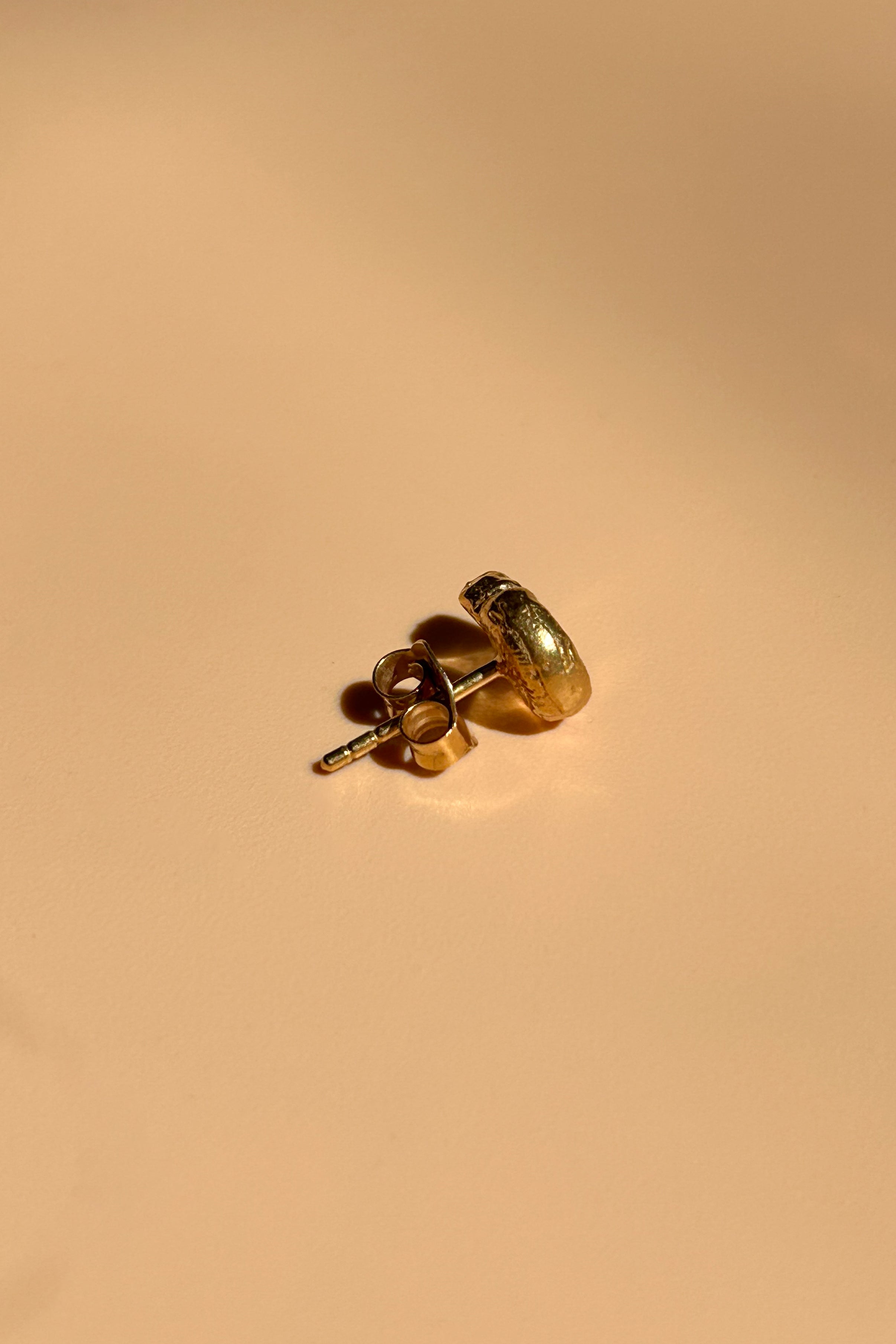 Handmade 18k gold plated stud earring in the shape of a spiral shell with a textured look and feel. Post back closure. The Ovi Earrings are sold as a singular piece, working great for layering with other jewelry or committing to two to make a pair.