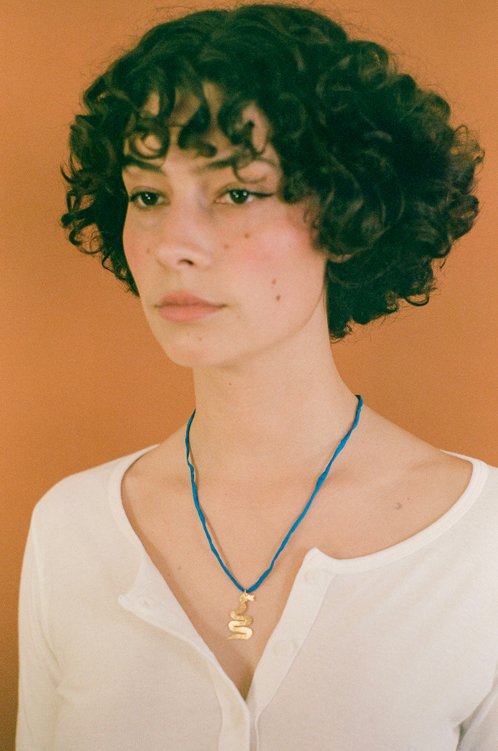 Snake shaped pendant with etched details strung on a blue silk cord. Spring ring clasp closure. Designed by Après Ski and made by craftsmen who work with gold-plated silver by hand in a traditional way.