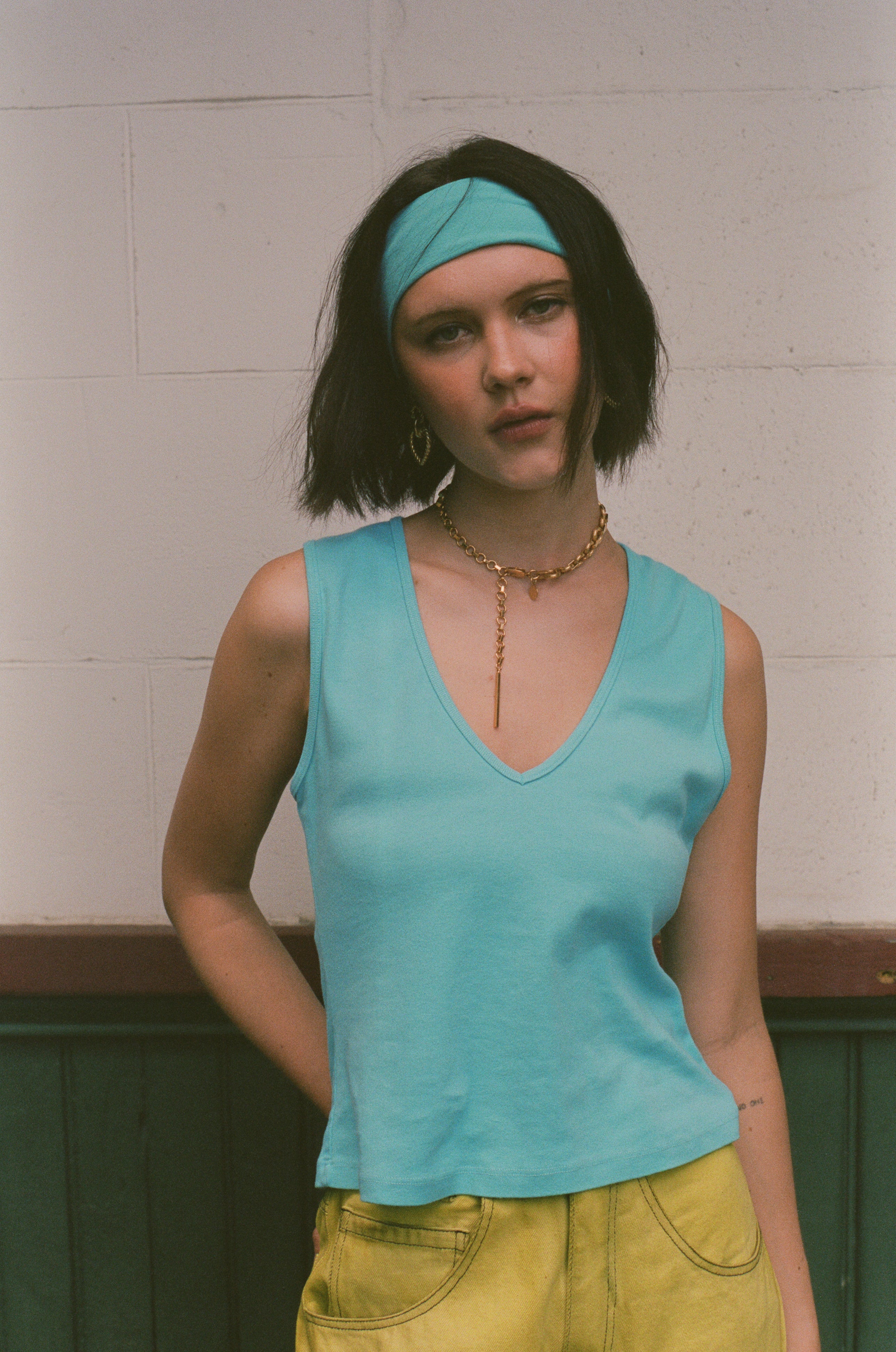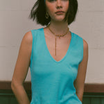 Valerie wears with the Carrie Tank in Aqua, Tony Jeans in Utopia, and Textured Ring Chain in Gold.