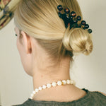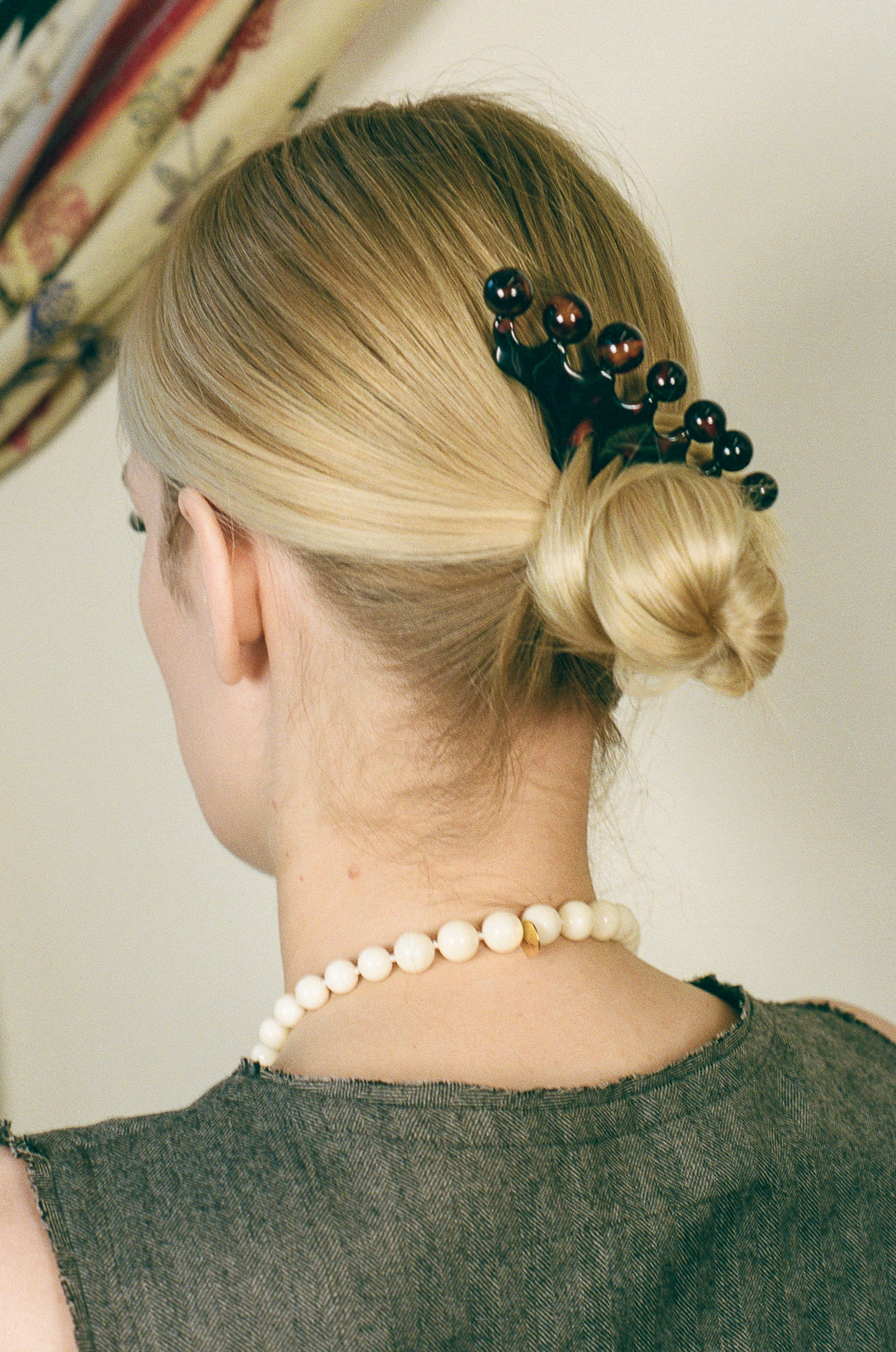 Thin comb inspired by an original 1920s piece with a wide band adorned by circles at its top, the crown of your head. The Tapia Comb is designed in Mosquito's atelier and handcrafted in the North of France from recycled cellulose acetate that mirrors a tortoise shell colour way. Each piece is crafted slowly and intentionally, on average each comb spends around six hours during the crafting process before it is ready to be yours.