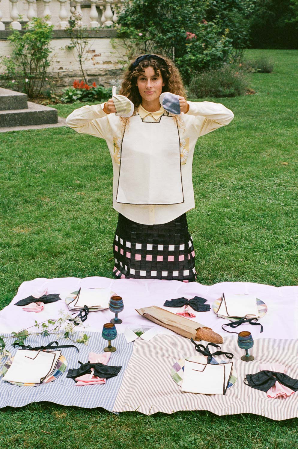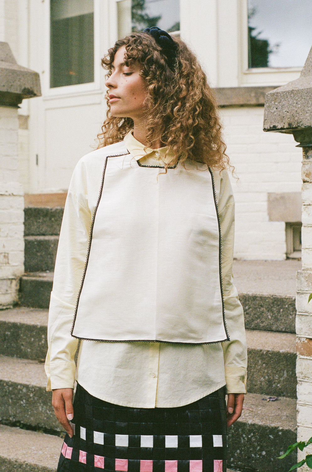 Sewn by hand in Cairo, these ivory bibs are finished with a black lace trim and satin ribbon. Perfect for a table of two.
