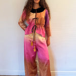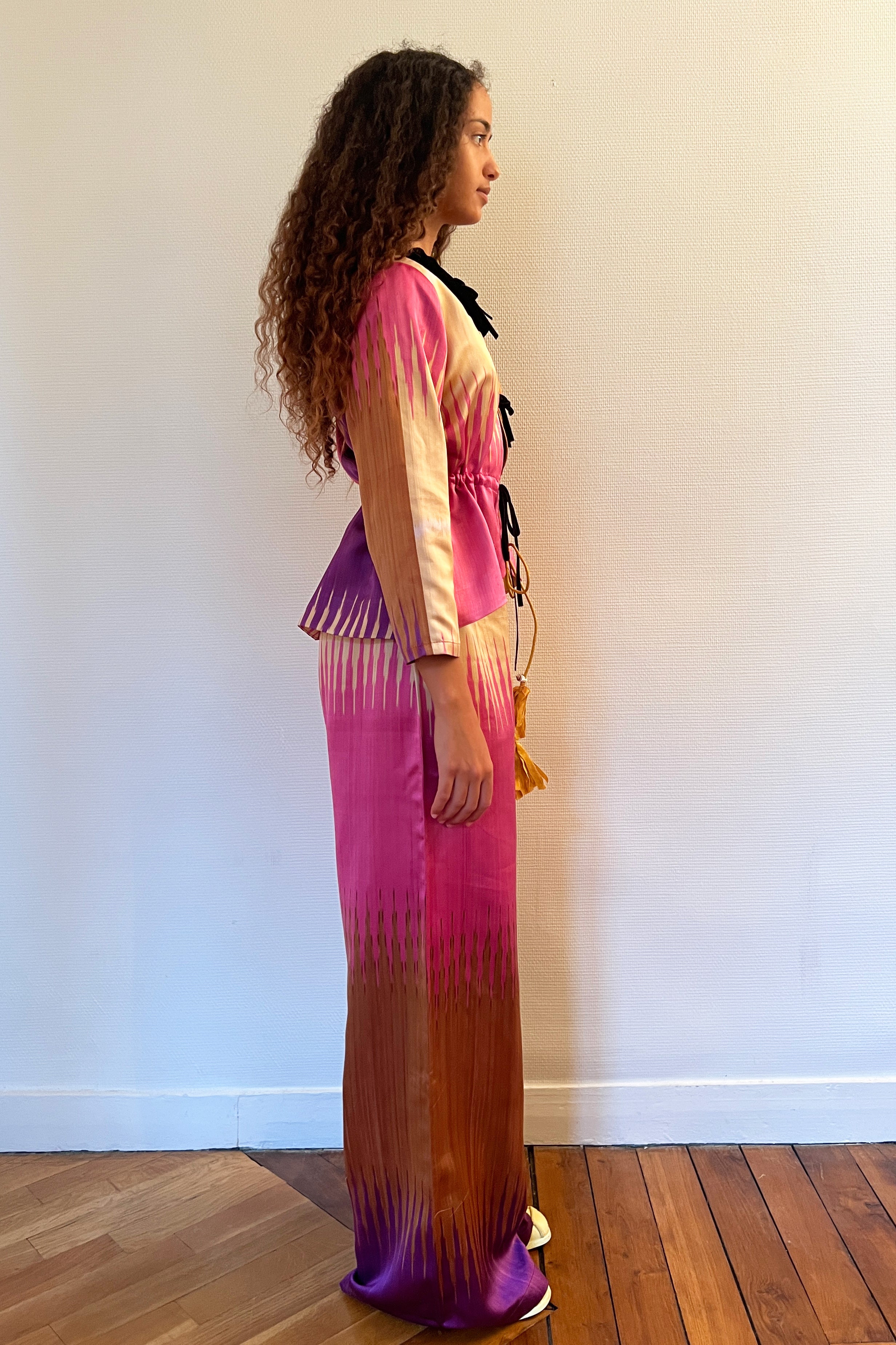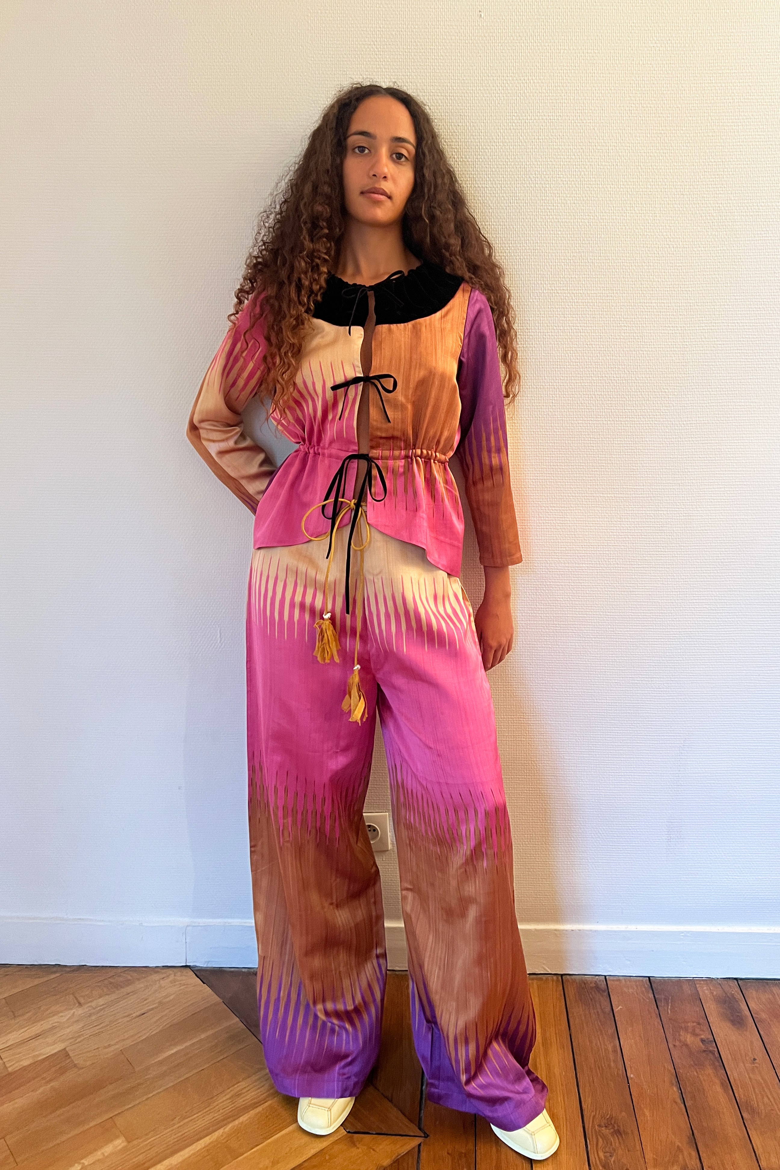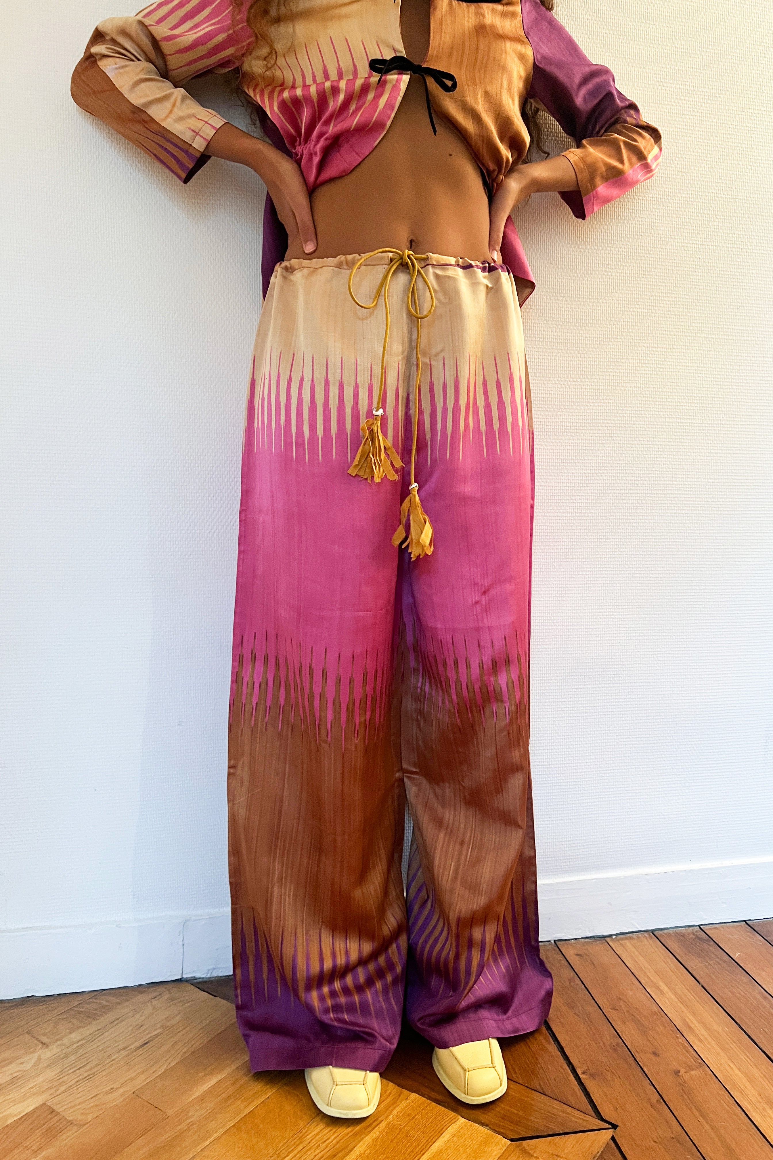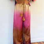 Draw string pants, with wide leg. The Jazz pants are especially easy to throw on and go. Plenty of room in the leg to move and dance. Draw string with tattered tassel and shell detail perfect for changing body shape. Lightweight, eye catching material  made with hand-dyed and hand-loomed silk by masters in the Fergana Valley, Uzbekistan for 100% SILK.