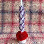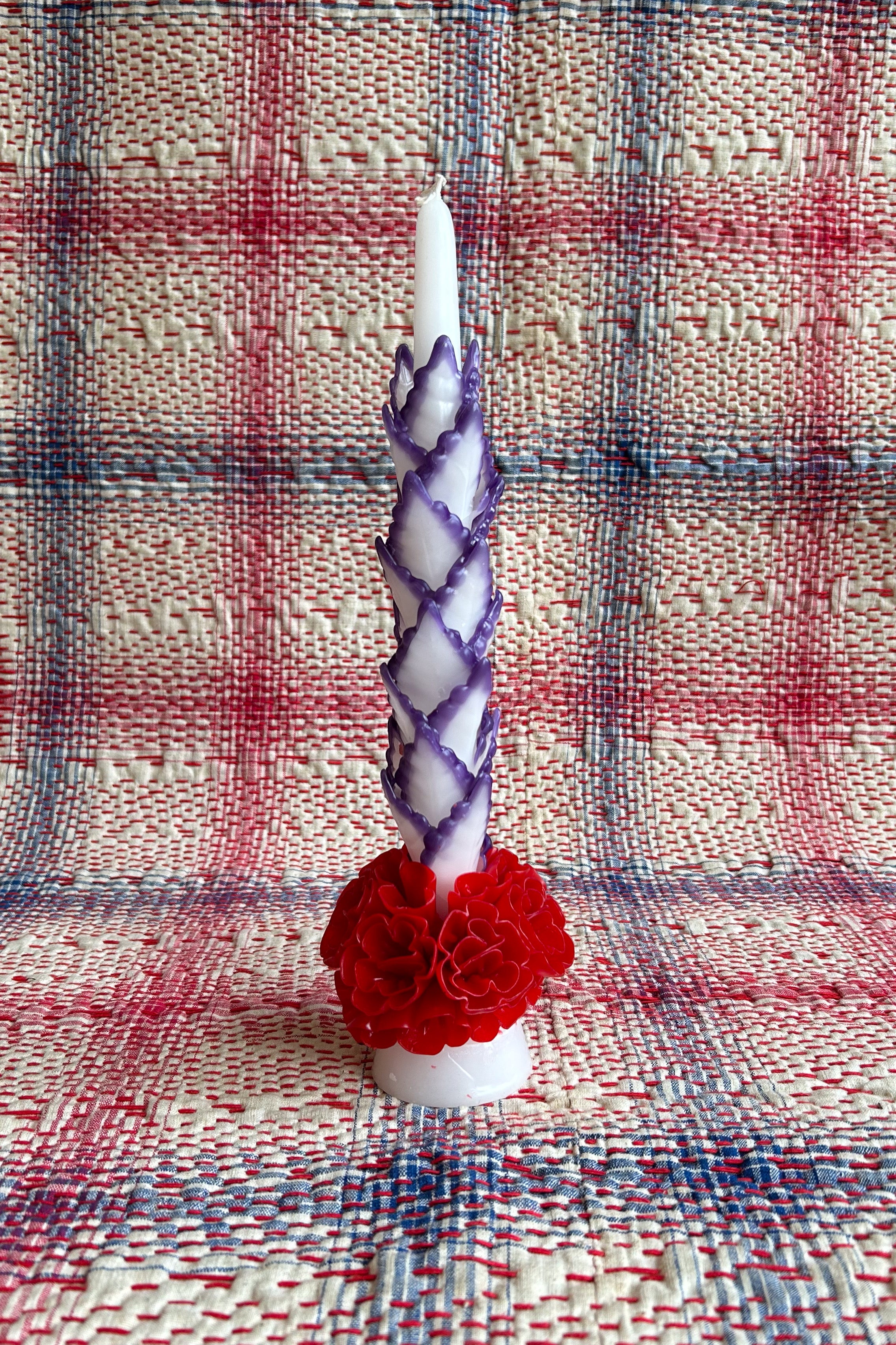Purple and white scale patterned candle with red rose base. Made by a family of artisans in Mexico City using local wax and dyes. Due to the organic nature of the candle, colour and shape may vary slightly.