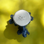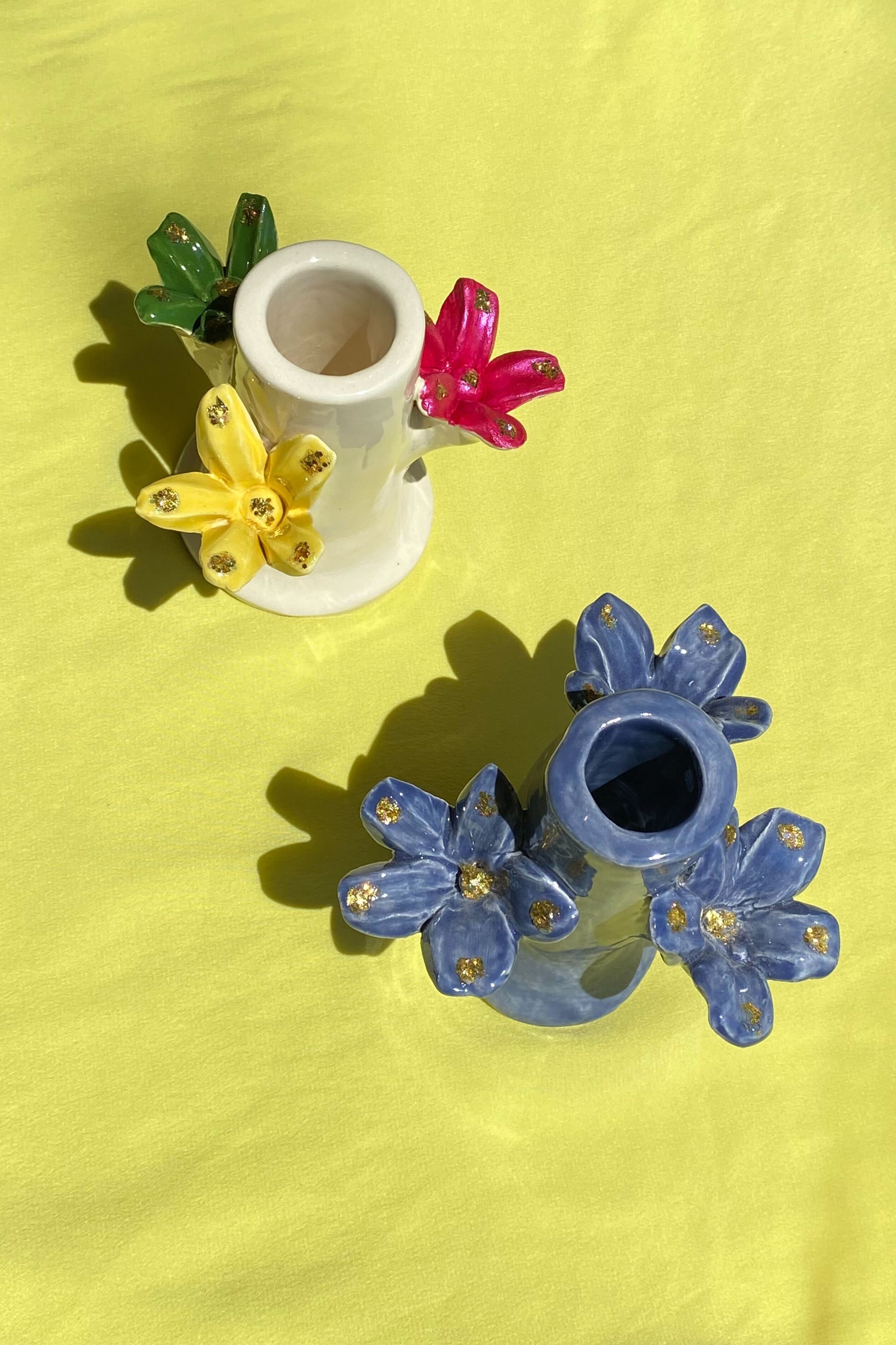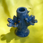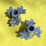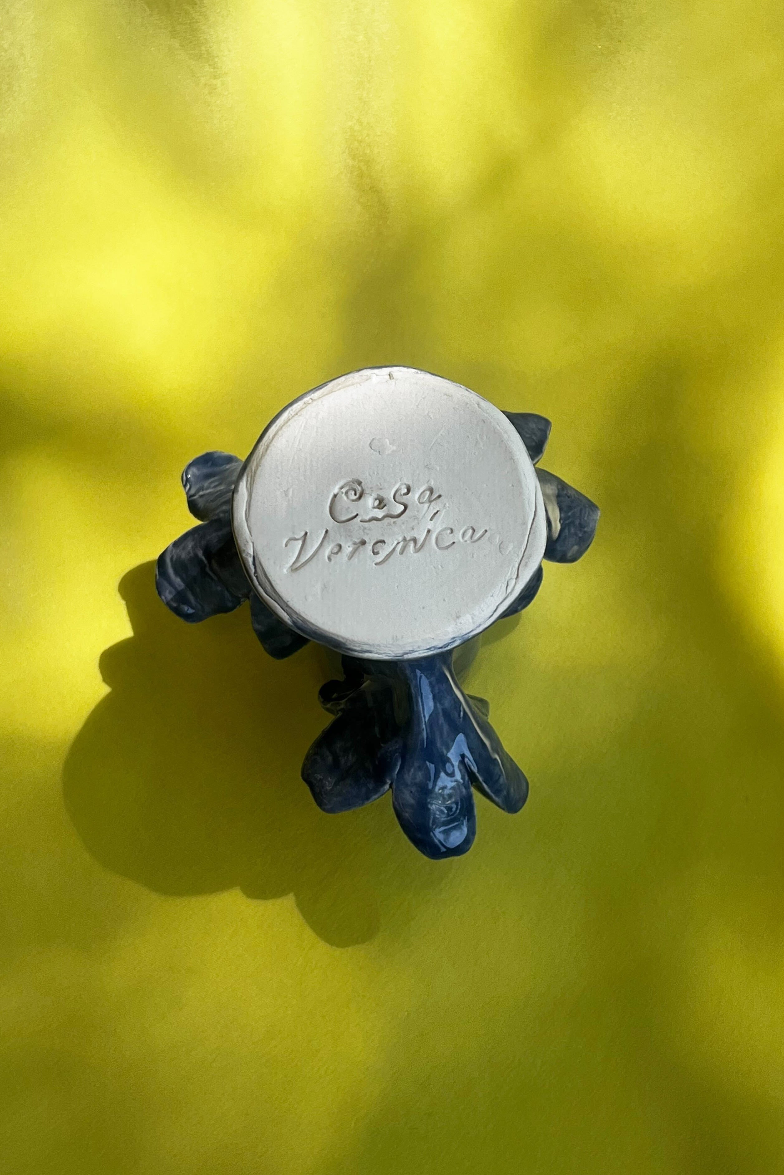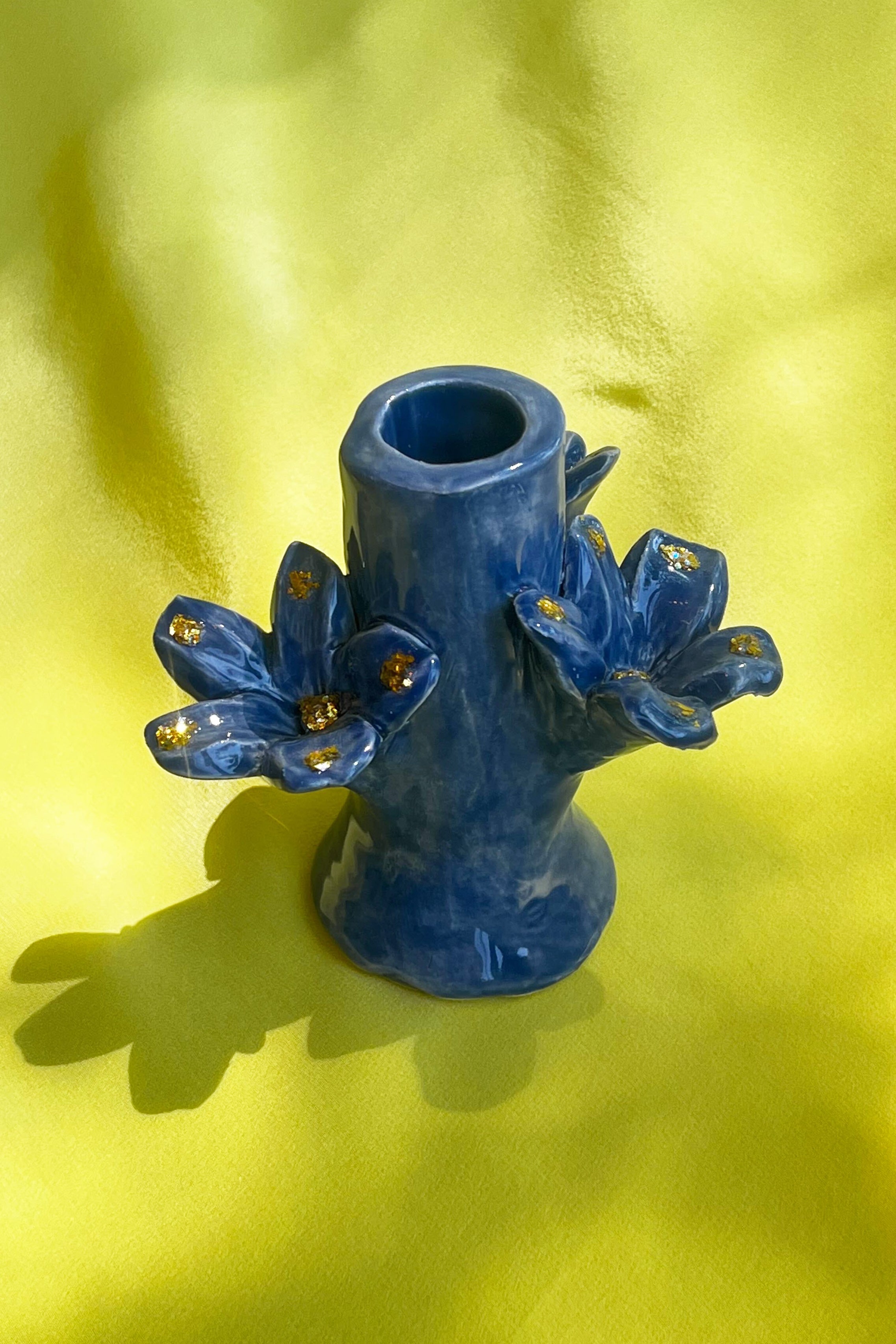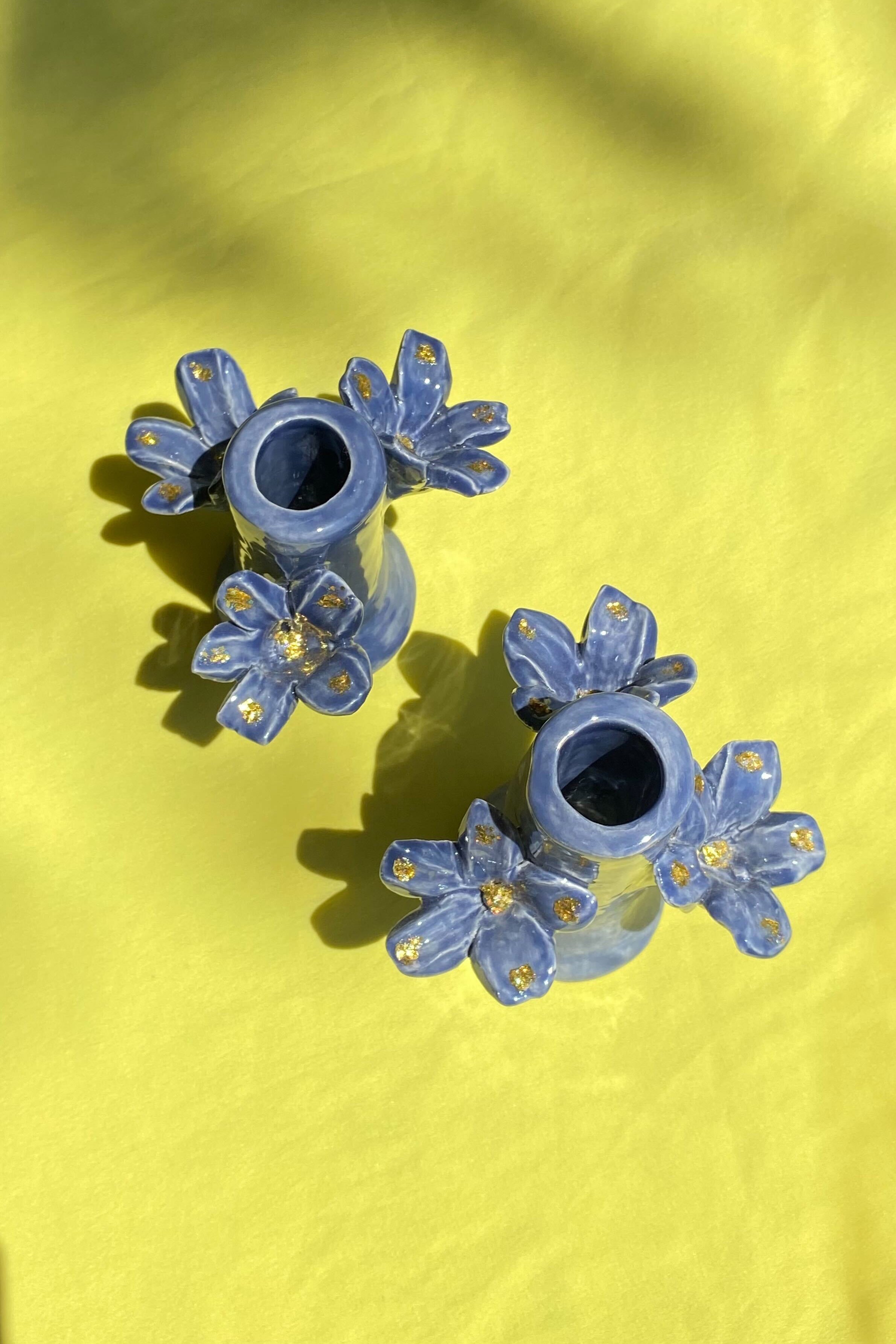Single hand built and hand painted ceramic candleholder in a denim blue tone with gold flake accents. Bottom stamped with Casa Veronica logo. Sold individually or purchase as a set for the full CV table experience.