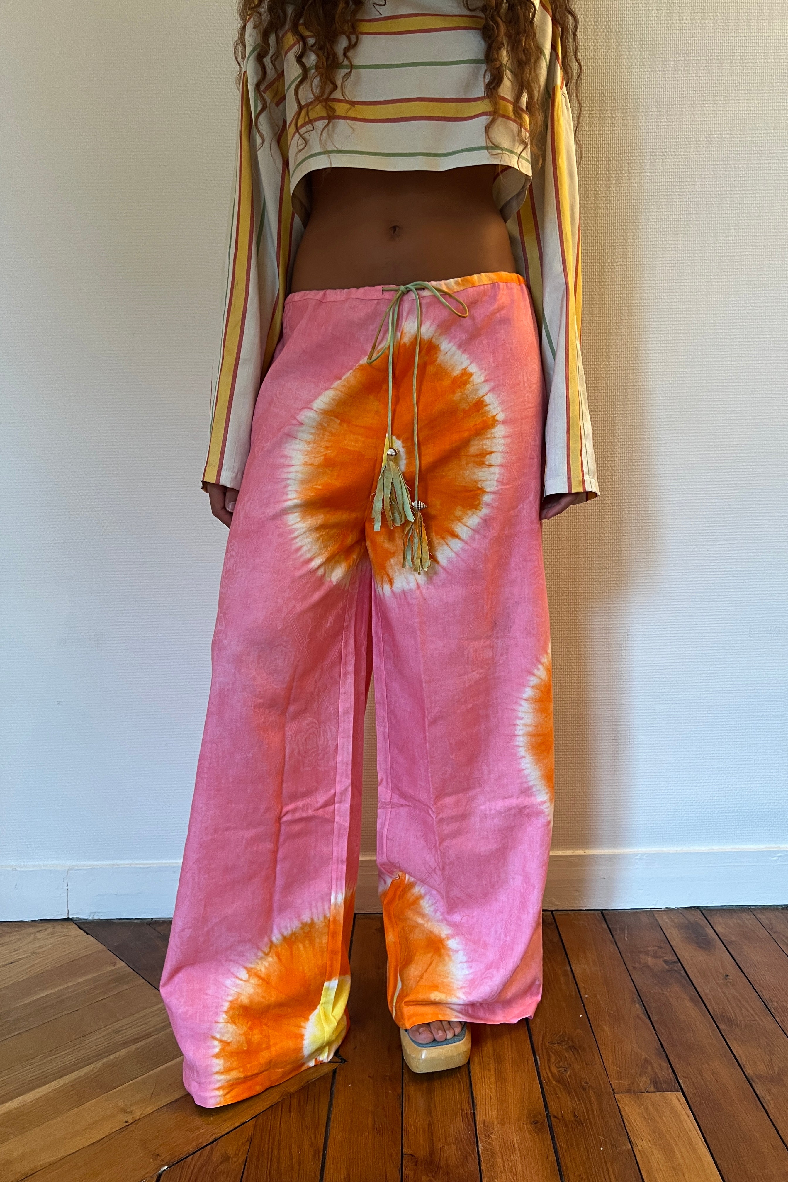 Draw string pants, with wide leg. The Jazz pants are especially easy to throw on and go. Plenty of room in the leg to move and dance. Draw string with tattered tassel and shell detail perfect for changing body shape. Lightweight, eye catching material