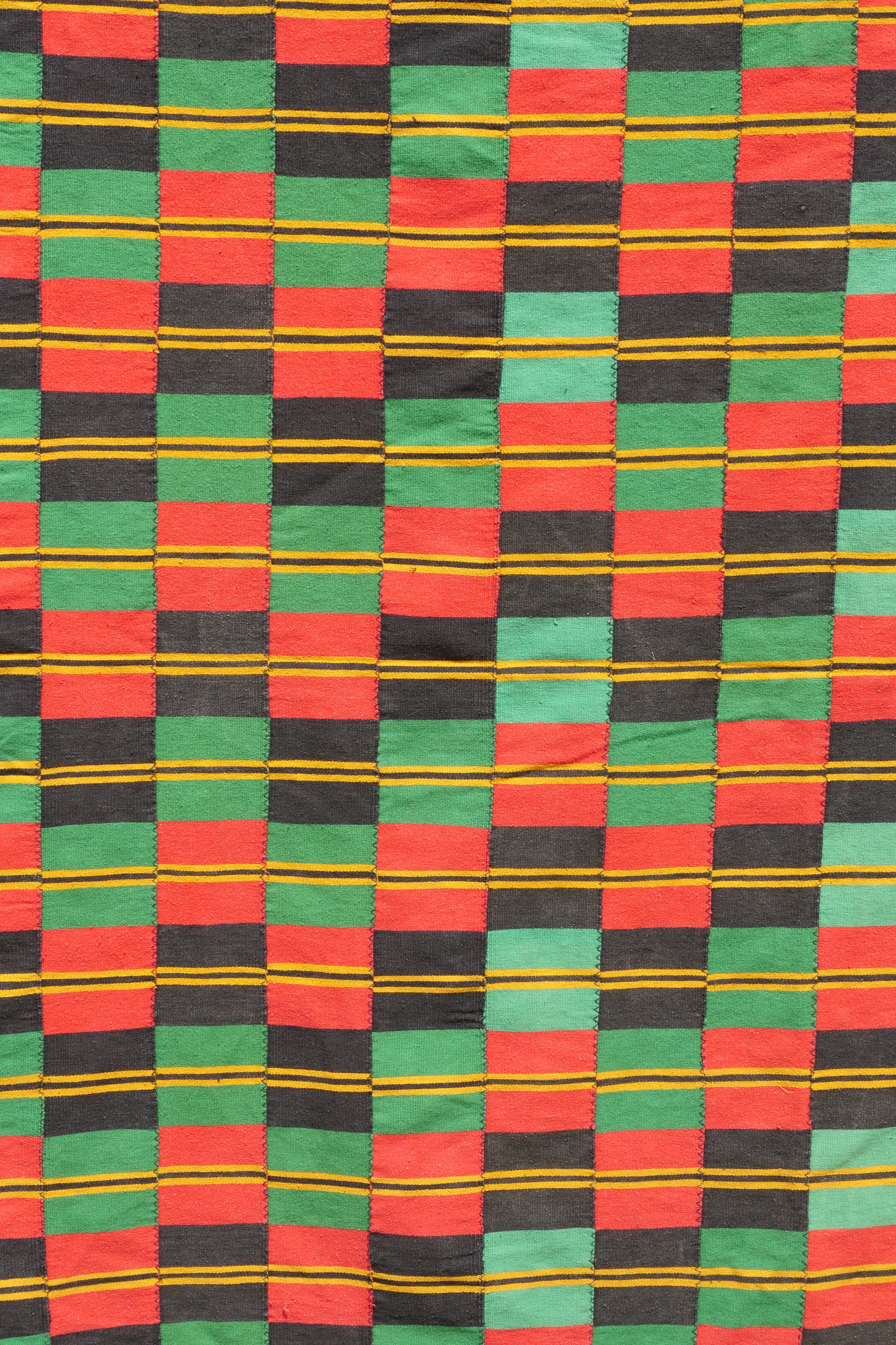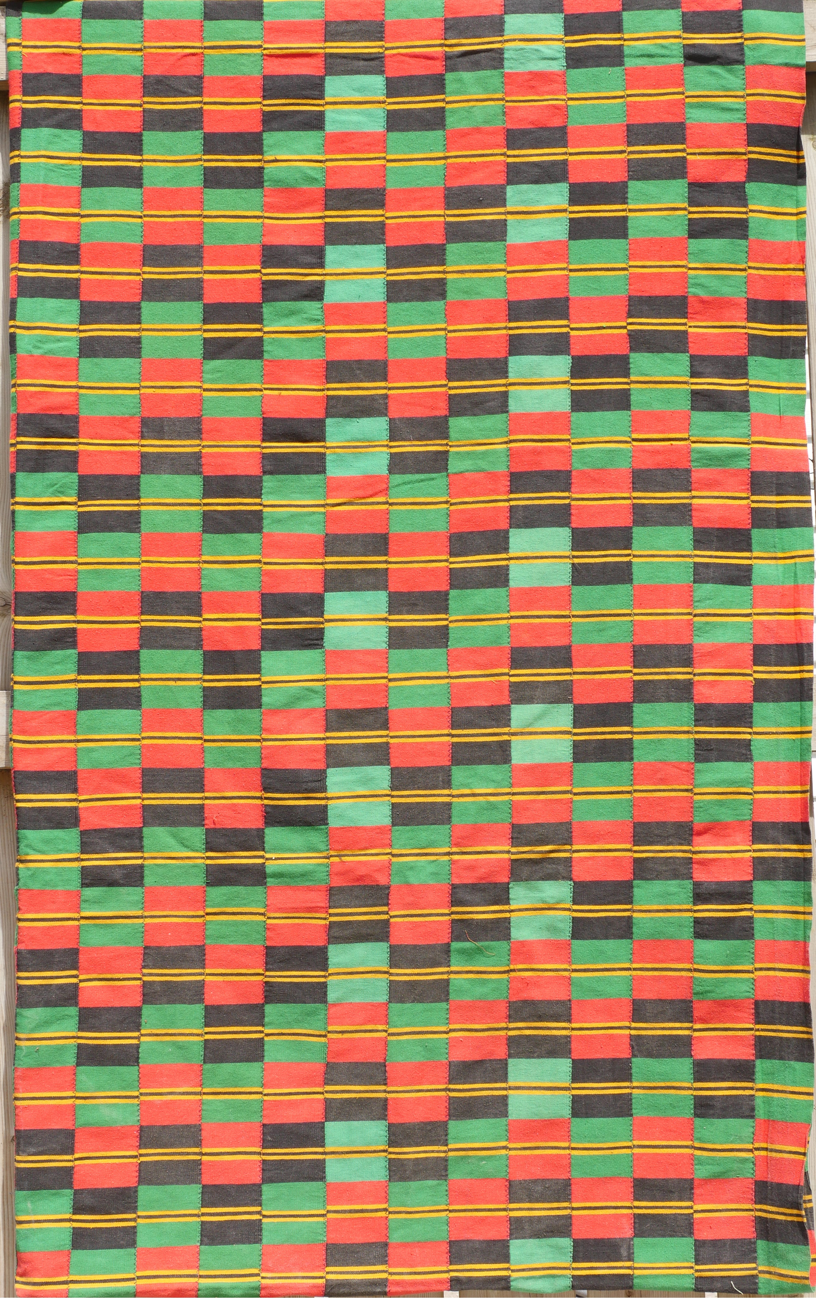 Considered one of the most significant textiles of the African subcontinent, kente cloth was historically made from silk and worn as festive dress on special occasions, such as a gathering of elders or the inauguration of new royalty. To create kente cloth, individual textiles are woven, cut up, and sewn together in elaborate patchwork patterns. The word kente is derived from kenten - the word for basket in the Twi language of the Ghana-Togo mountains - because of the resemblance between the woven patchwork textile and the region's baskets. In addition to being worn on special occasions, kente cloth has traditionally appeared in other prominent ceremonial objects, including drums, shields, fans, and umbrellas. This style of kente cloth comes from the Ewe people of Togo and Ghana.