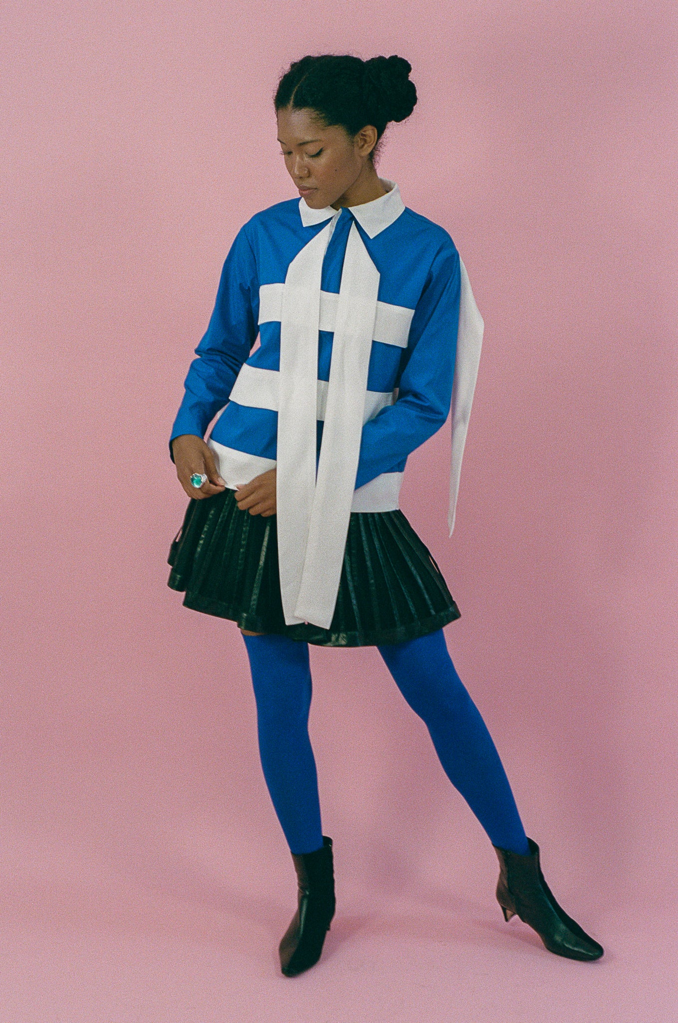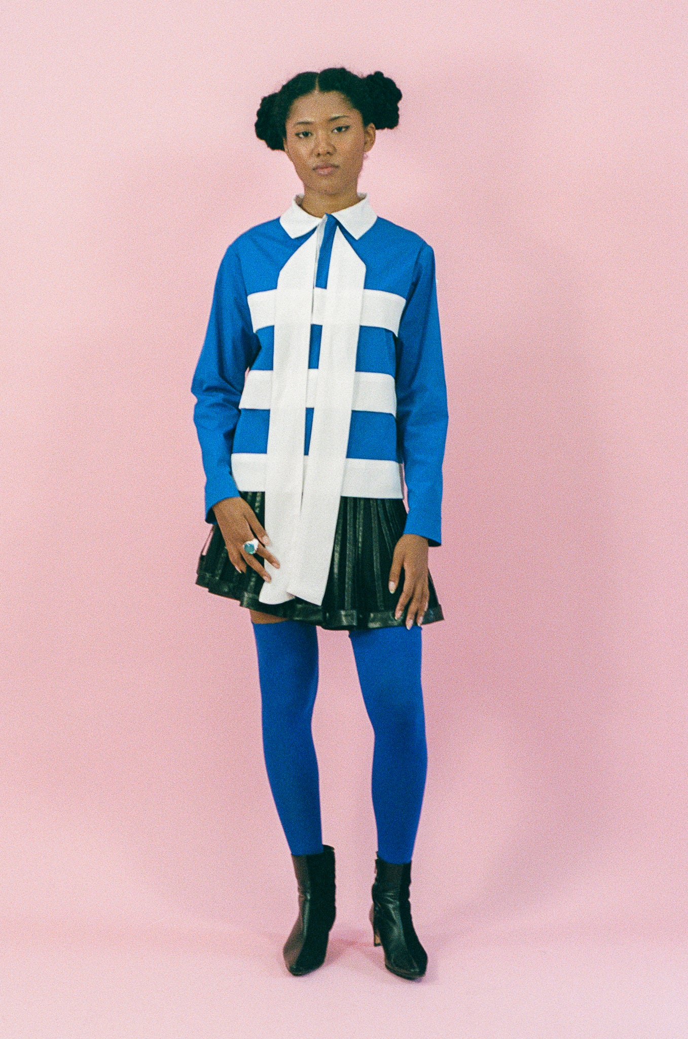 Long sleeve boxy pullover polo in primary blue with stand out white vertical stripes and white accents at the collar. Button closures at the front center chest. Features a thick band into strings that tie together at the front around the shoulders, adorning the sleeves while dressing up an otherwise sporty silhouette.