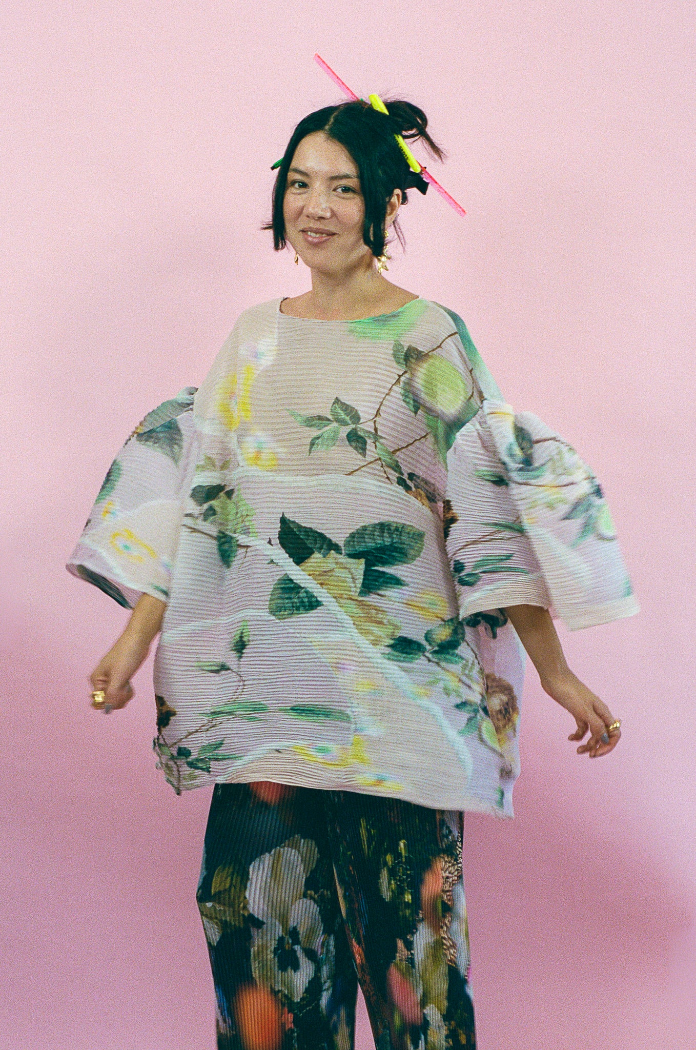 Boat neck full length top with mid length, wonderfully exaggerated, wide puffed sleeves in light pink with pastel and brown roses throughout. Beautiful, breathable, and bountiful. Made of a lightweight polyester chiffon that feels like silk and ensures the integrity of the print and pleat while remaining light as air.