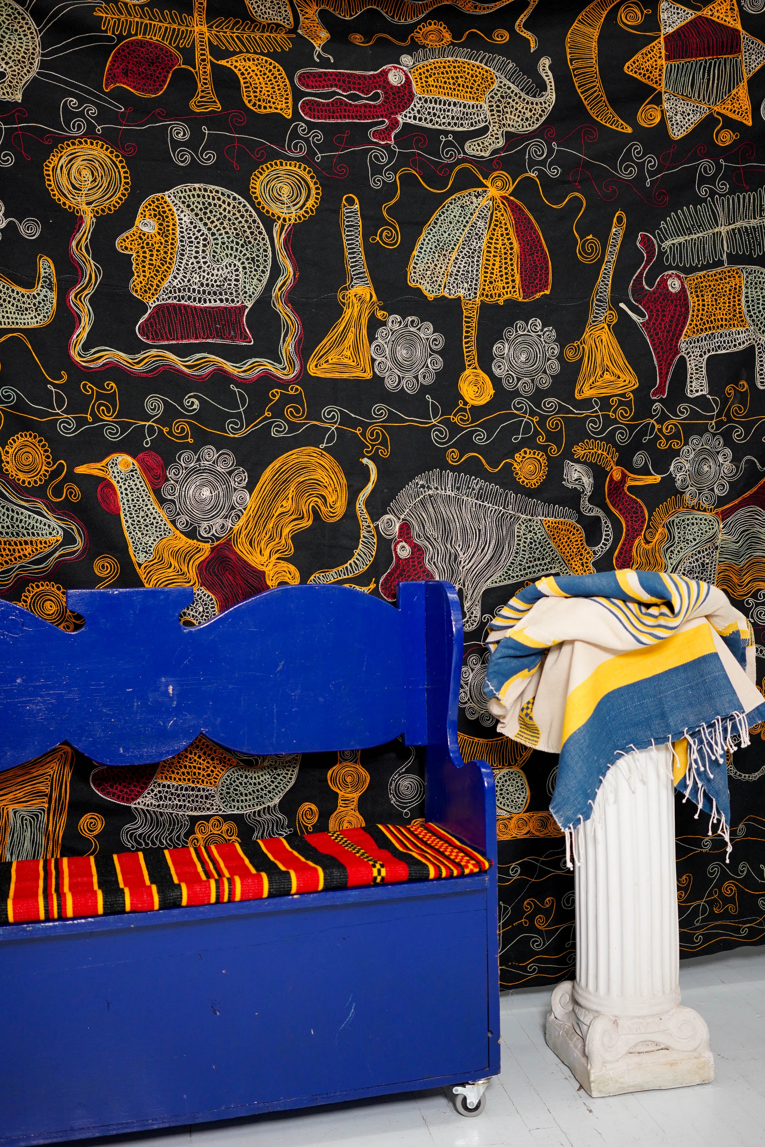 We find a variety of uses for the hand woven textiles in our daily lives. The same piece we might display hanging on a wall or a dowel as a work of art, we would take down to let our babies play upon. A piece might live draped over a bed or on a living room chair for decoration, or we may wrap ourselves in it to protect us from sun or keep us dry. There is no wrong answer. We hope you find ways to incorporate these beautiful, colourful pieces into your life in whichever way works best for you.