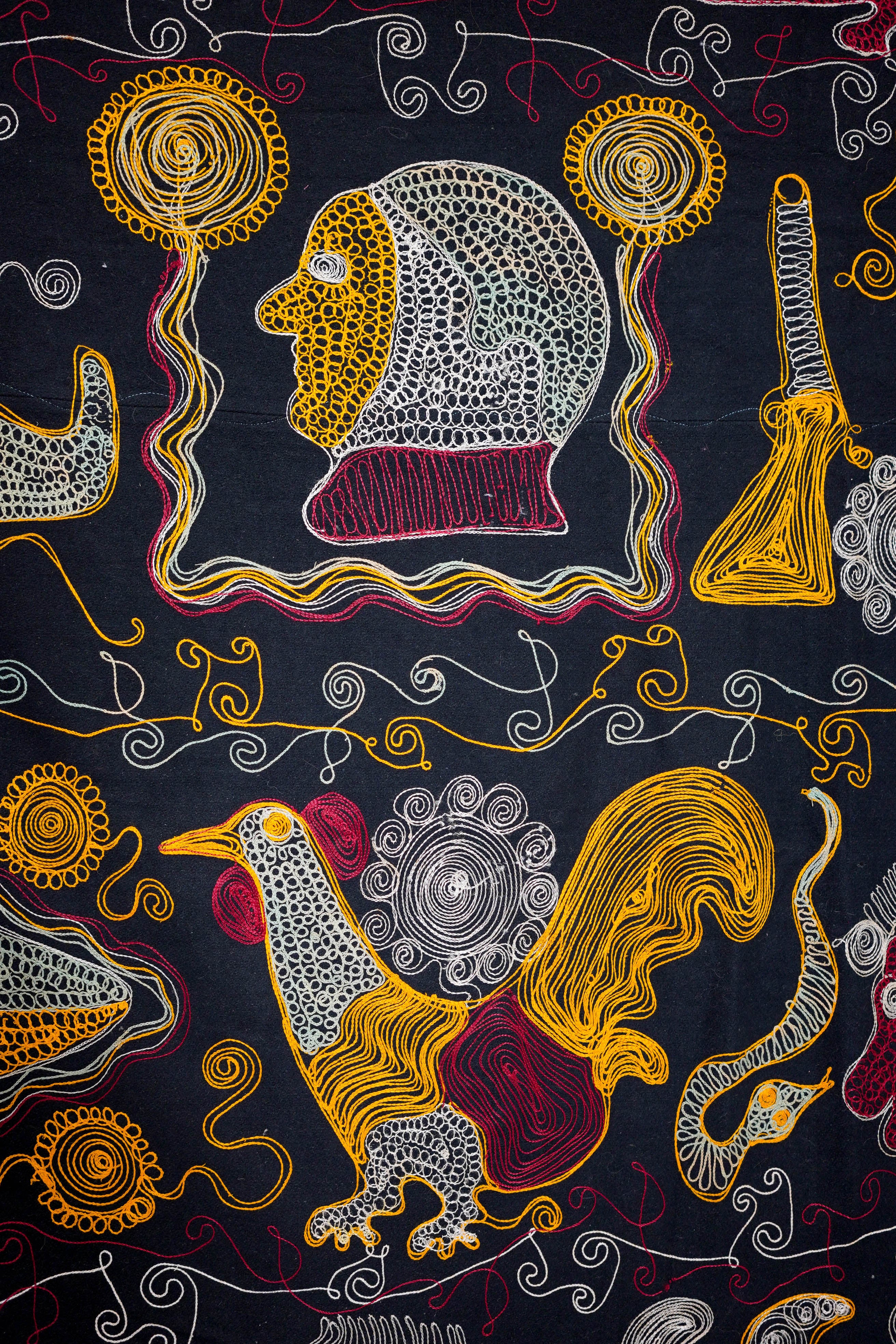 Akunitan were one of the lesser known but very striking styles of prestige male dress in mid 20th century Ghana, these dramatic motifs were machine embroidered onto imported wool cloth. Very finely made akunitan cloth with motifs that include a rooster, snake, airplane, royal stool, etc. The cloth is in excellent condition and dates to around 1960. The motifs, like much Akan art, allude to proverbs and royal imagery.