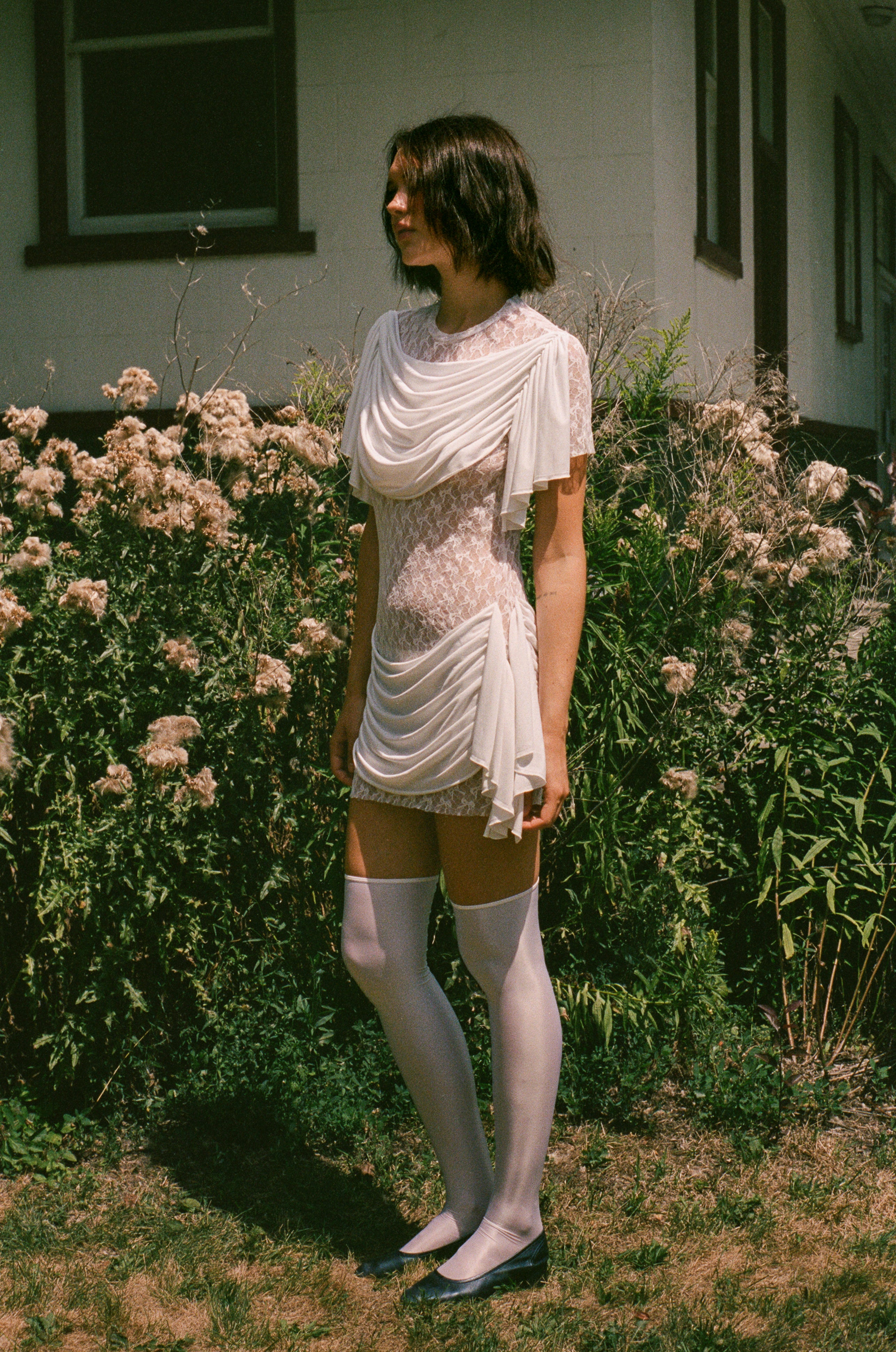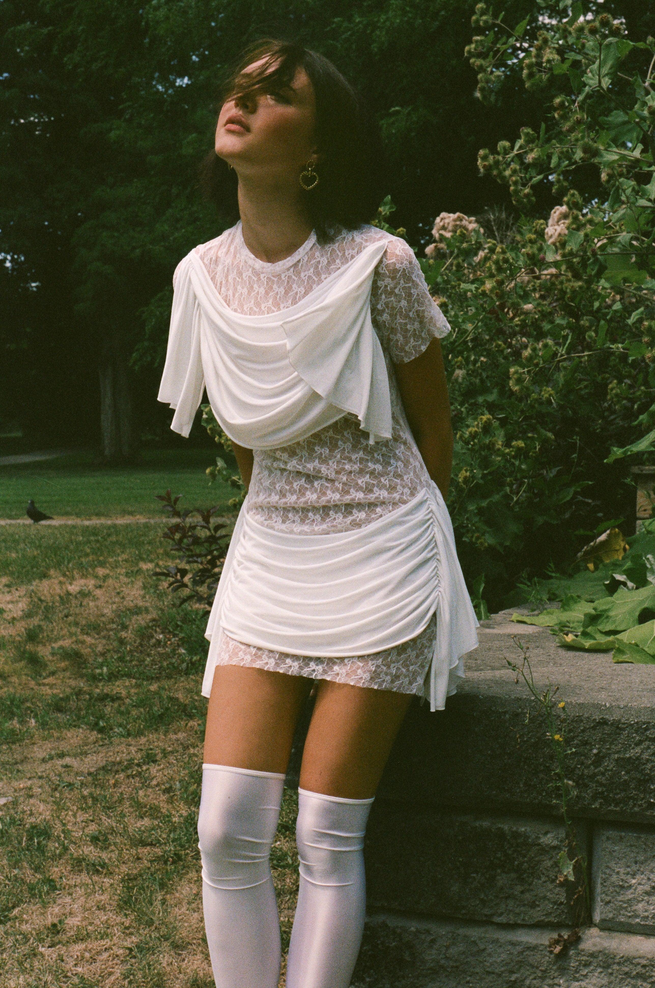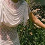 Material: 100% deadstock polyester lace, 100% lyocell drapes.