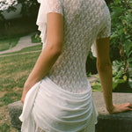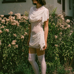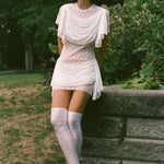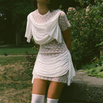 T-shirt mini dress in stretchy white lace with transparency through the bow design. Features double statement drape detail in opaque white across the front chest, falling naturally down the shoulder seams, and across the front and back hip, meeting just before the side seams hanging toward the bottom hem. A versatile piece that can effortlessly transition from dress to shirt for endless styling possibilities.