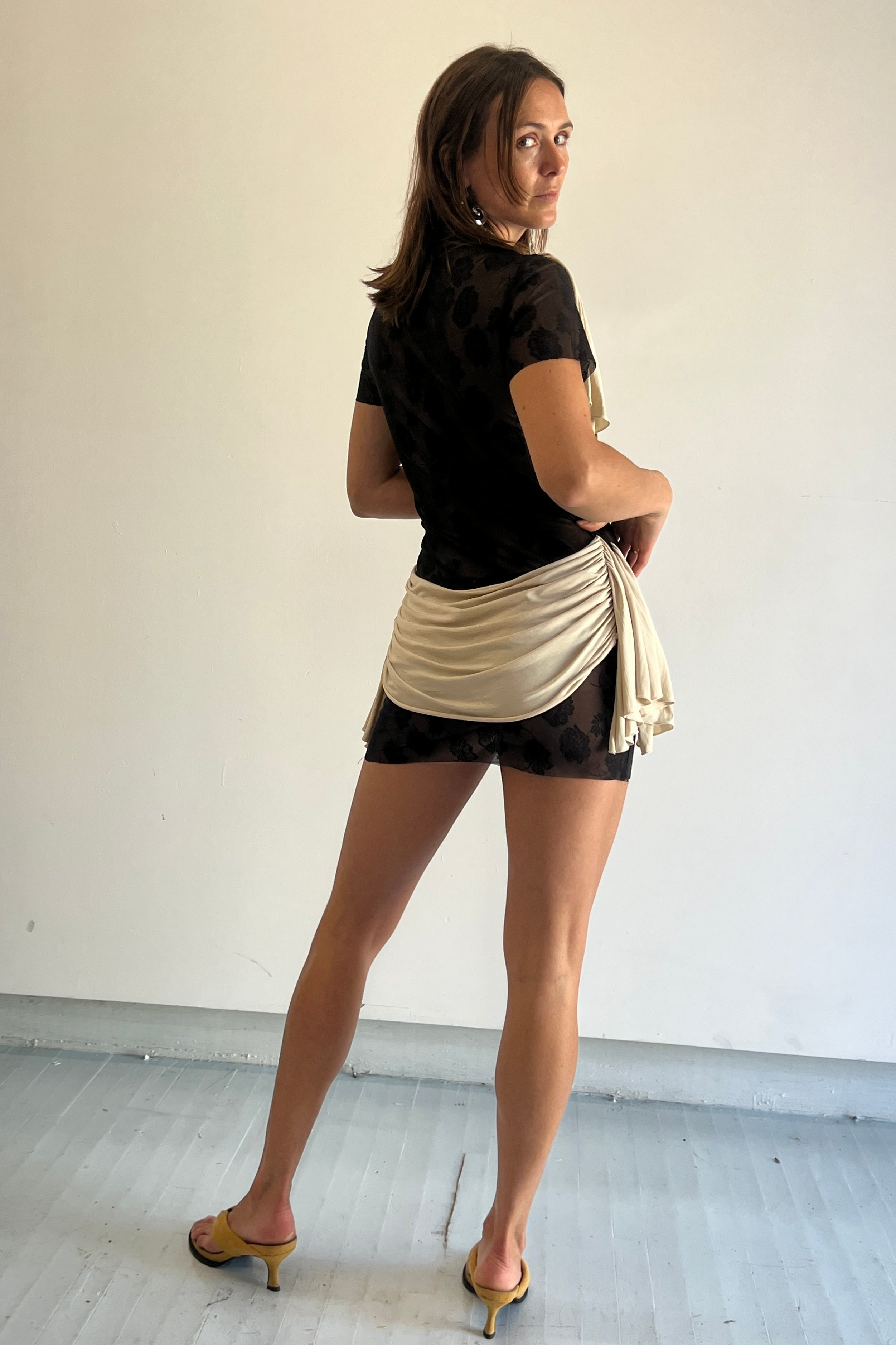 T-shirt mini dress in stretch black lace with transparency through the florals. Features double statement drape detail in ecru jersey across the front chest, falling naturally down the shoulder seams, and across the front and back hip, meeting just before the side seams hanging toward the bottom hem. A versatile piece that can effortlessly transition from dress to shirt for endless styling possibilities.