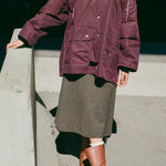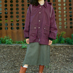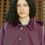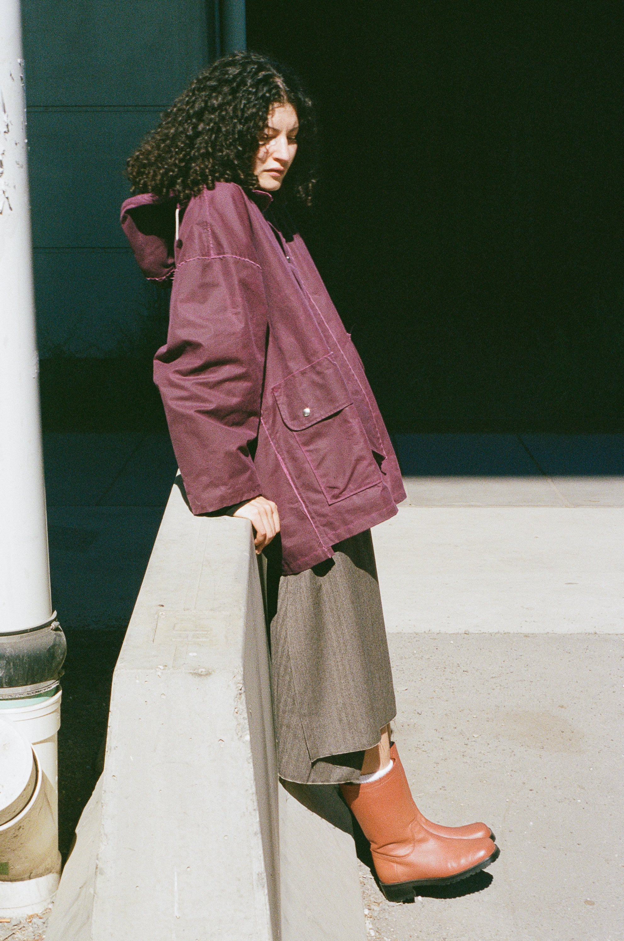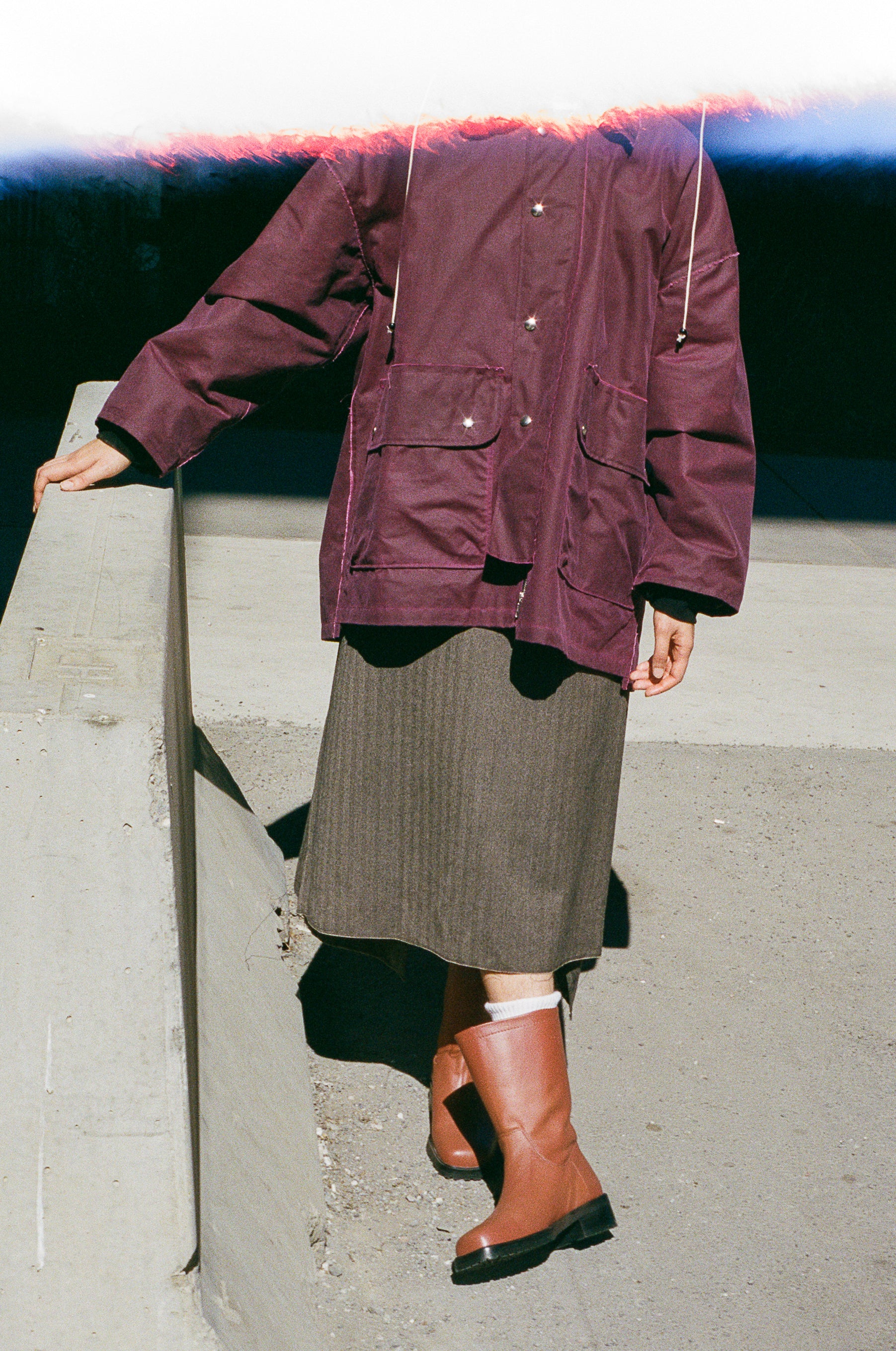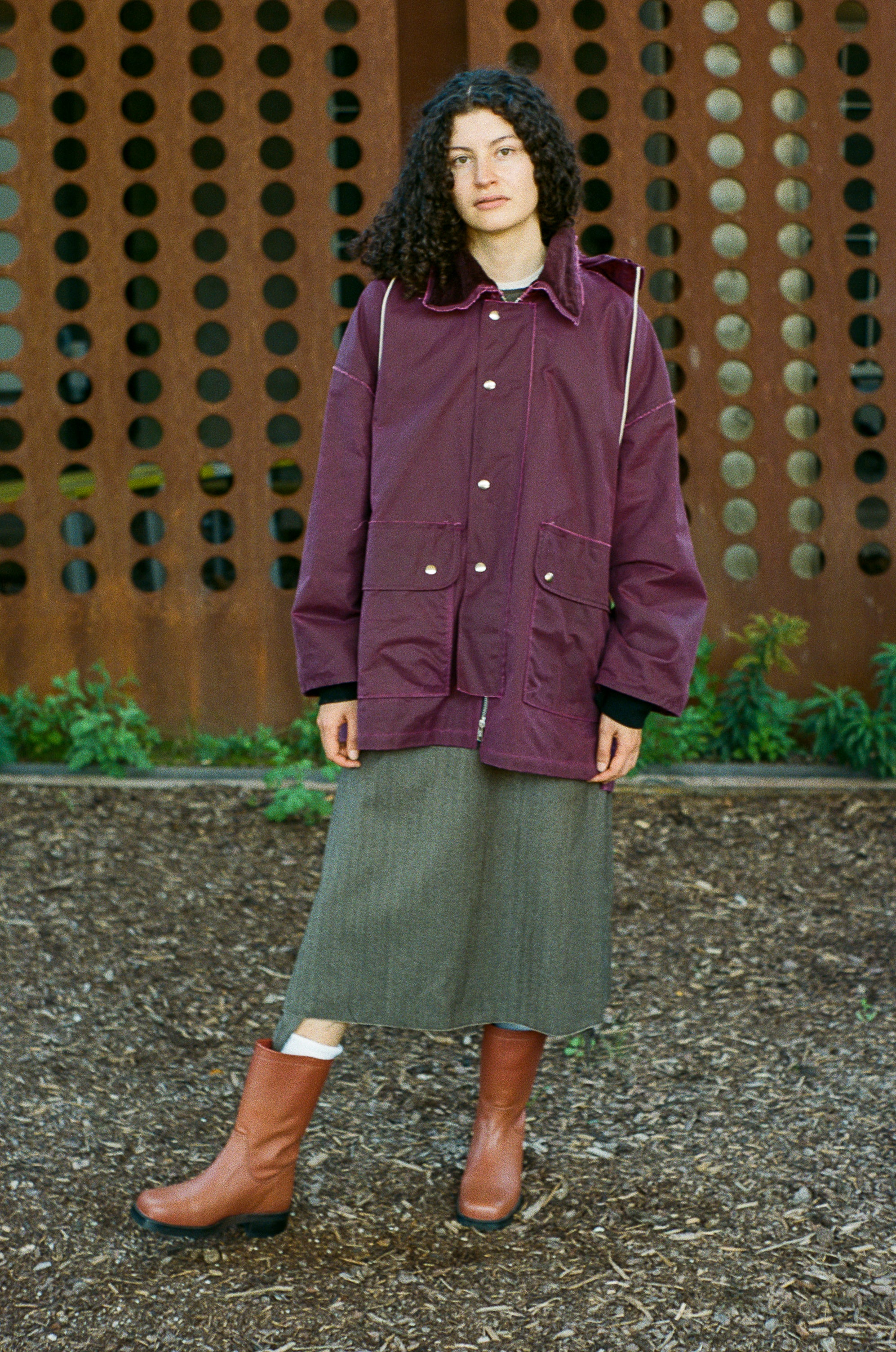 Oversized outdoor jacket in purple water repellent waxed cotton, referring to British utilitarian wear for the countryside, hunting, and fishing. Cotton lining. Zip and snap button front closure. High neck with beautiful texture contrast on the inner upper collar in corduroy, visible when folded over with adjustable snap button tab closures, meeting at a detachable hood with drawstrings and metal wires. Long wide sleeves that have rib cuffs retaining the shape. Durable and breathable, by virtue of the waxed cotton and ventilation holes with eyelets at the underarms. Two big flap pockets with snap button closures. Features irregular contrast topstitching and extended raw edge seams at the shoulders, armholes, neck, and sides. Men's sizing.