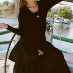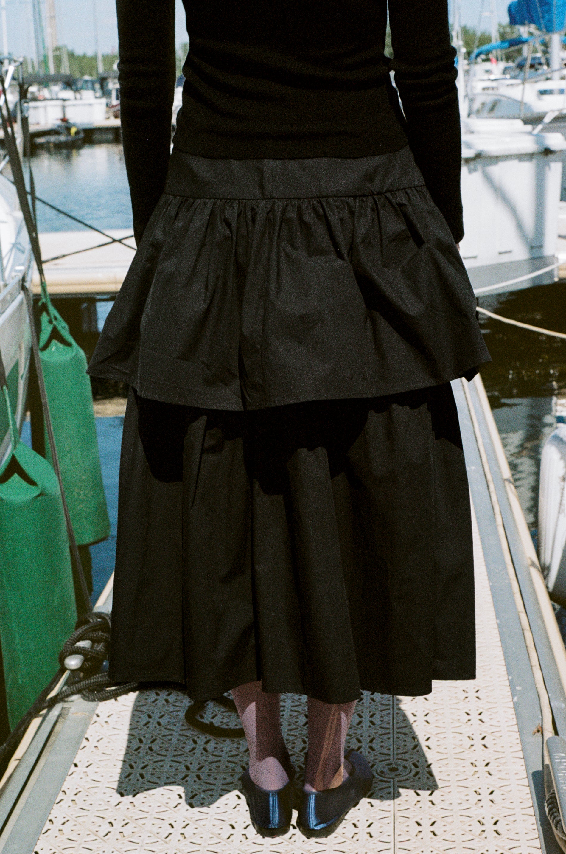 Mid rise midi skirt in deep black crisp cotton, A lining in shape into two structured voluminous tiers from the hip down. Invisible side zip closure. Easy to wear, easy to pair with any top for a sophisticated and feminine touch to any outfit.