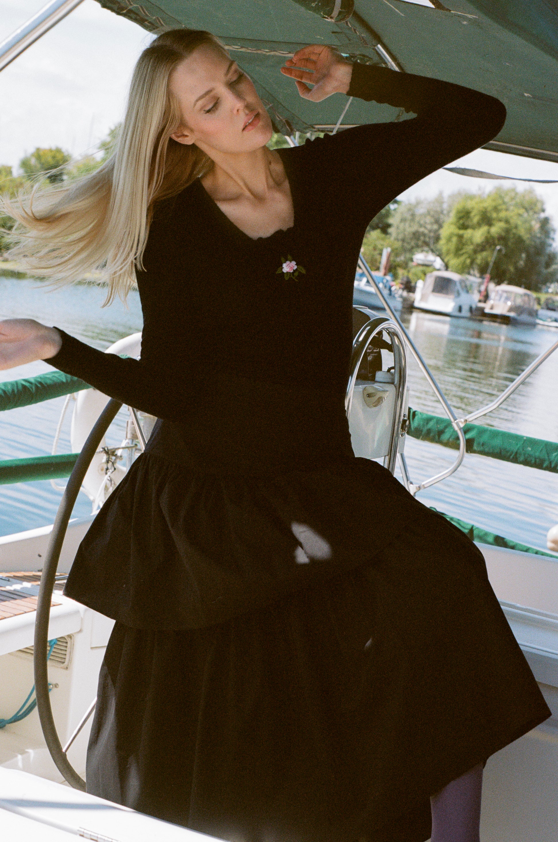 Talvi is 5'10 and a size medium, and wears size UK 10 with the Molly Knitted Top with Rose Embroidery and Satin Theatre Slipper in Navy.