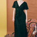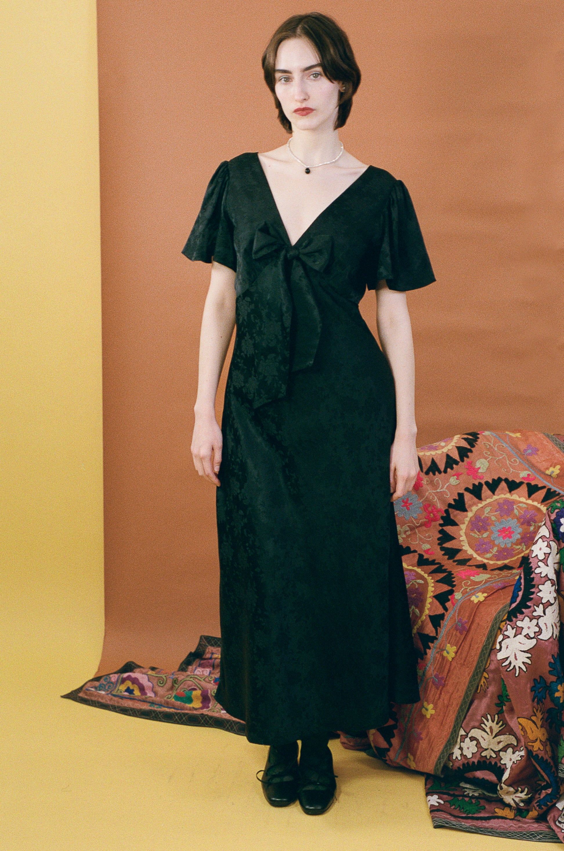 Midi length short sleeve v-neckline dress, a fan favourite from the Ciao Lucia collection back in a luxe black silk jacquard for the holiday season. Slip on style bias cut featuring a fixed bow at the bust and fluttery sleeves. Flattering, chic, and elegant, she's sure to become a staple in your closet.