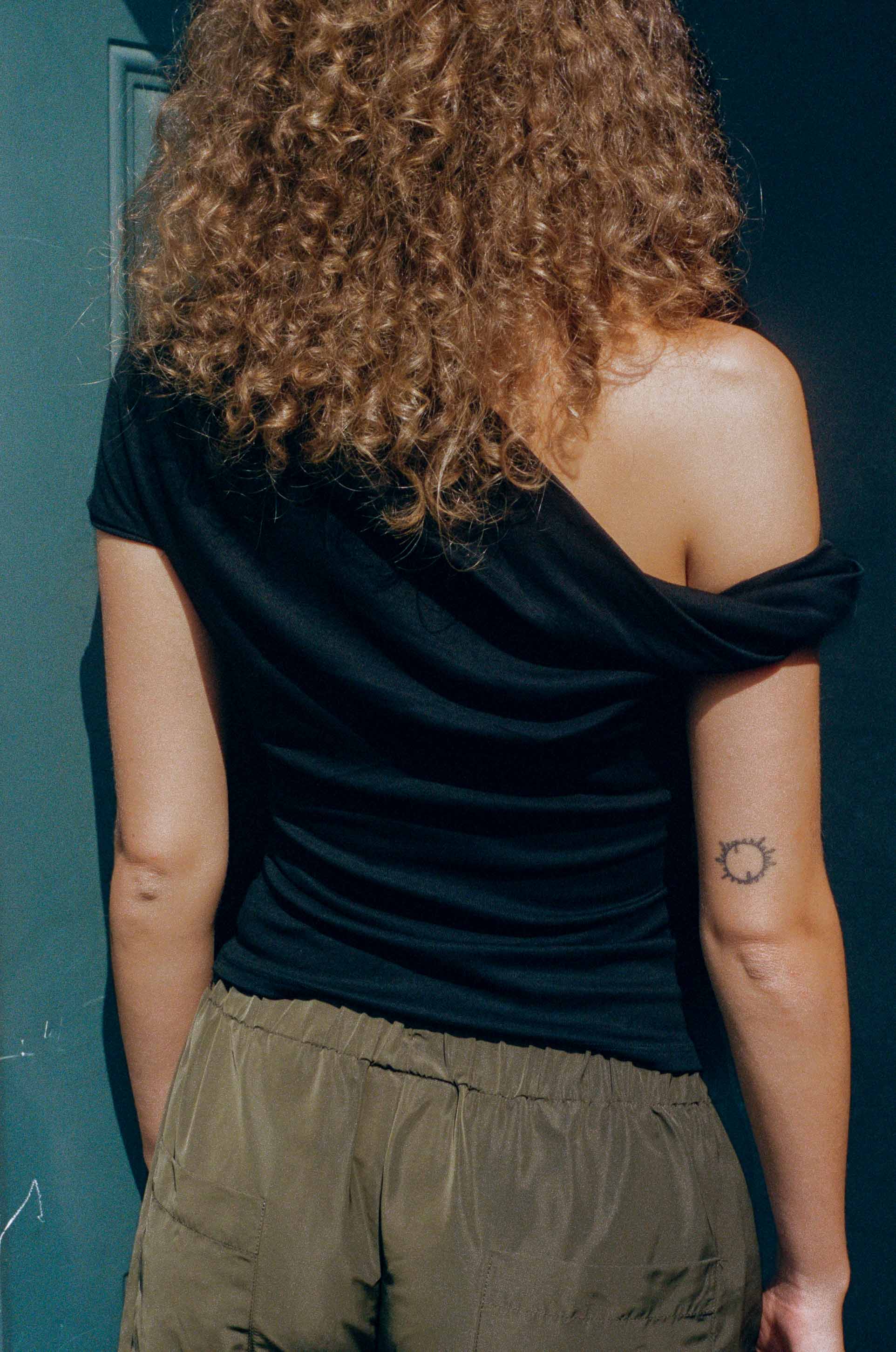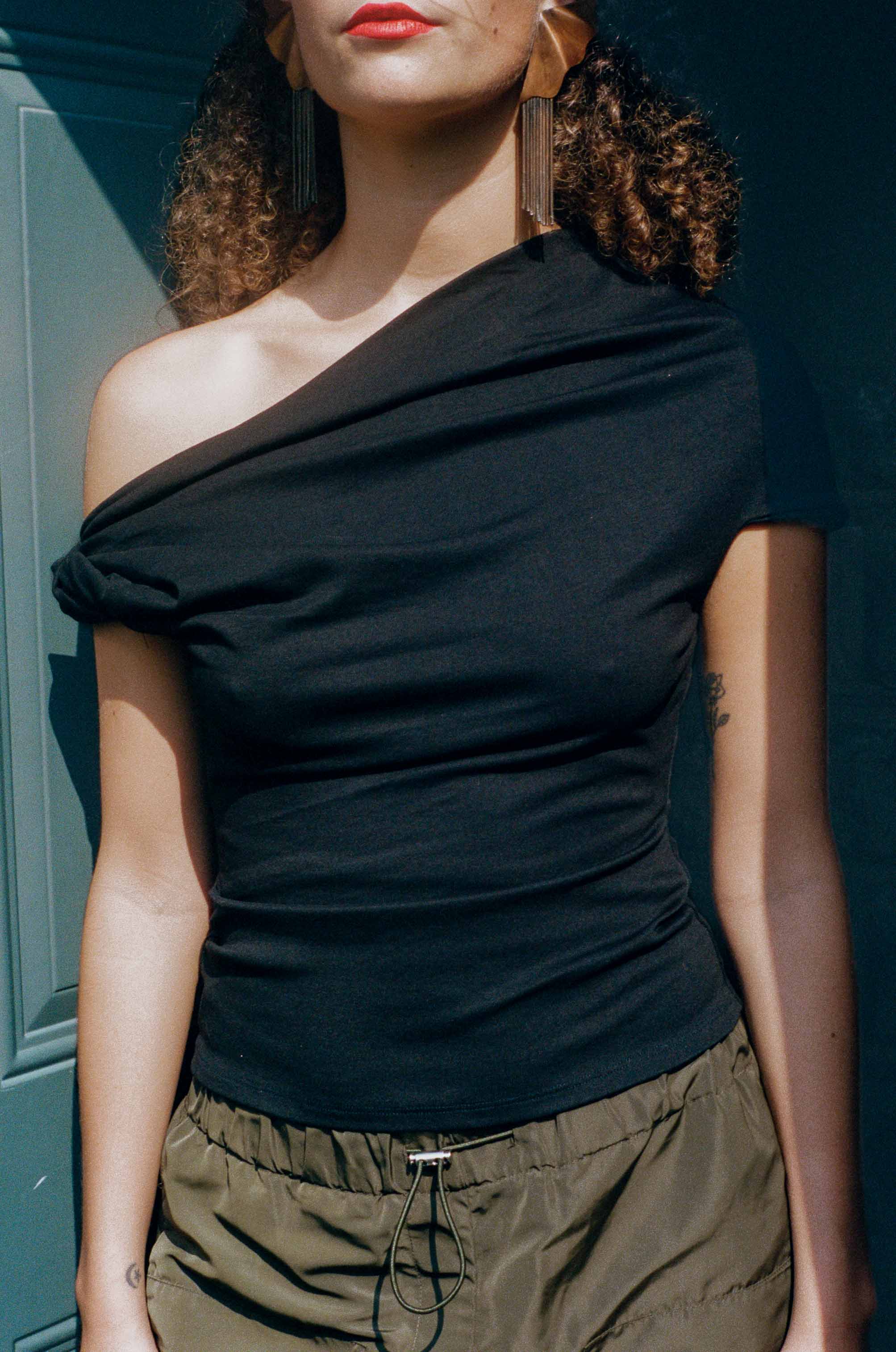 Soft stretchy cupro rib top in black. Features Paris Georgia signature one-shoulder twist, designed to sit slouched off one shoulder, with a capped sleeve on the other side. Fits true to size, with plenty of stretch, designed to be worn fitted.