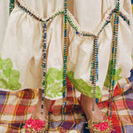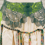 The Excess Work Apron consists of a maxi length cotton apron skirt in beige with an orange peel fibre tie waistband in green, cotton crochet detailing in blue and green, and pouch pockets throughout adorned with hand made mutli colour bracelets and glass beads. Underneath the voluminosity is a separate slip on cotton mini skirt in beige with an elasticated waistband, combined together to form an epically beautiful high low garment. A wear as you wish piece whether that be an apron front, apron back, or mini skirt on it's own.