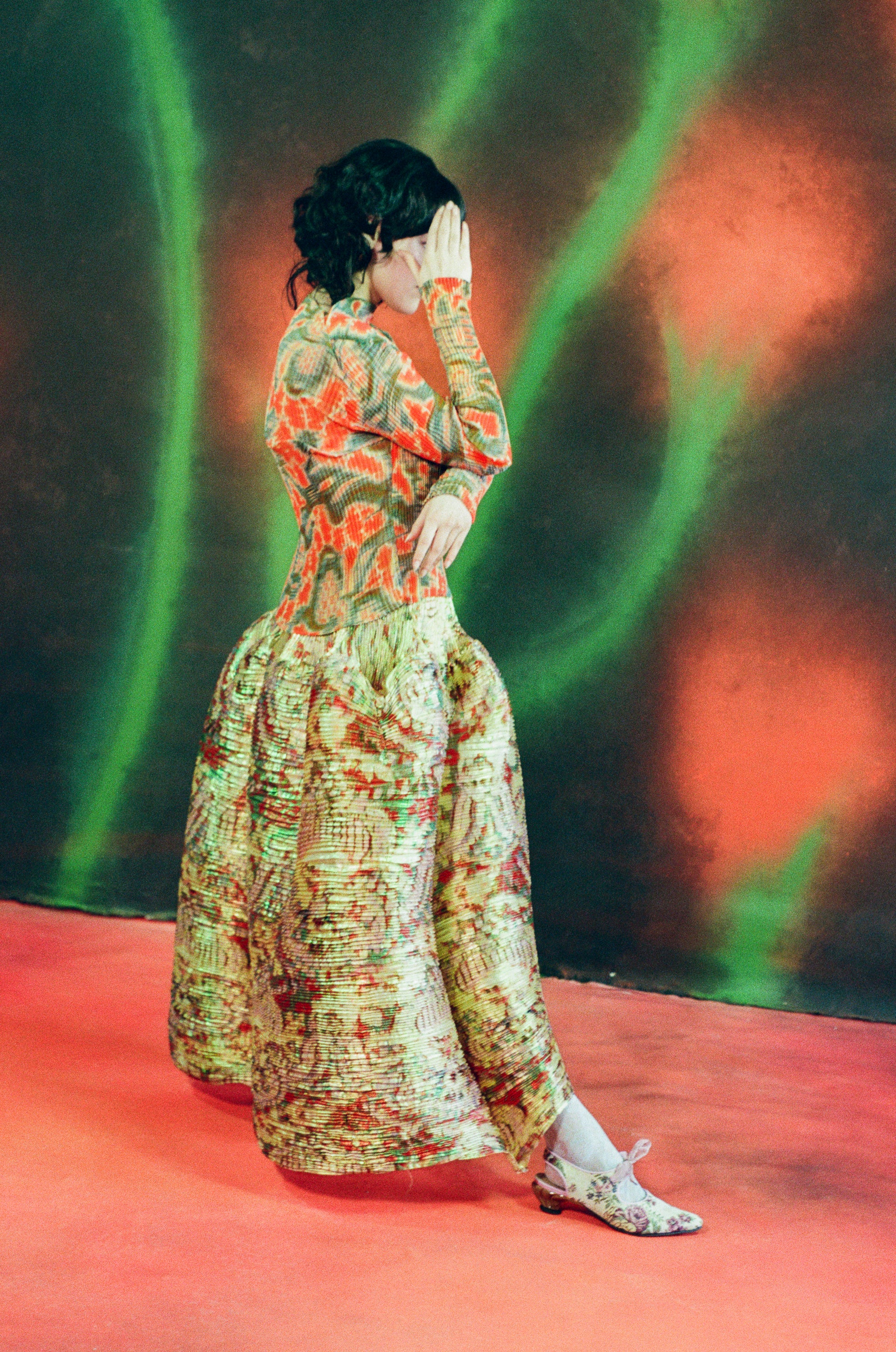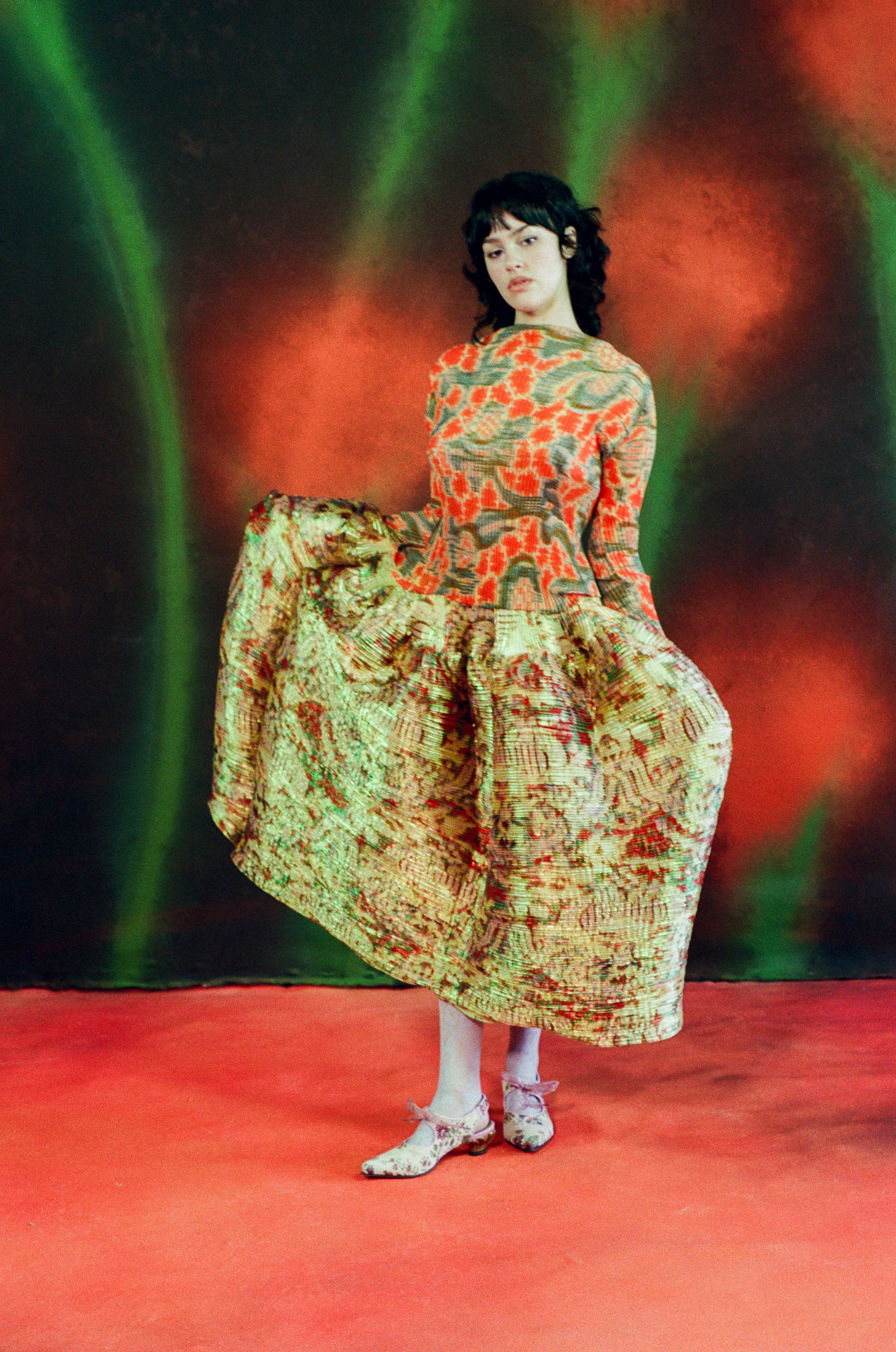Through her eponymous brand, Swedish designer Julia Heuer creates pieces that are instantly recognizable by their handmade plissé and vibrant prints. Heuer’s careful process sees a combination of illustrated stories being directly applied to raw materials and the Japanese tie-dyeing pleating technique of Arashi Shibori. The garments’ delicate pleating and loose but elegant cut create a playful sense of movement and unique silhouette.