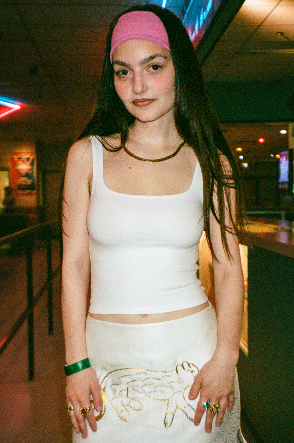 Sevan is 5'1 with a 25" waist and wears size extra small with the Dagged Skirt in Timur, Omega Chain in Brass, Sweetheart Earrings in Gold, Suede Ring with Lavender, Green, and Yellow Glass, and Halo Ring in Multi.