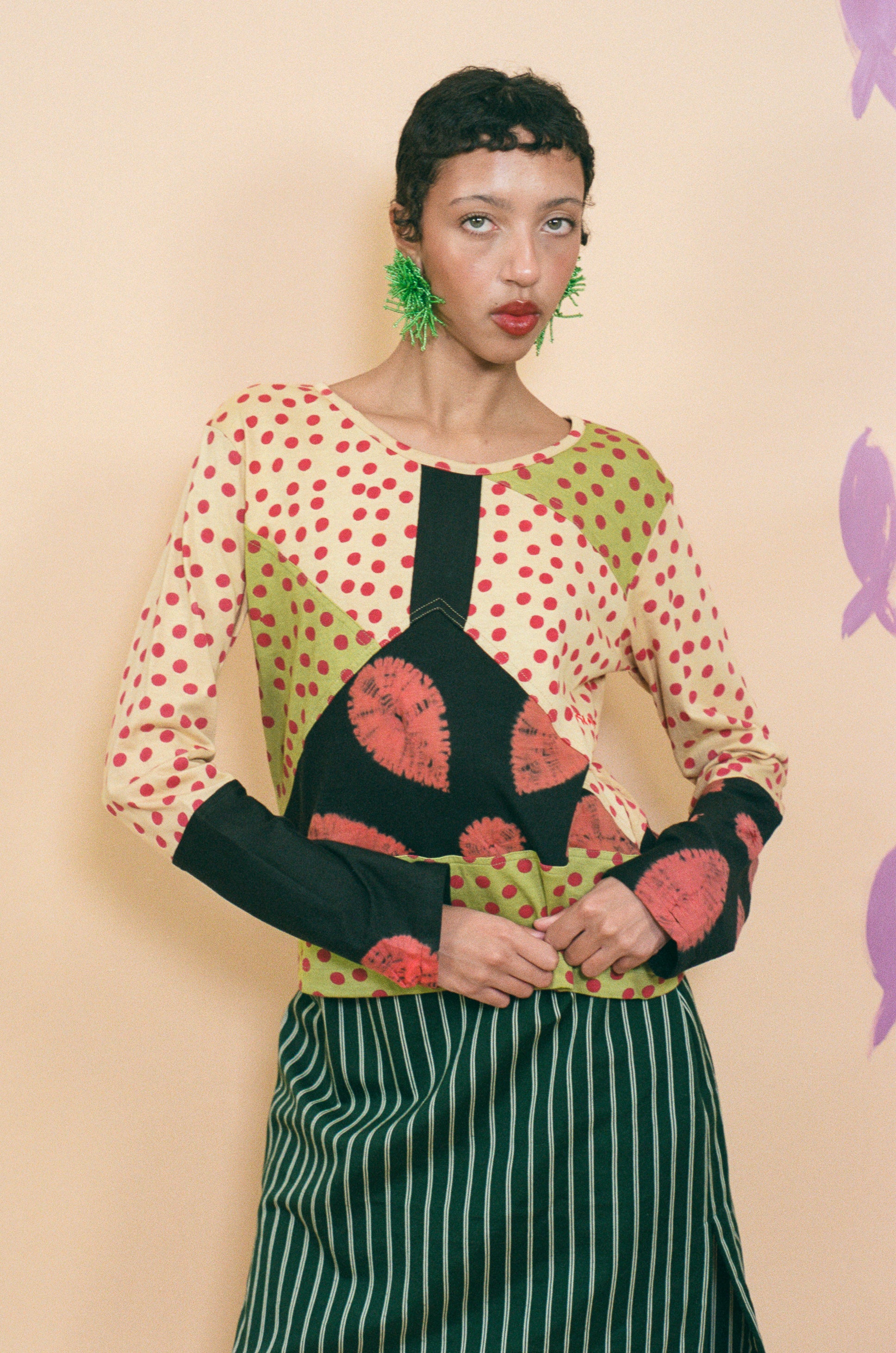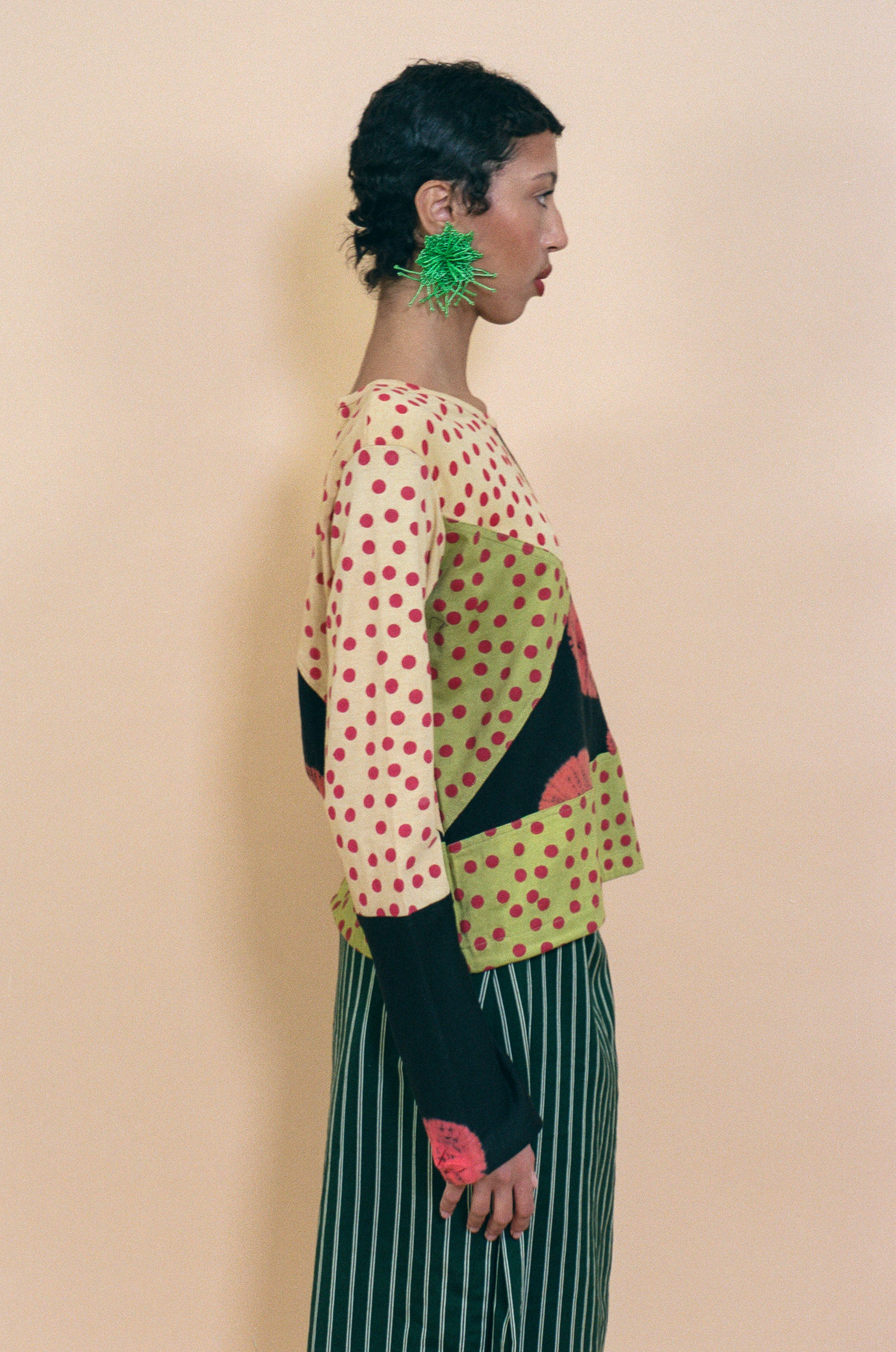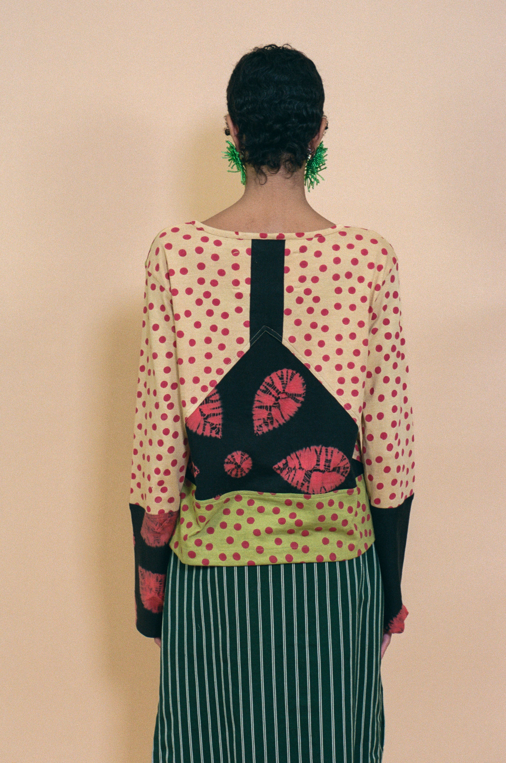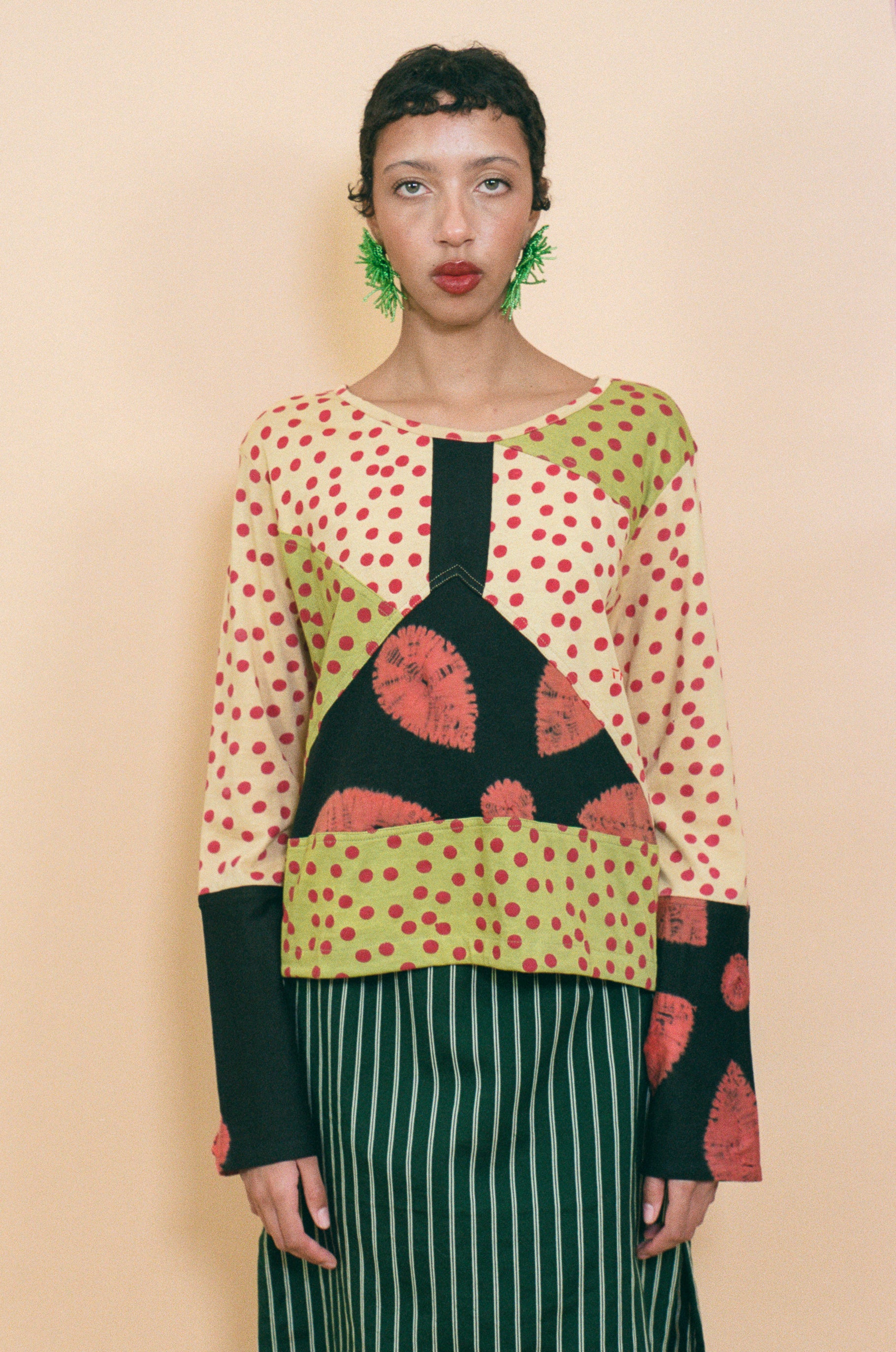 Boxy fitted long sleeve crew neck top in organic cotton jersey knit patchwork. Features various techniques adorning the cream coloured base and black sleeves, such as hand block printed red polka dots, bandhej tie dye, and metal kasab hand embroidery. Classic cut making it feel like a piece already in your wardrobe, but that much more special.
