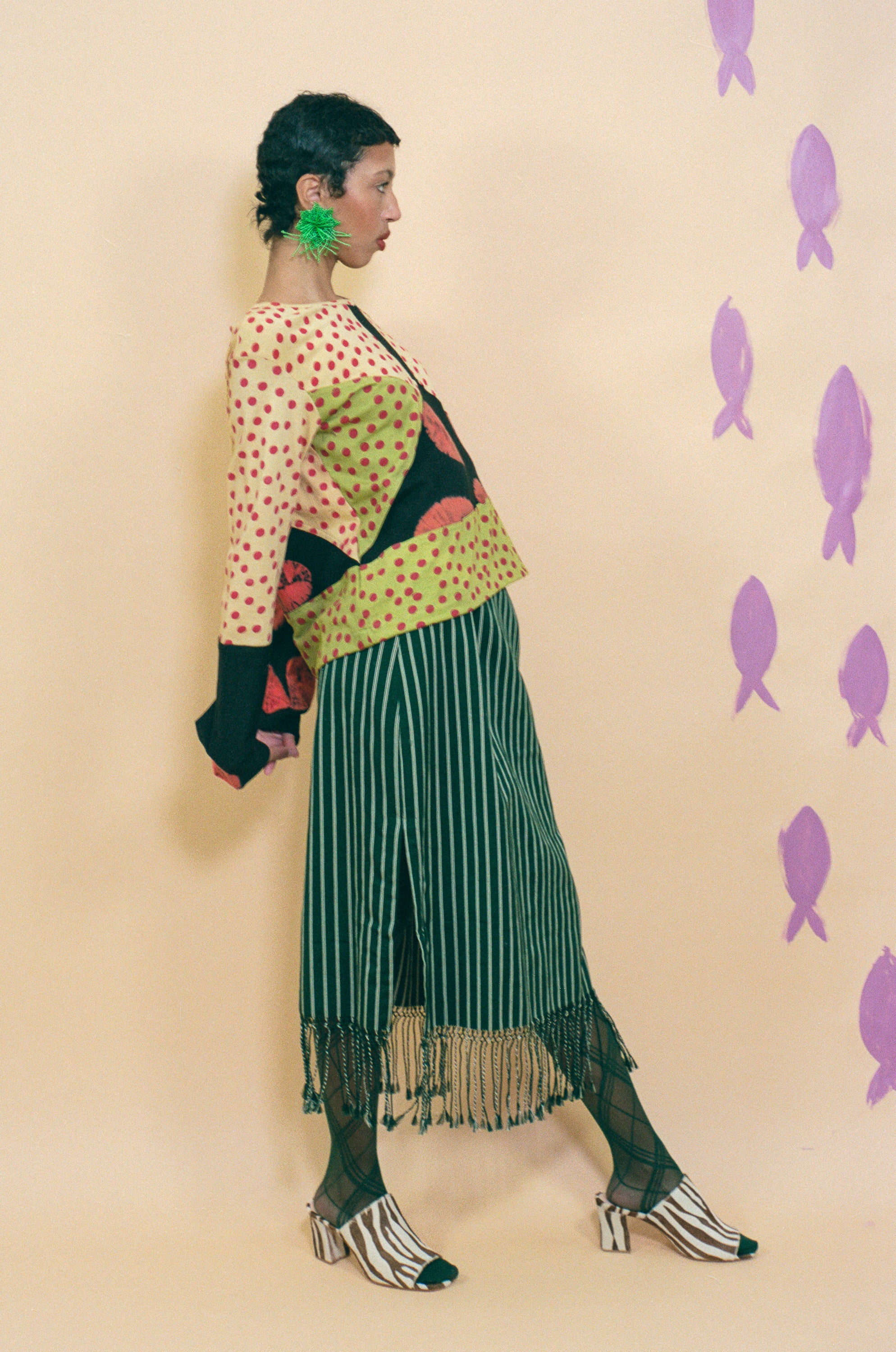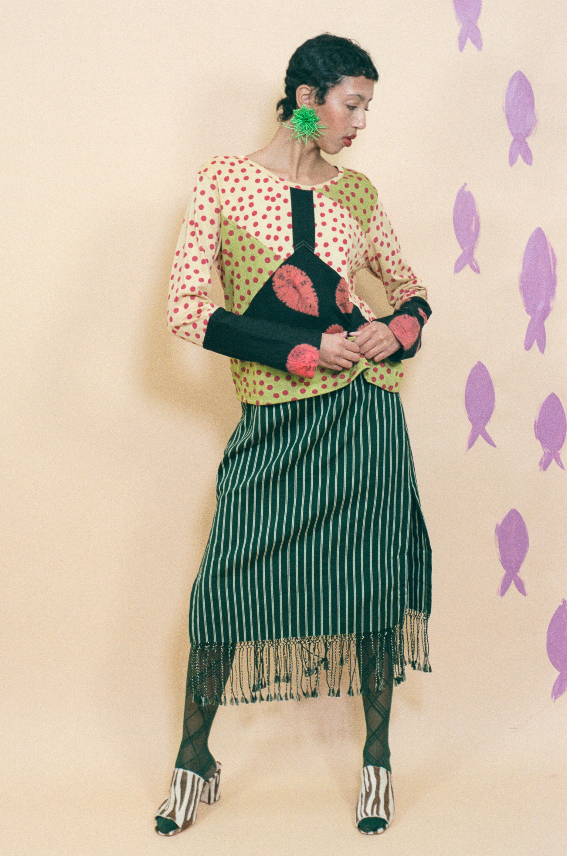 Maya is 5'10 and a size extra small, and wears size small with the Fringe Midi Skirt in Dark Green Stripe, Penelope Mule in Zebra Ponyhair, and Flower Earrings in Light Green.