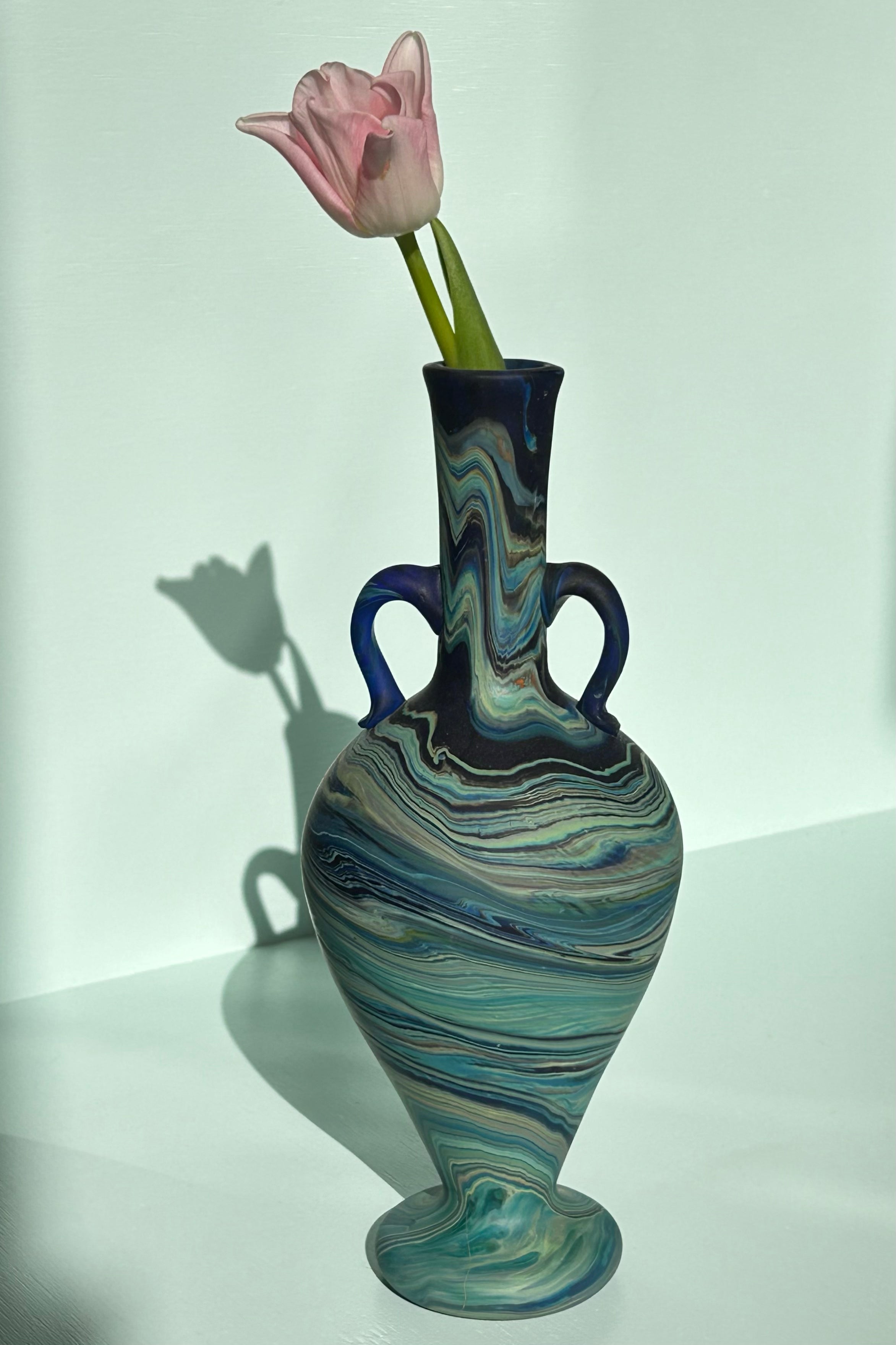 Decorative slender vase with soft curves into a narrow mouth and thin spiral handles on the sides, in blue glass.