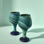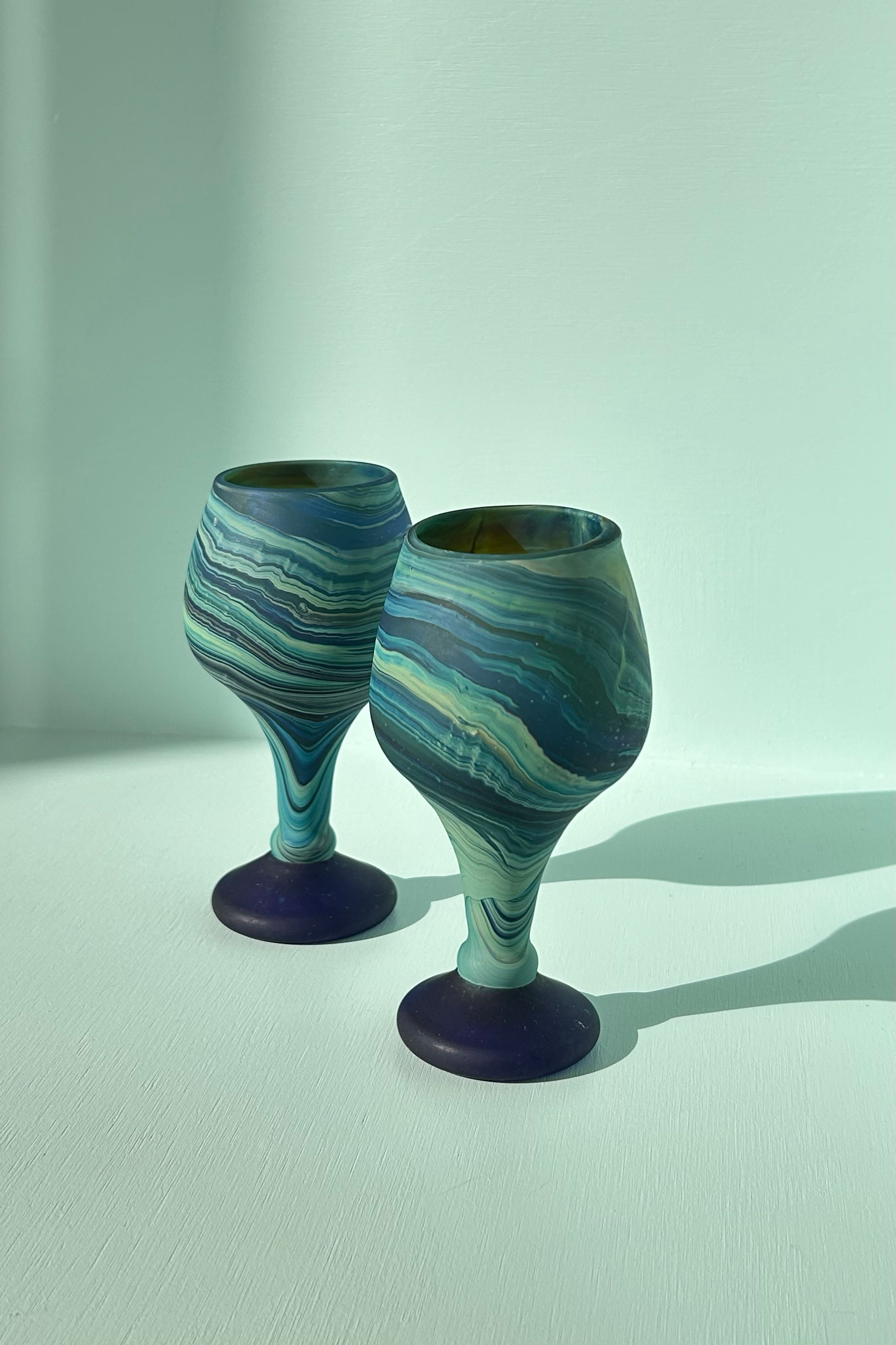 Named for its location, Hebron glass is run by a family of artisans and have been making their trademark marbled vessels in the west bank since 1890. Hebron has been established as a glass making center during roman rule in Palestine.Made with recycled glass and local mineral additives, each piece is entirely unique and has a blue or amber base.