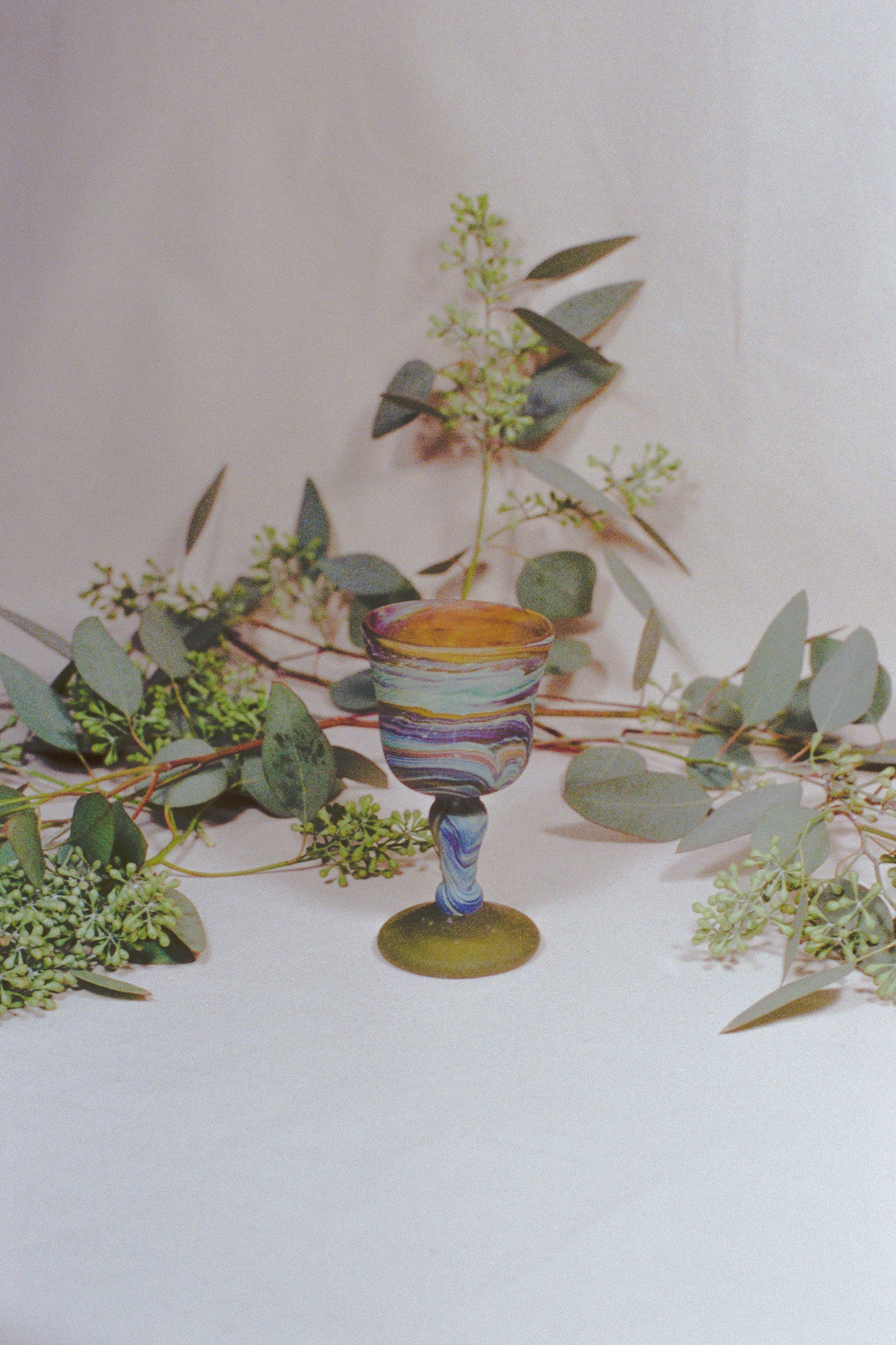 Named for its location, Hebron glass is run by a family of artisans and have been making their trademark marbled vessels in the west bank since 1890. Hebron has been established as a glass making center during roman rule in Palestine.Made with recycled glass and local mineral additives, each piece is entirely unique and has a blue or amber base.
