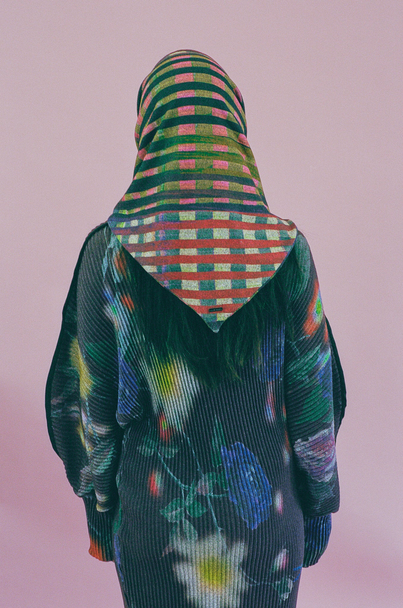 Knitted capelet style scarf in hues of pink, red, green, and navy plaid, held together by a silver chrome heart shaped button for closure. Triangular in shape, the Frida Scarf can be styled around your head, hugging your shoulders, across the neck, as a skirt addition overtop of bottoms. A striking layering piece for the fall season.