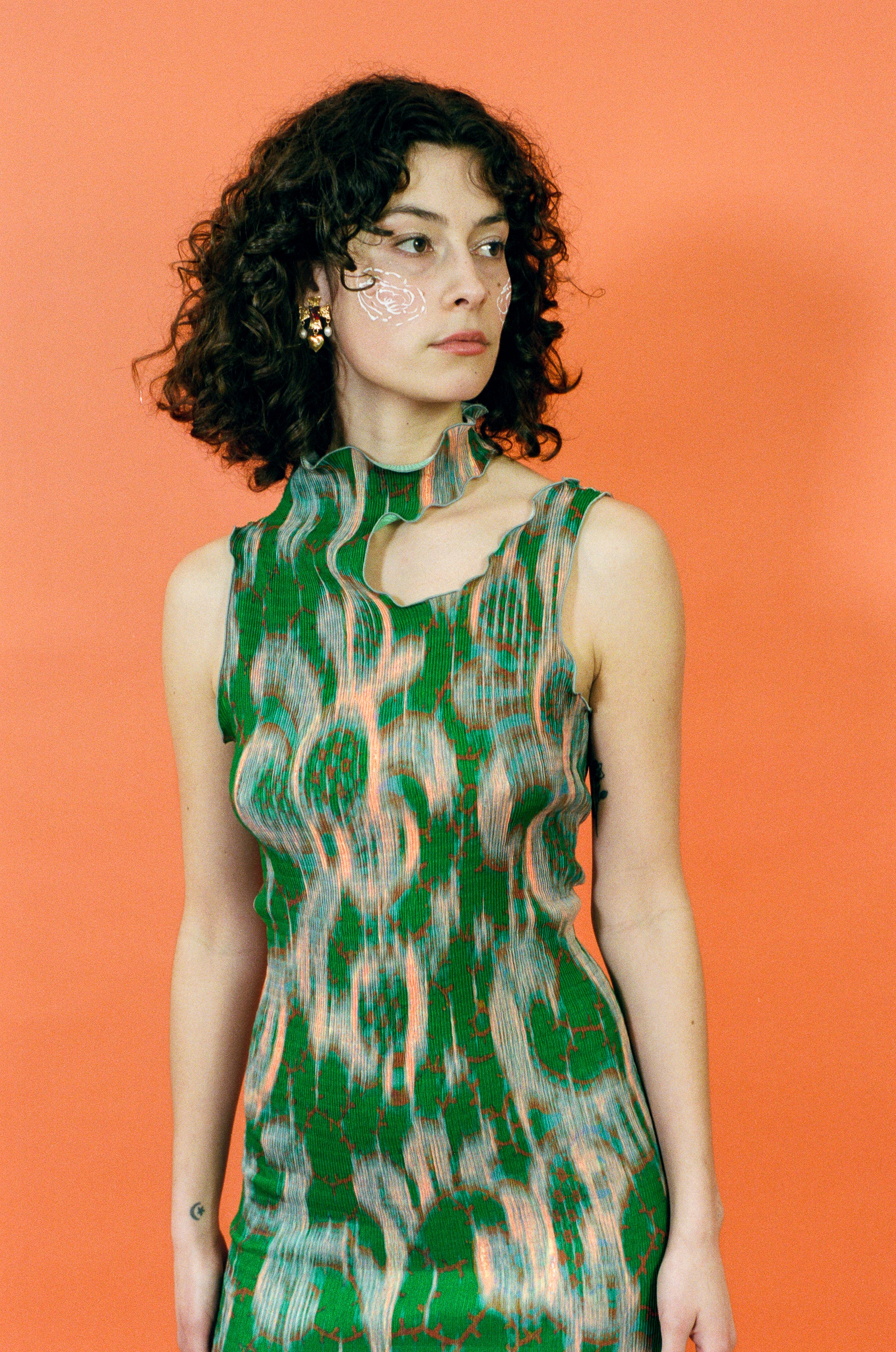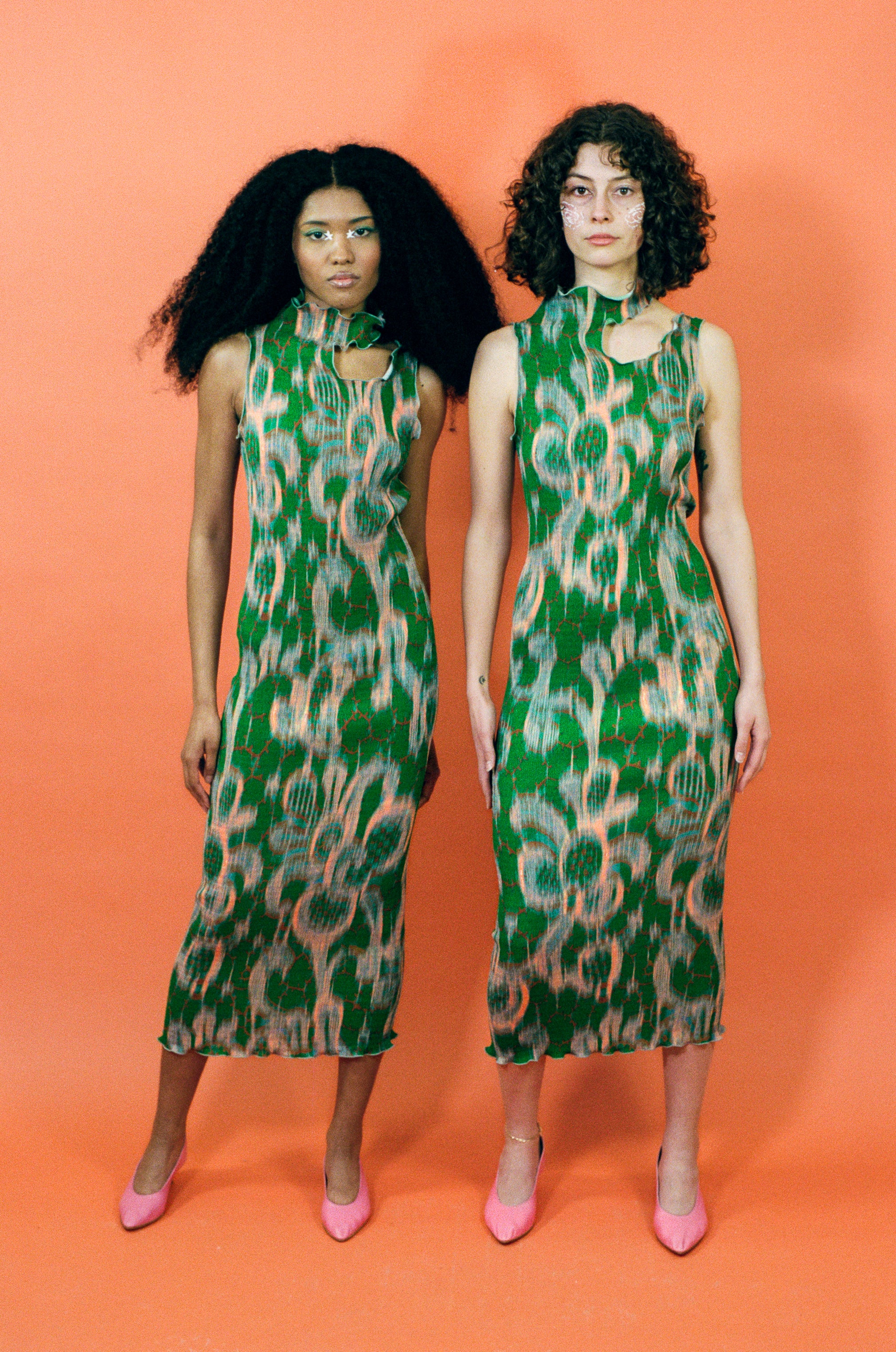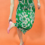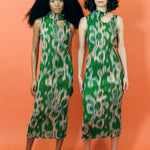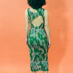 Sleeveless smock pleated midi dress with a mock neck, slightly separated shoulder cut out, organically shaped circle cut out in the back, and lettuce hem detailing. Fitted silhouette without constriction, while maintaining an intentional structure that Julia Heuer's designs are iconically known for. Featured in kelly green with peach, red, and grey patterning throughout.