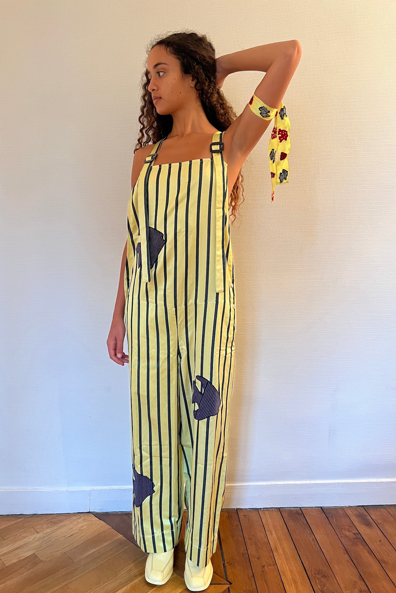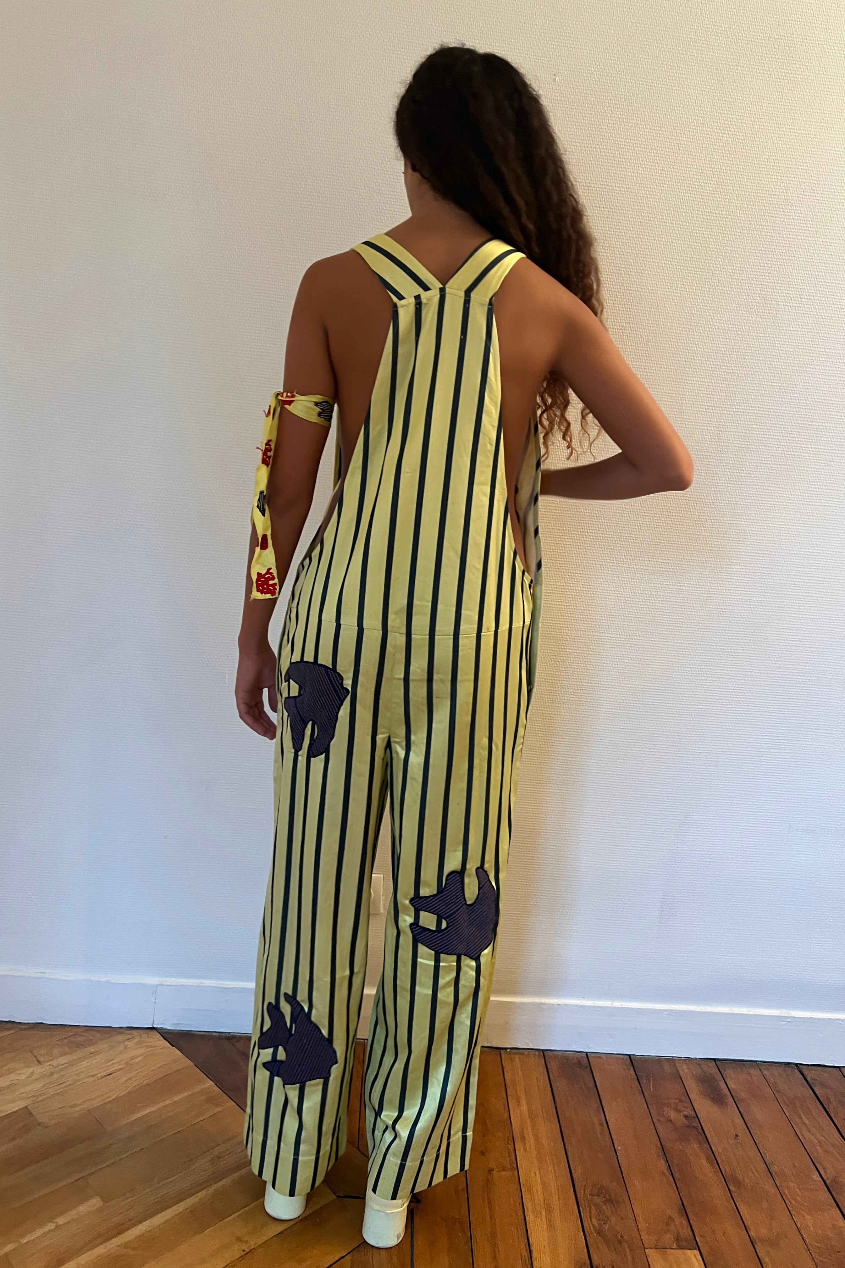 OVERALL IN LEMON STRIPE WITH FISH APPLIQUÉ