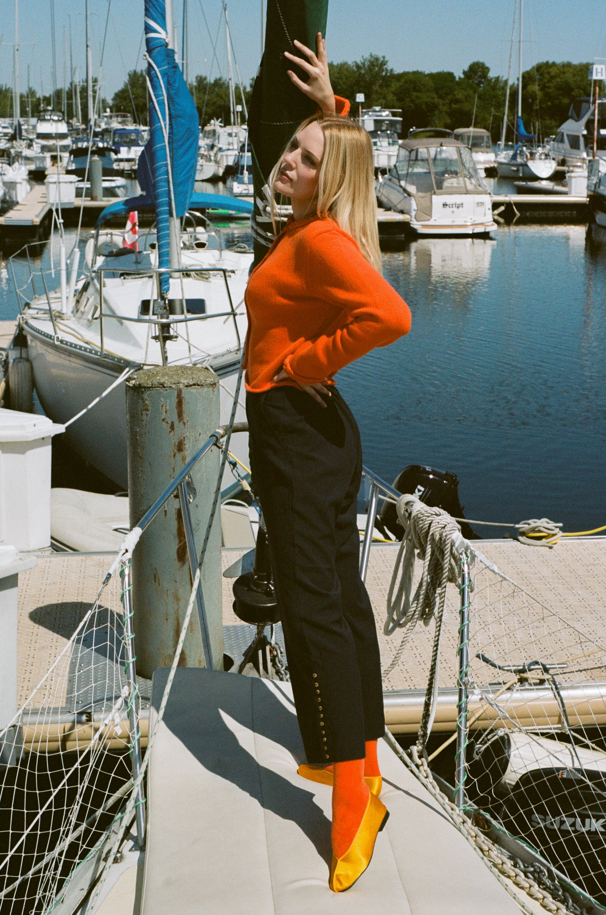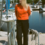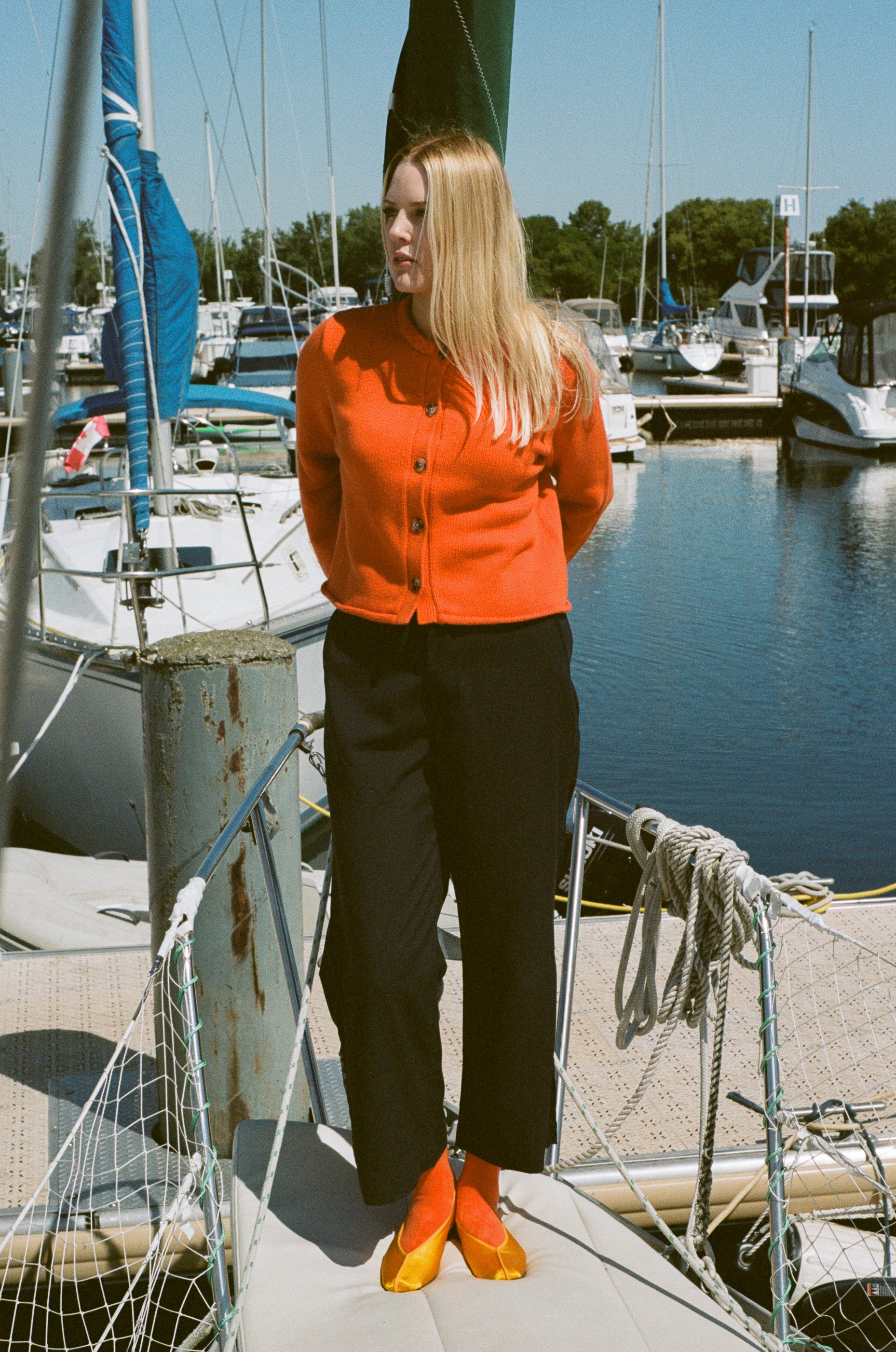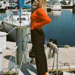 Talvi is 5'10 and a size medium, and wears size medium with the Salima Trousers in Navy and Satin Theatre Slipper in Yellow.