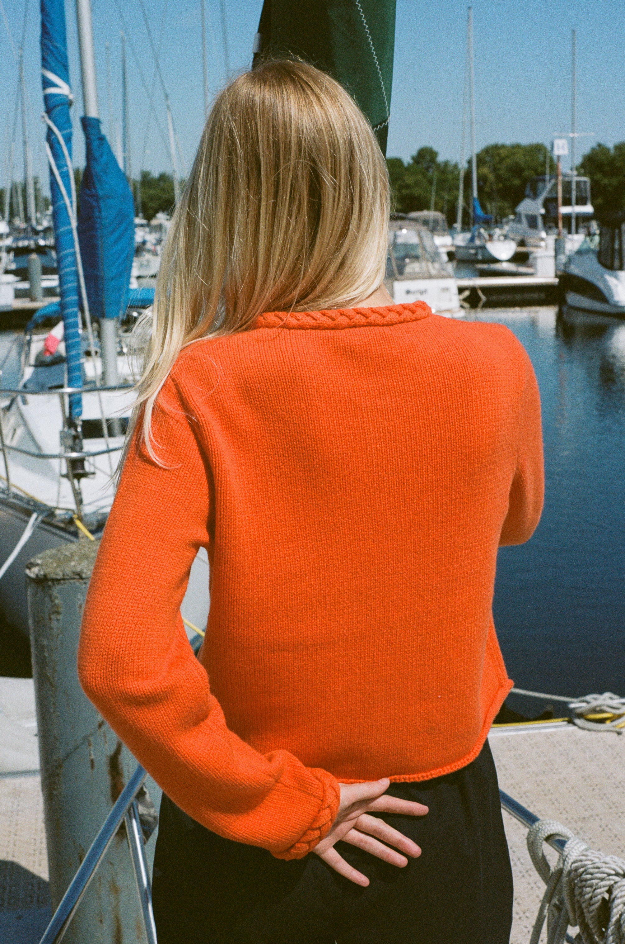 Wool blend tortoise shell button down cardigan in orange featuring chunky braided trim details on the neckline and sleeves. Relaxed fit making this sweater perfect to throw on when you want to feel cozy but still chic, which is what Ciao Lucia knits are all about.