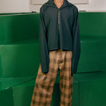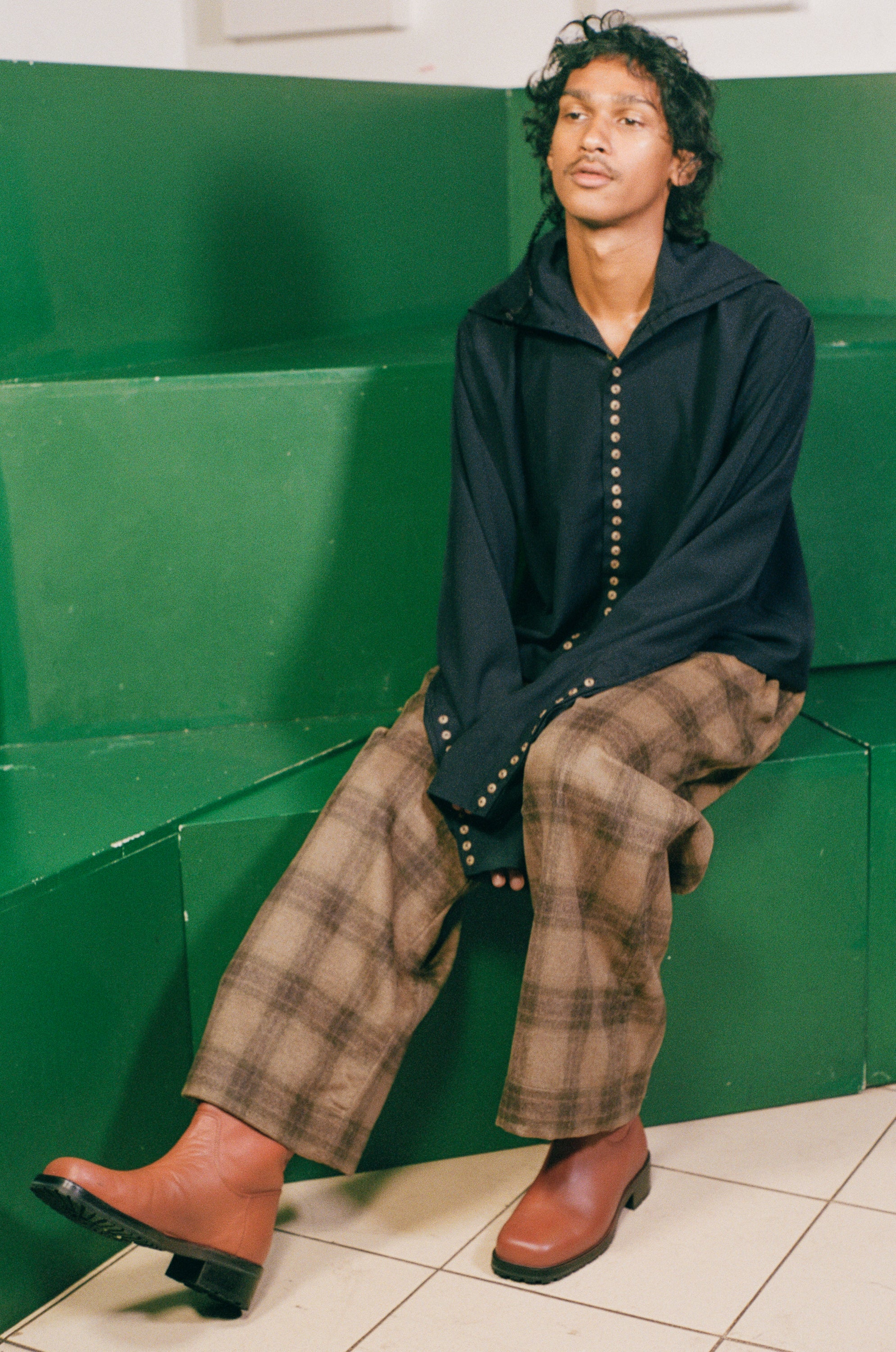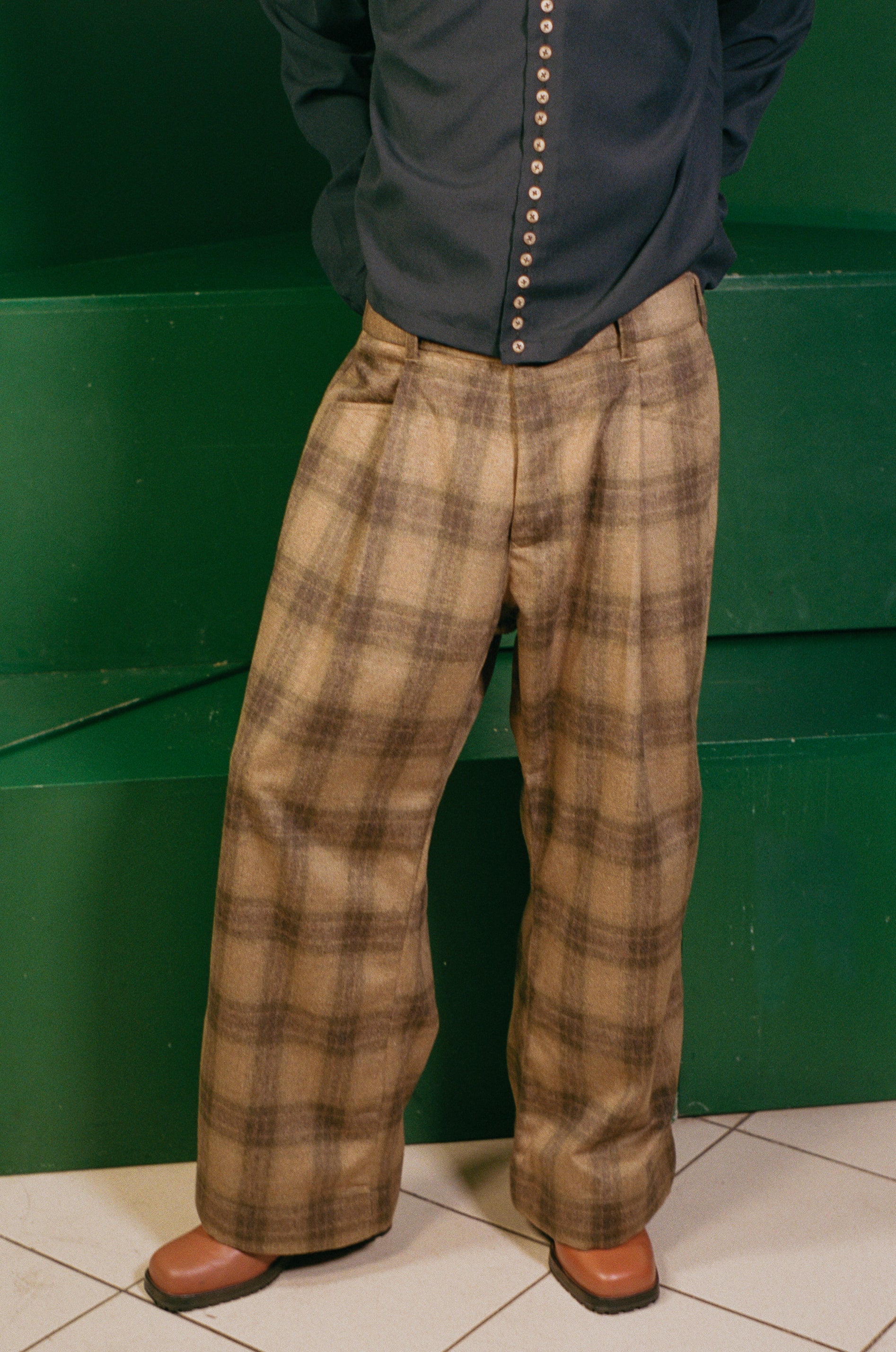 Straight cut and draped wool trousers in beautiful shades of warm and dark brown plaid, lined with light brown cotton. Inner hidden button up front with a stand out button closure at the top, in contrast with an elasticated waistband around the back. Belt loops and side slit pockets.