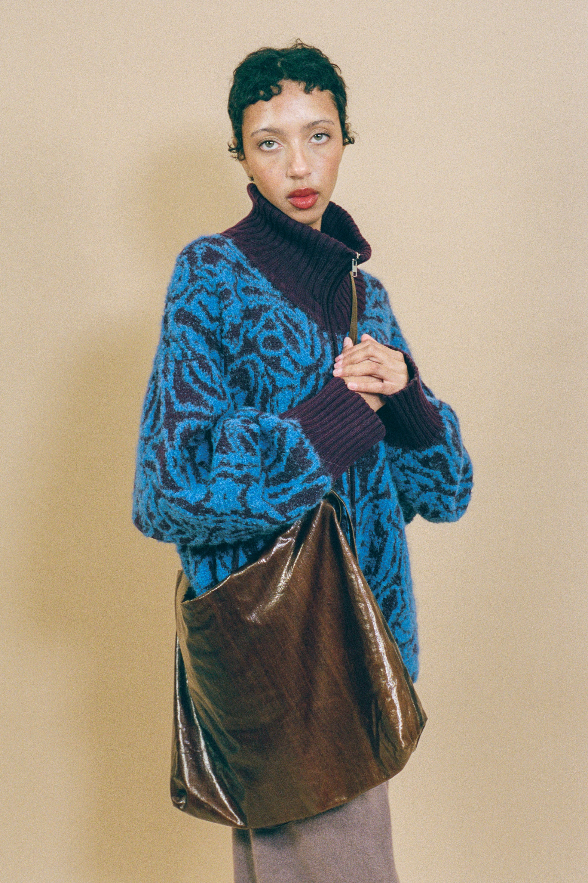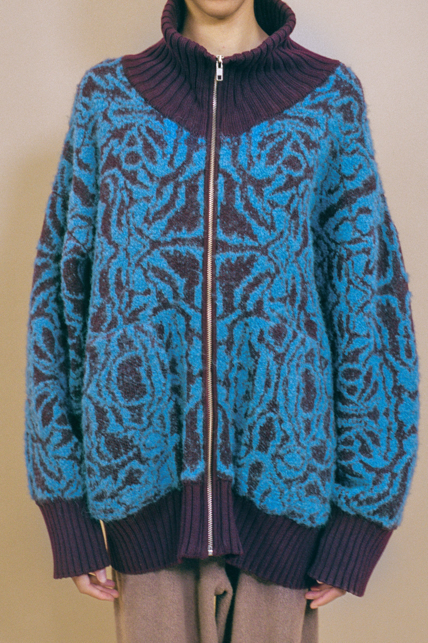 ZIPPER CARDIGAN IN BLUE/BURGUNDY JACQUARD