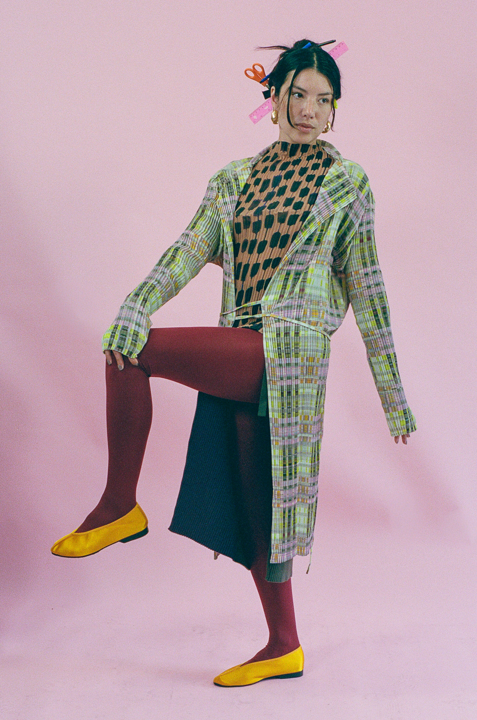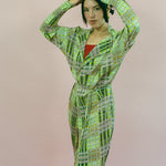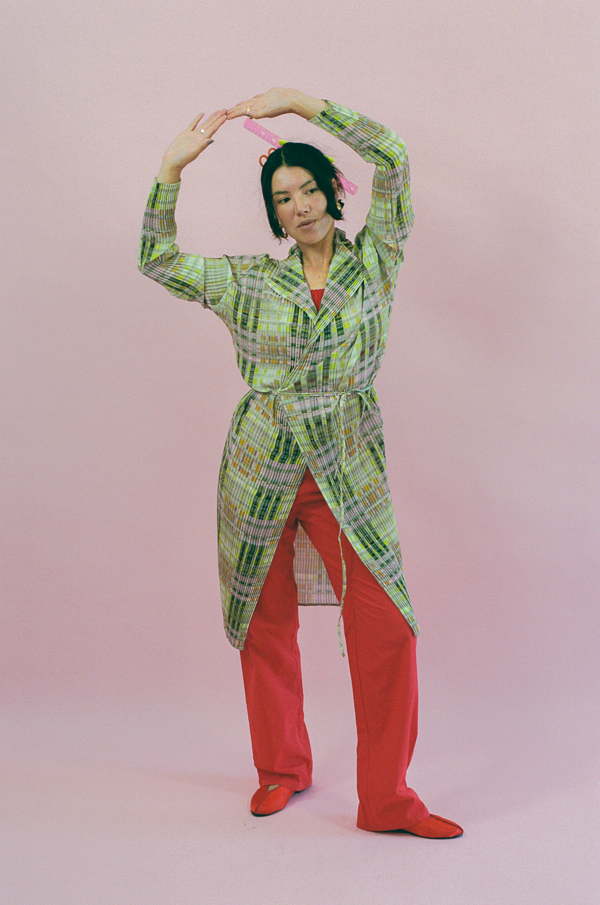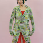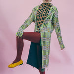 Long sleeved mid length cardigan jacket in acid green/pink/orange plaid. Features long string ties at the waist for closure, allowing the wearer to be covered if wanting to wrap into a top, or can be worn open as wide as enjoyed. Made of a lightweight polyester chiffon that feels like silk and ensures the integrity of the print and pleat while remaining light as air.