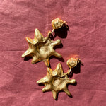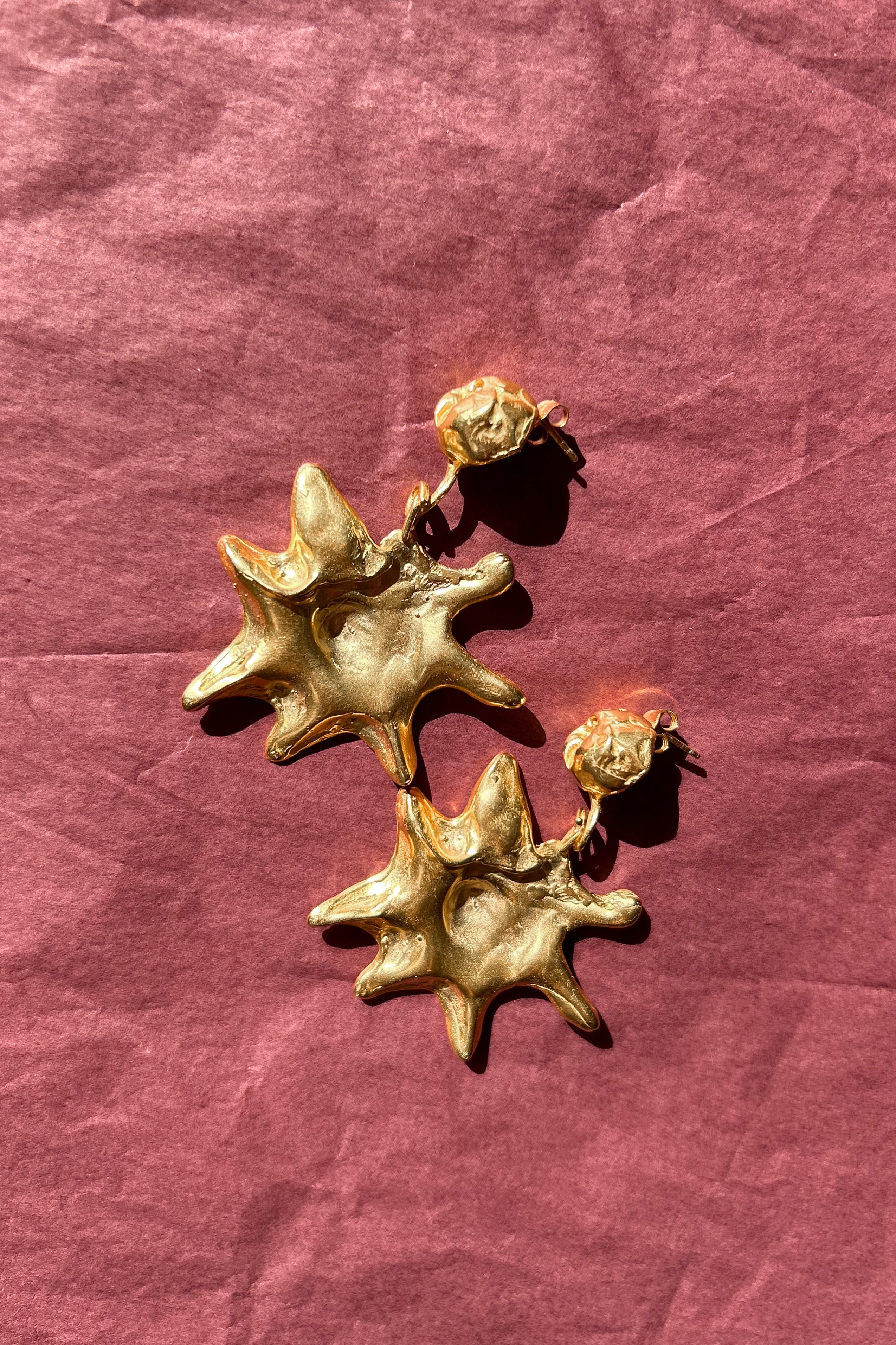 Pertaining to celestial objects, the Astro Earrings are a pair of large, textured star shaped pendants hanging from a large circular stud, in gold plated brass. Post back closure. Each wear takes place somewhere outside of the earth's atmosphere, discover your fantasy through them.