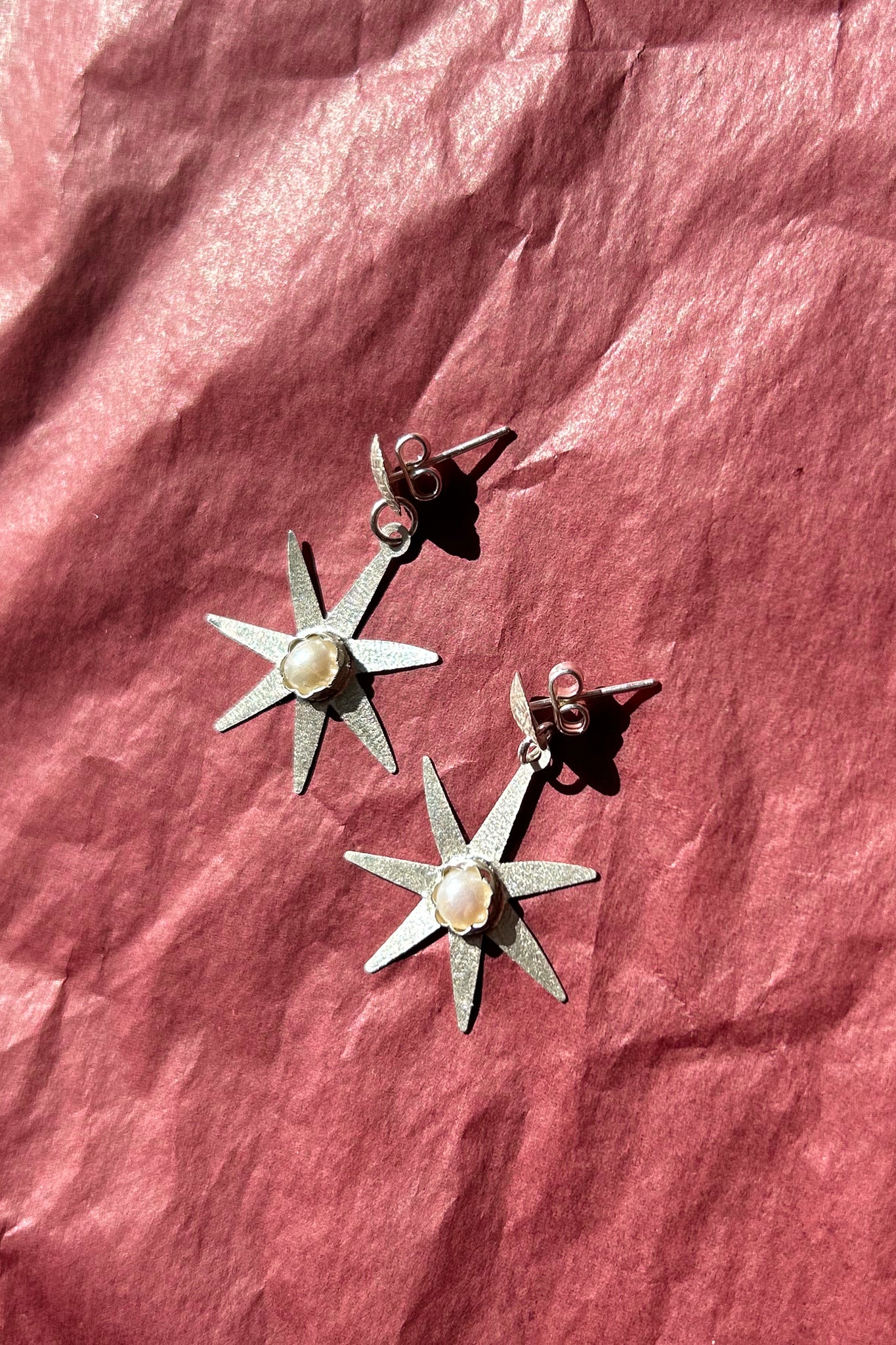Pair of silver circular stud earrings with flower/star shaped pendants hanging down, and a hammered in pearl at the center of the shape. Post back closure. Designed by Après Ski and made by craftsmen who work gold-plated silver by hand in a traditional way.