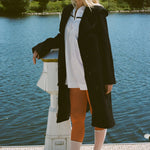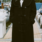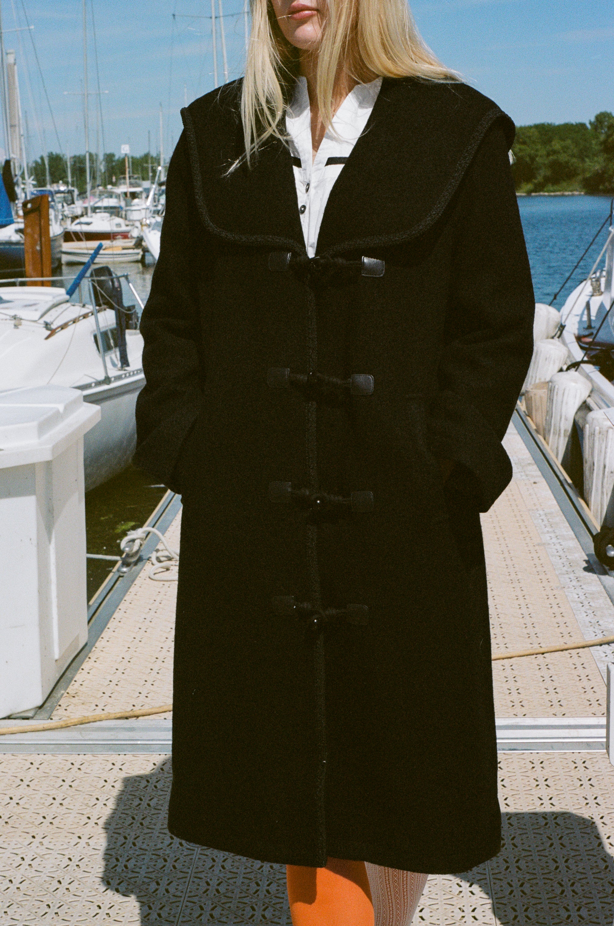 Wide, straight cut, full length wool coat in black with a capelet around and across the shoulder to chest, and side welt pockets. Roomy with enough space to layer underneath while keeping the structure of the shape. Grey/brown cheetah stripe print on the inner lining. Features an array of details from embroidery along the trims to stand out leather feeling squares on each side, connected in the center by ball in rope loop closures. Your everyday Fall staple but that much more special.