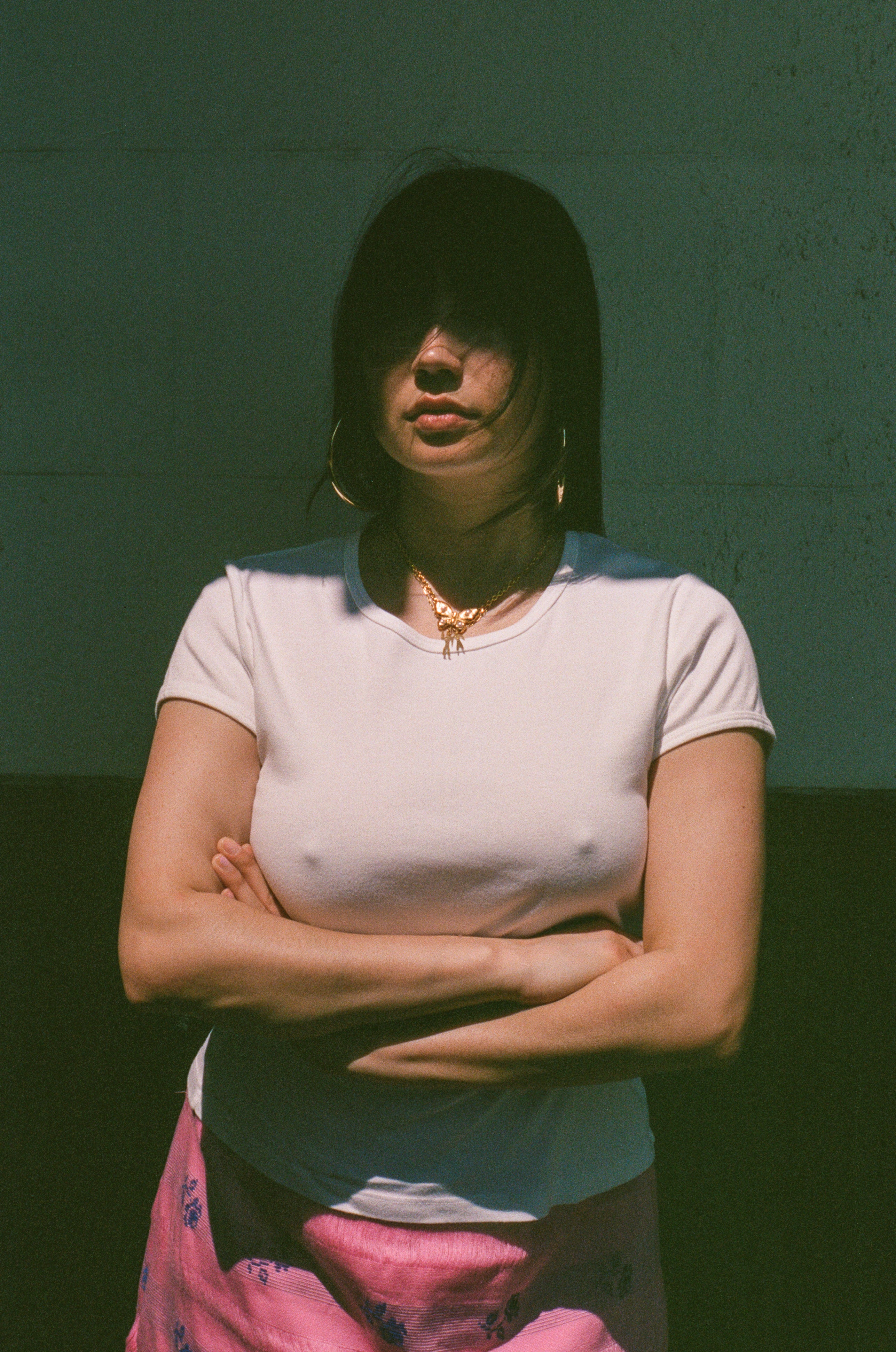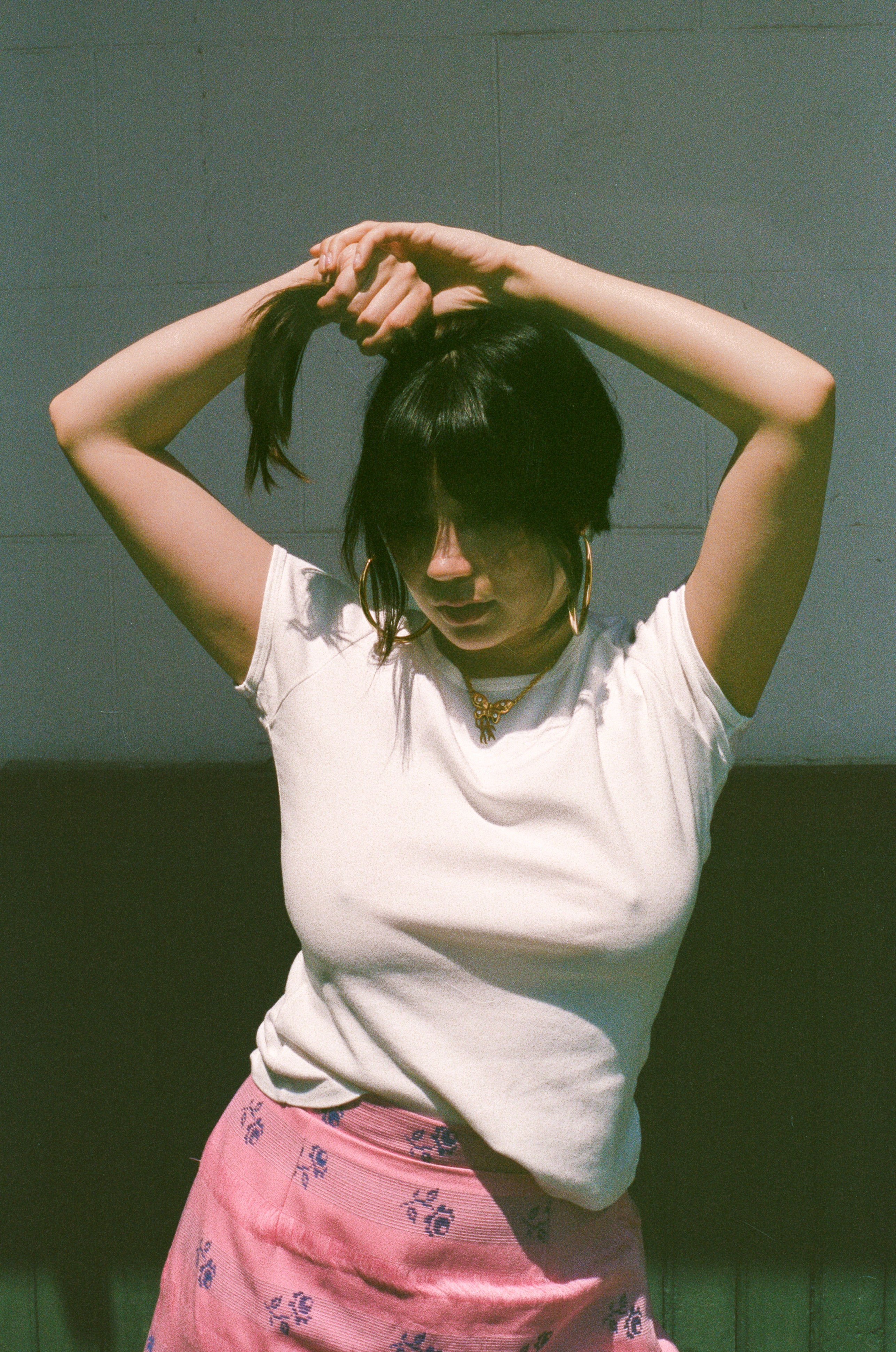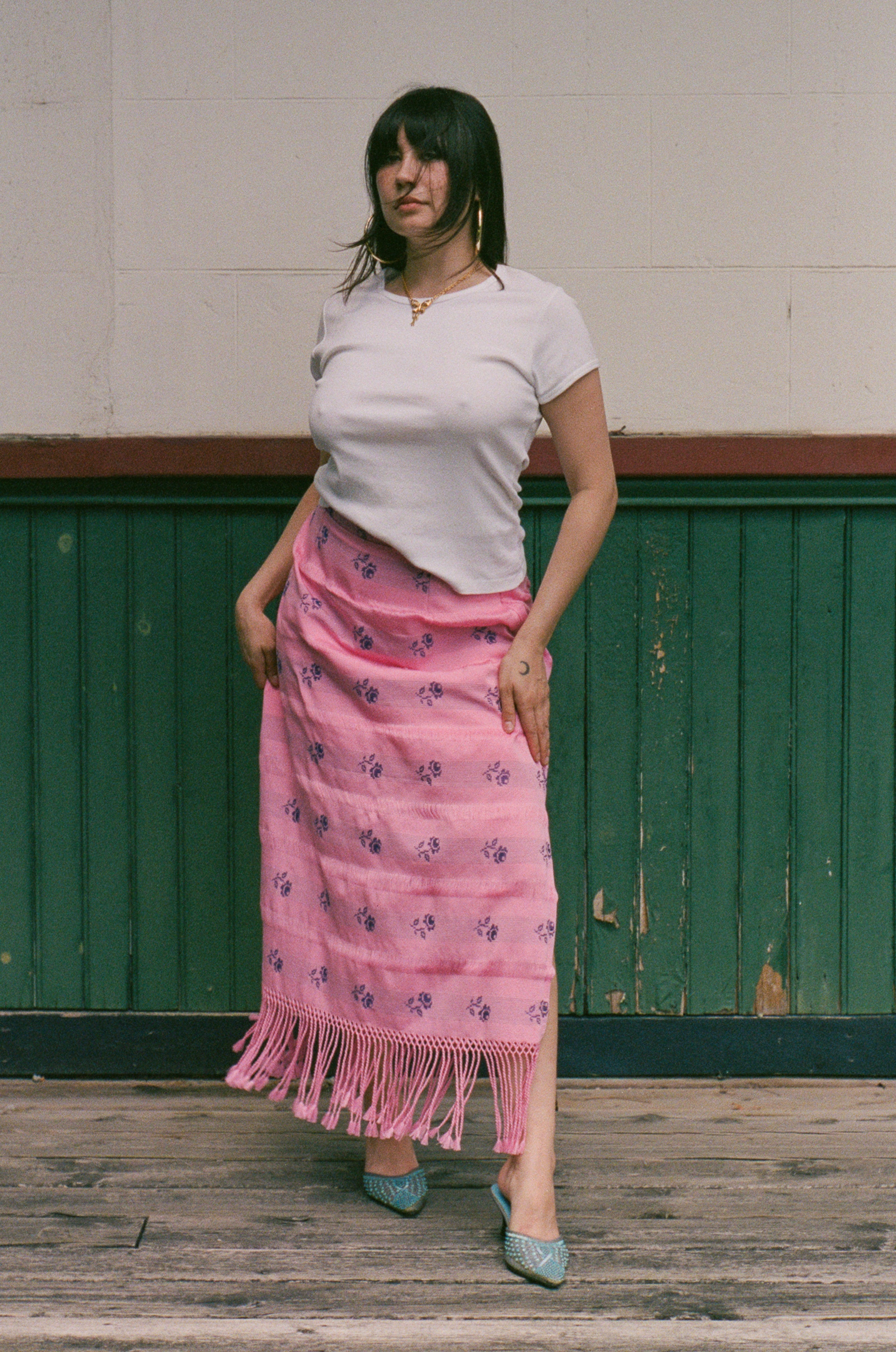 Jenny is 5'2 and a size medium, and wears size medium with the Fringe Midi Skirt in Pink, Butterfly Tropicana Necklace in Gold with Pearls, and Mercurio Y Odin Pendant. Inez is 5'9 and a size medium, and wears size medium.