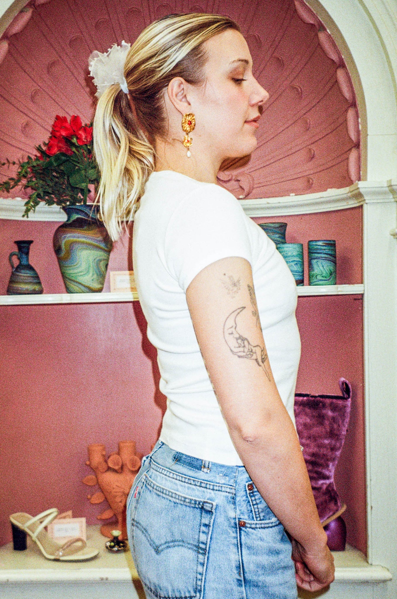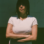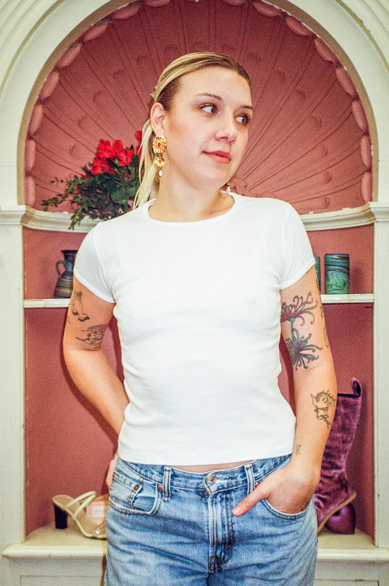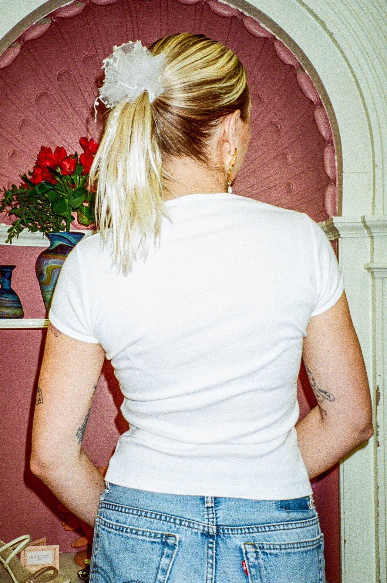 The p e r f e c t Plain White Tee. Super soft short-sleeve baby tee made from cotton baby rib in white. Flattering and form fitting, it's the perfect length to tuck into a high waist, or leave on its own. Everyone needs one of these in their closet.